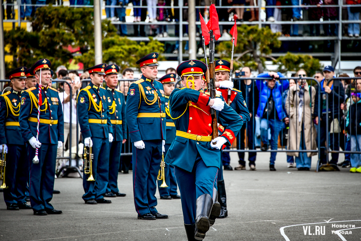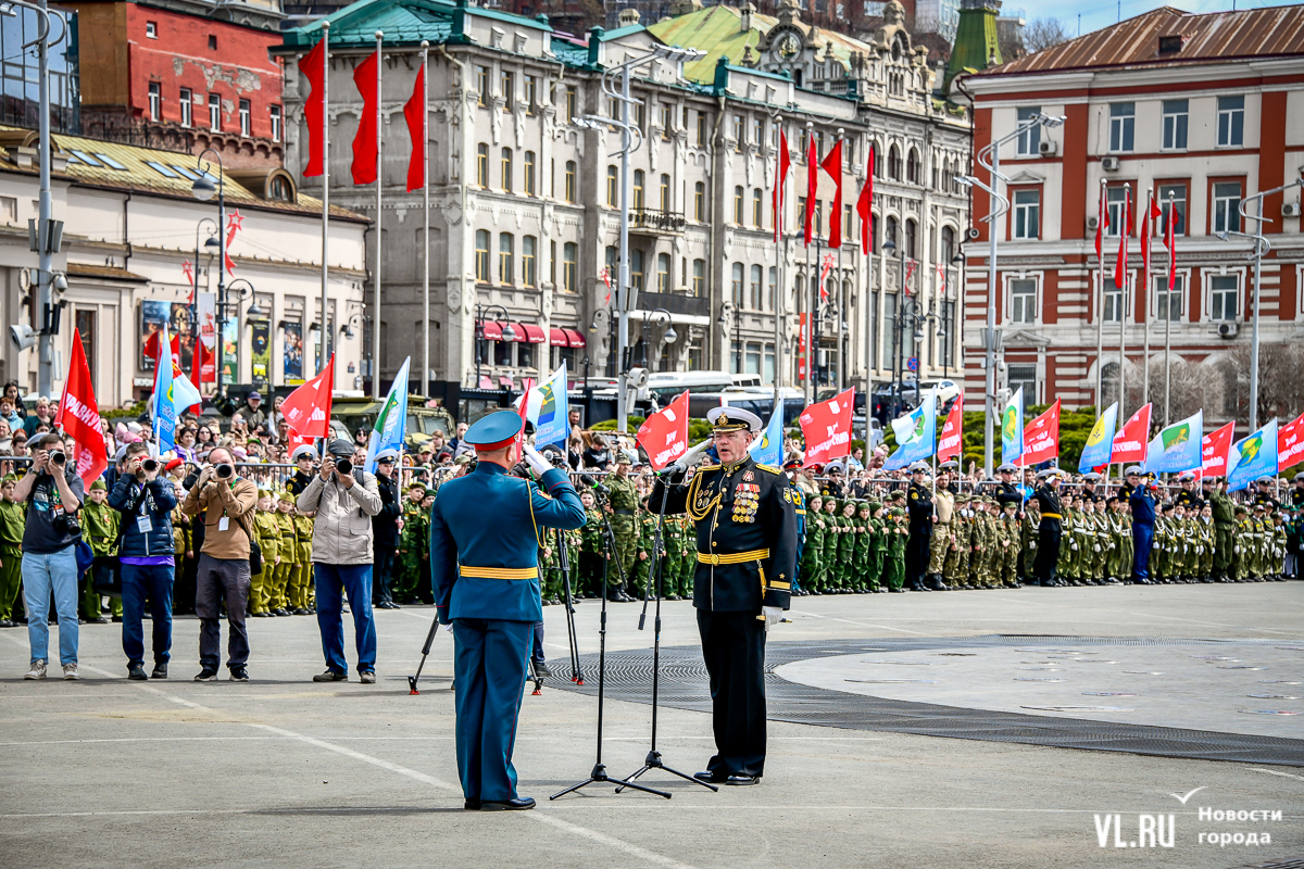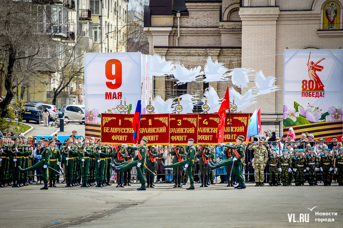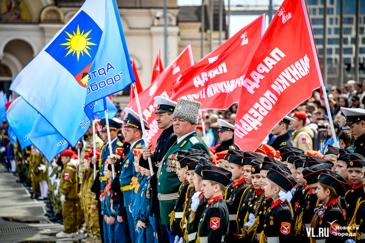«Равнение направо, шагом марш!» – отряд барабанщиков Уссурийского суворовского военного училища задал темп и ритм всем 50 парадным расчётам. На центральную площадь Владивостока вынесли государственный флаг и знамя Победы, макеты штандартов фронтов Великой Отечественной войны. Парад «Правнуки Победы» открыт.