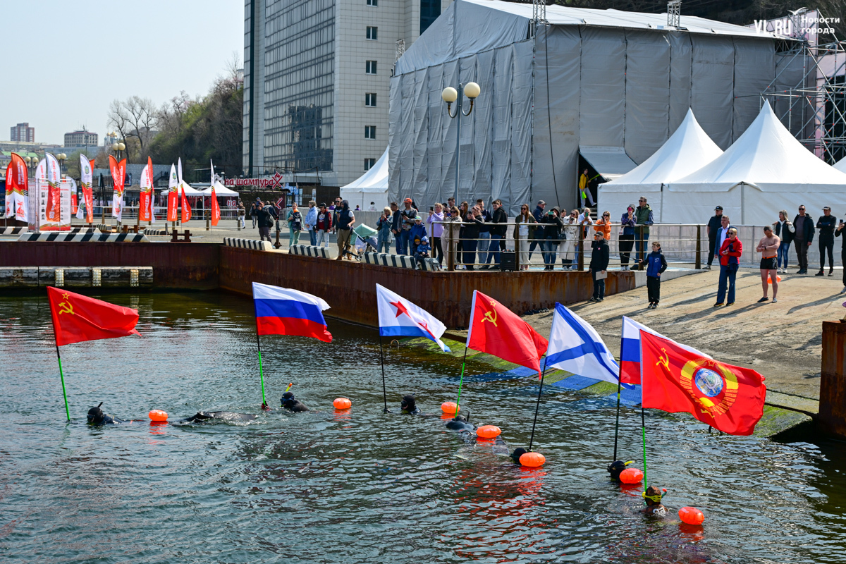 Пловцы встали в строй, их оказалось немногим больше 20 человек, прозвучал гимн Российской Федерации, каждый получил свой флаг, и под песню «День Победы» колонна начала выстраиваться. Открывал шествие российский триколор, за ним над гладью Амурского залива развевалось Знамя Победы. Пловцы стройным рядом, временами размахивая флагами, прошли вдоль специально установленных буйков под «Катюшу» и вернулись на сушу, где их уже ждали восхищённые родственники и случайные зрители, а ещё свежеприготовленная флотская каша.