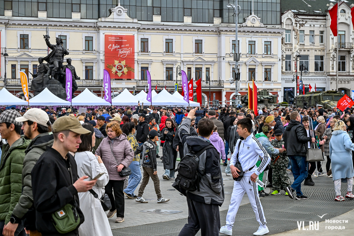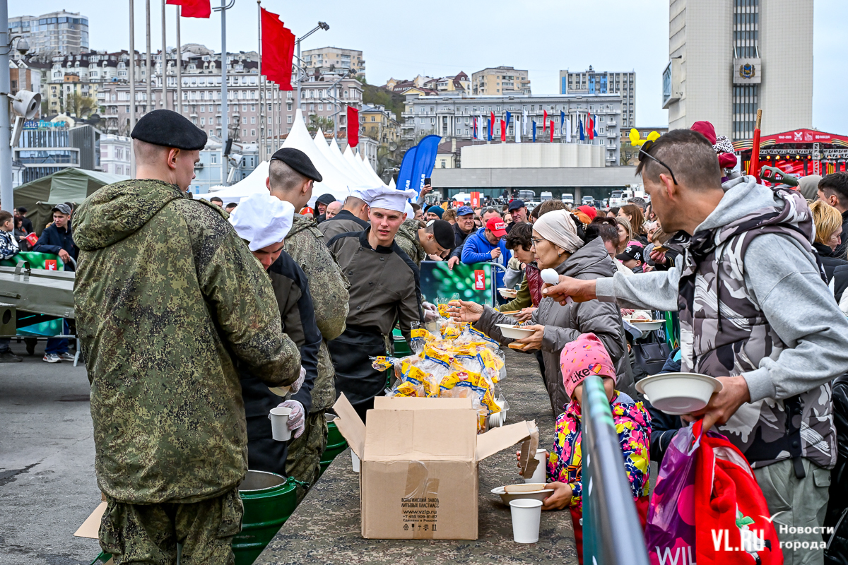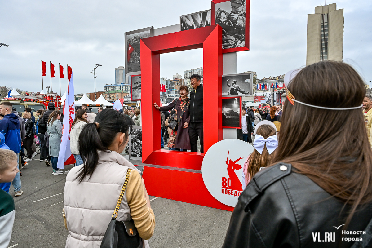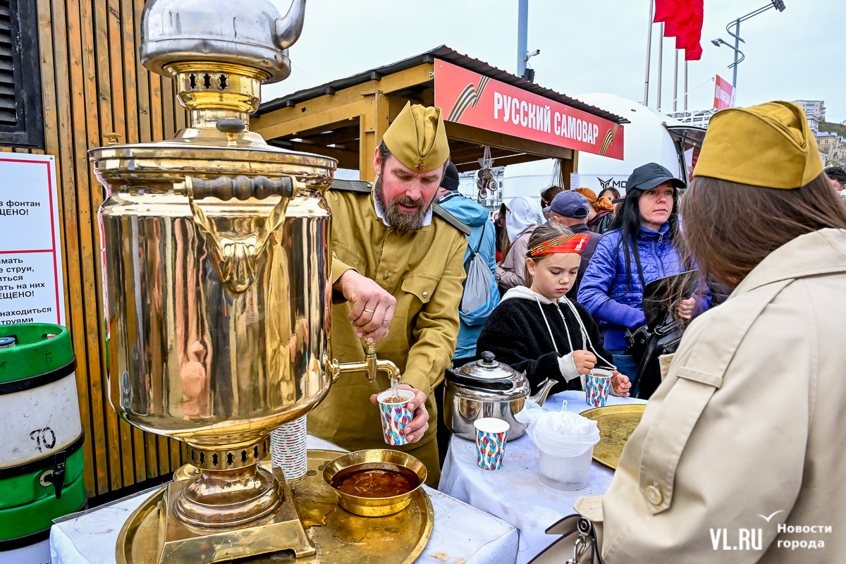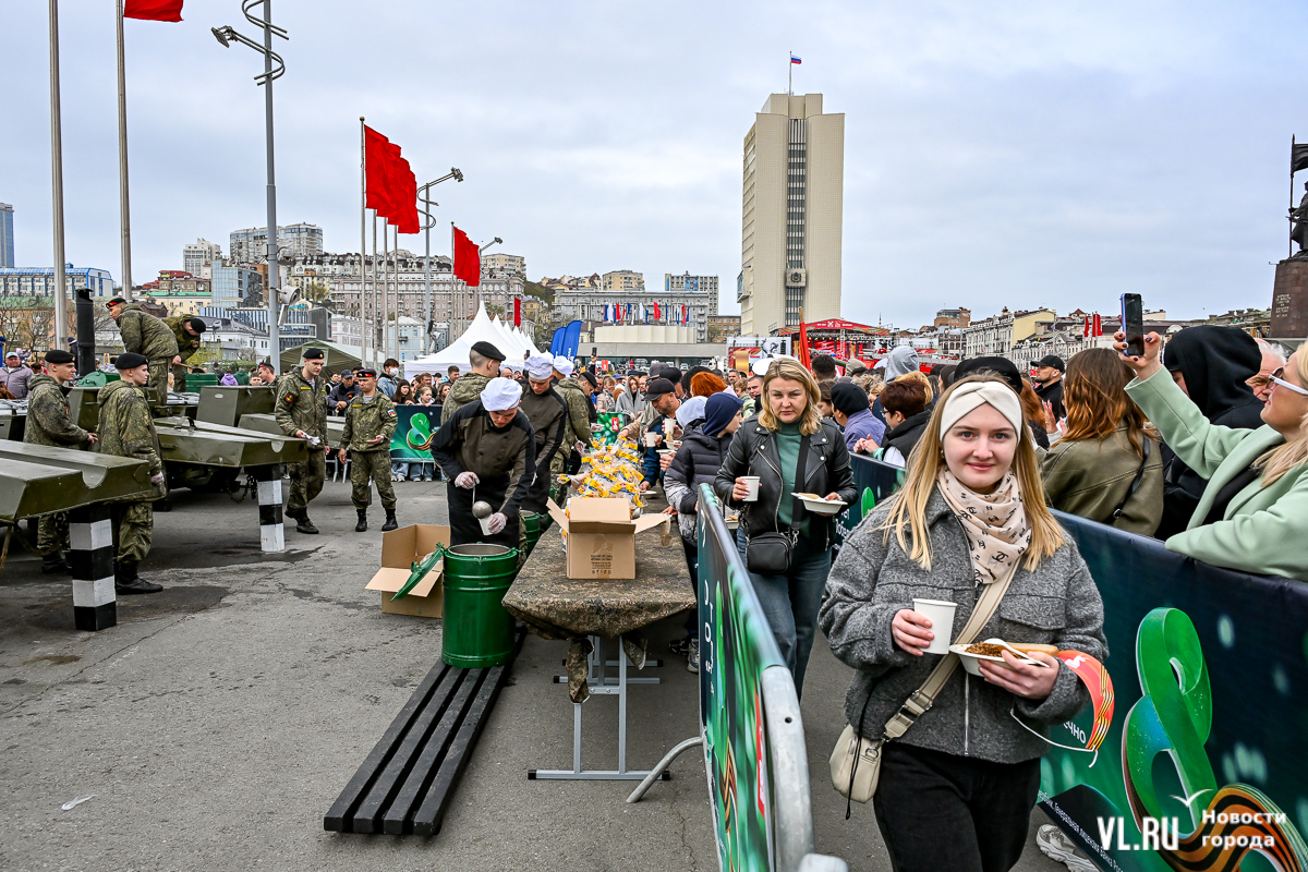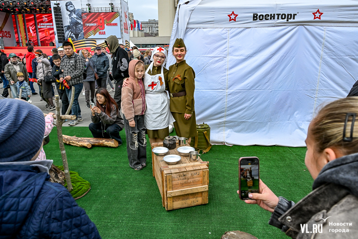 Во Владивостоке празднуют 9 Мая на центральной площади города, которую в этом году подготовили действительно масштабно и интересно. Люди начали заполнять её сразу после парада, выстраиваясь в очереди к разным интерактивным зонам: от настольных игр до авиационной техники. Среди тематических фотозон особенно выделяются парящие в небе белые журавли. А самая длинная очередь выстроилась к бесплатной солдатской каше. Но если лень стоять, можно купить её за 300 рублей.