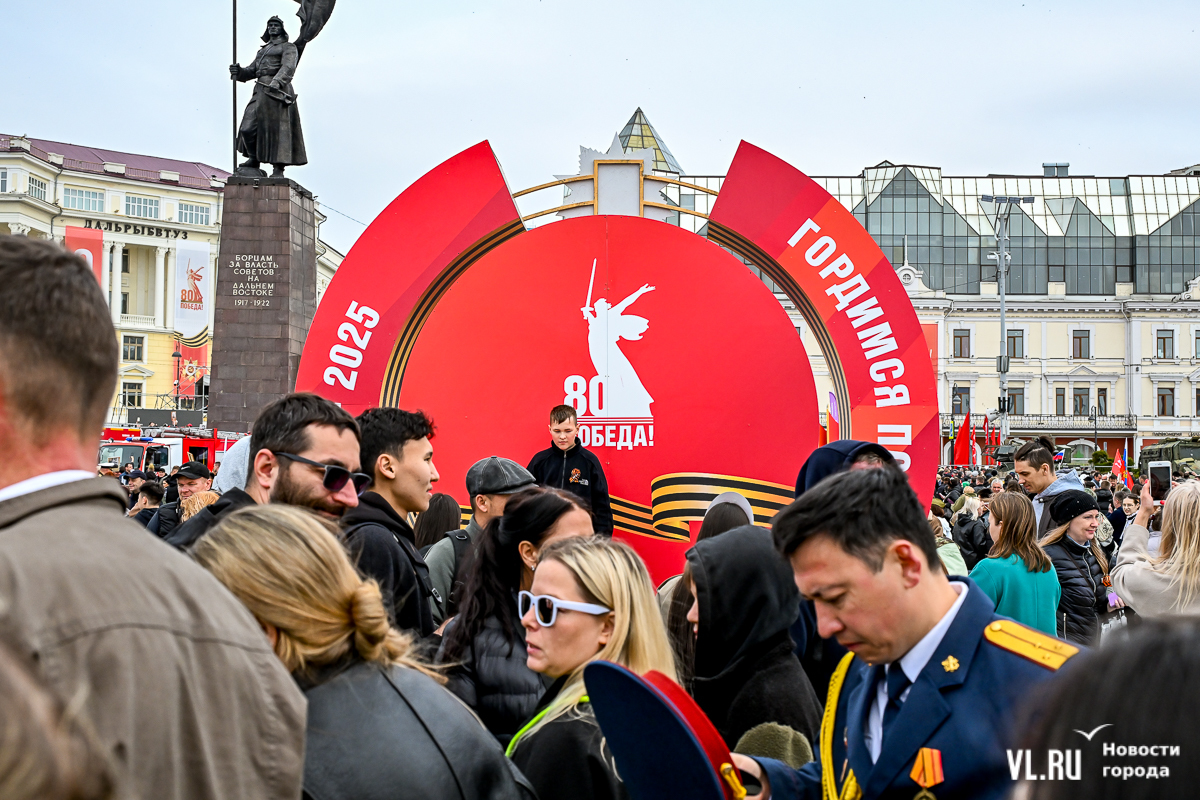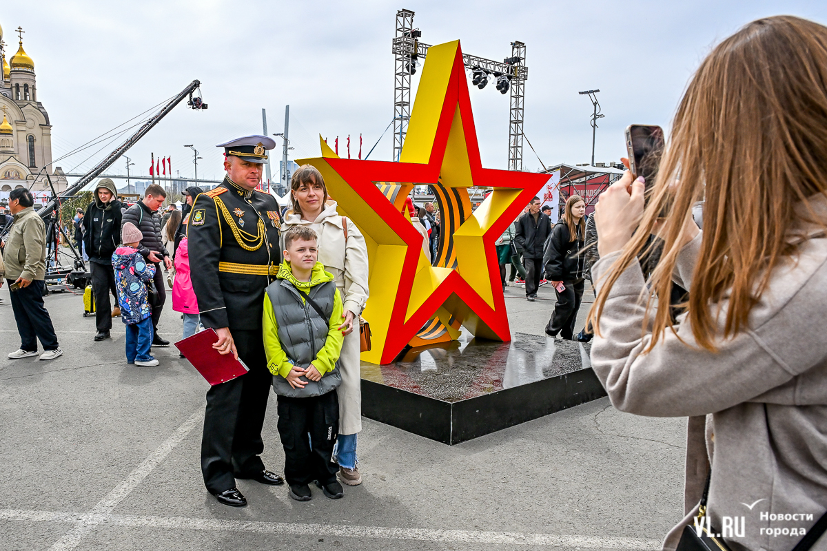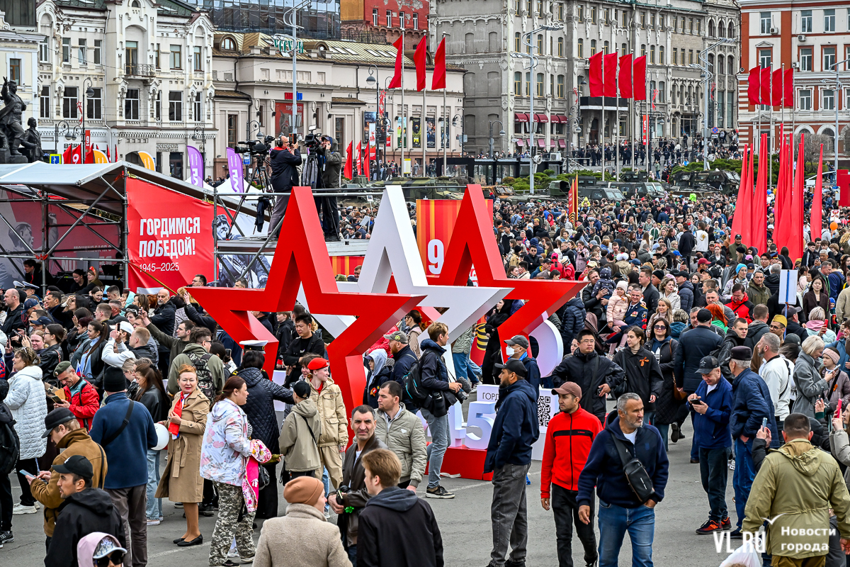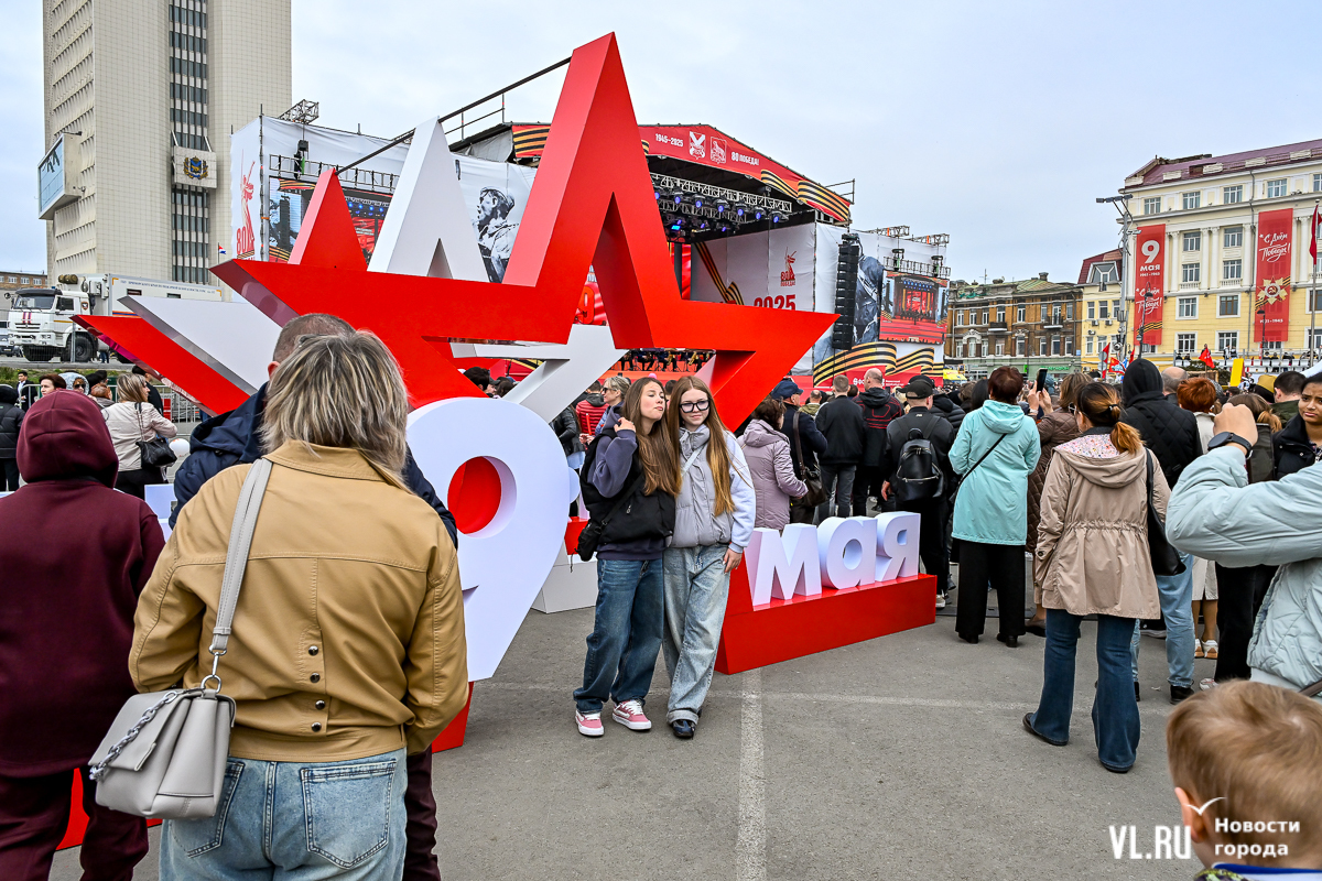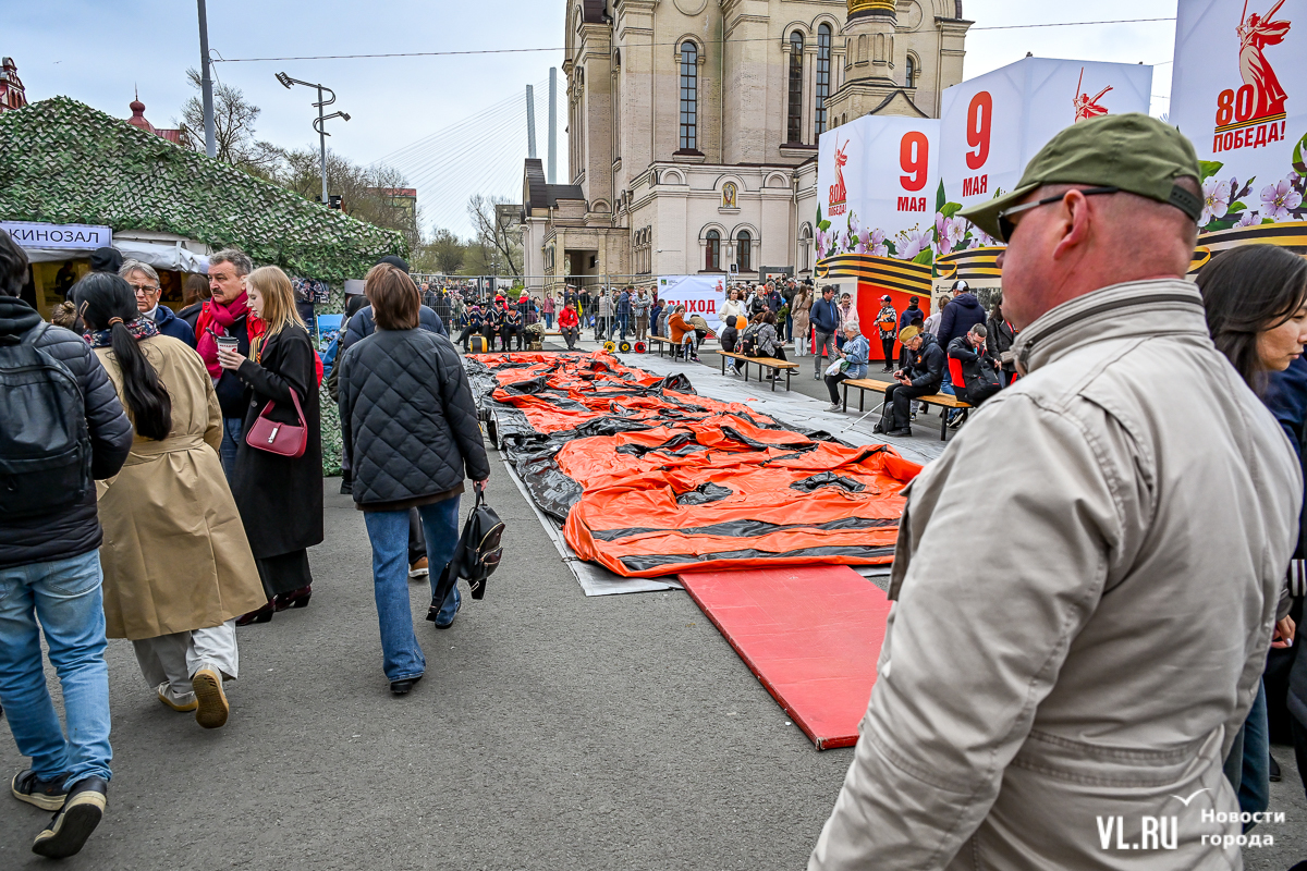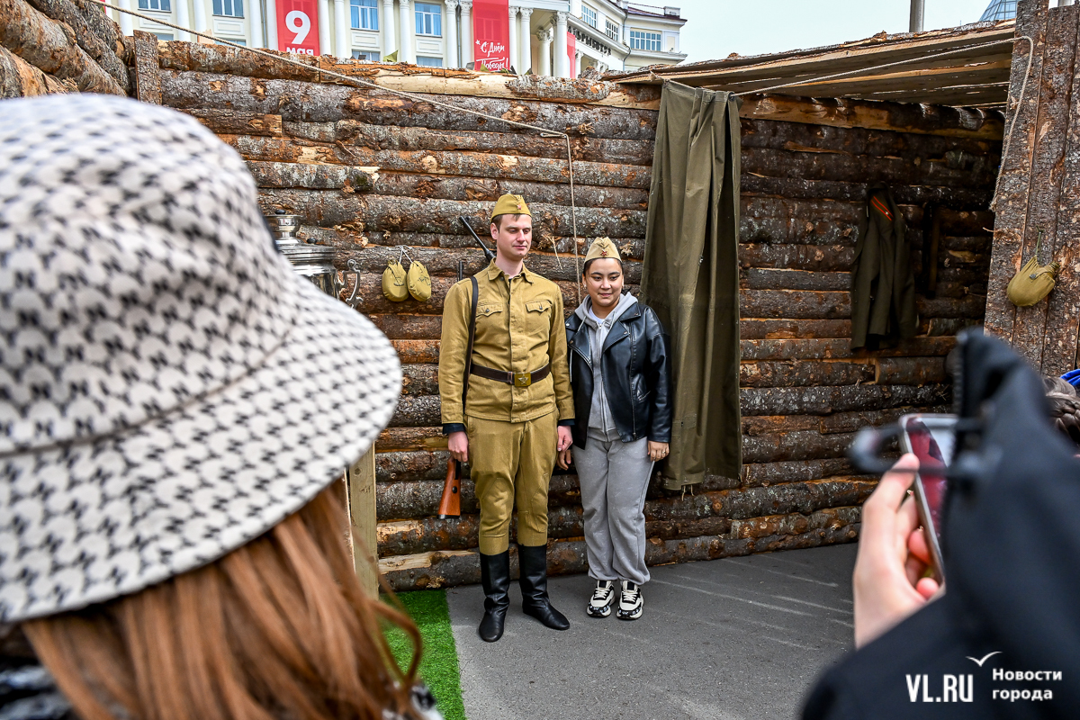 Во Владивостоке празднуют 9 Мая на центральной площади города, которую в этом году подготовили действительно масштабно и интересно. Люди начали заполнять её сразу после парада, выстраиваясь в очереди к разным интерактивным зонам: от настольных игр до авиационной техники. Среди тематических фотозон особенно выделяются парящие в небе белые журавли. А самая длинная очередь выстроилась к бесплатной солдатской каше. Но если лень стоять, можно купить её за 300 рублей.