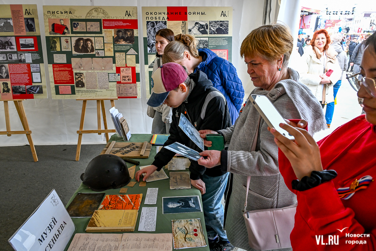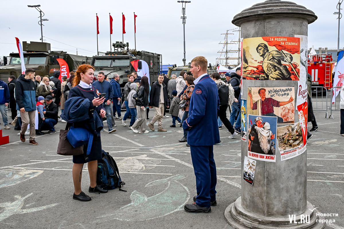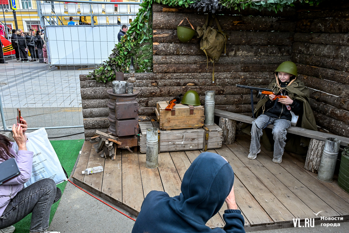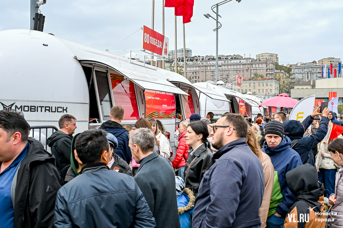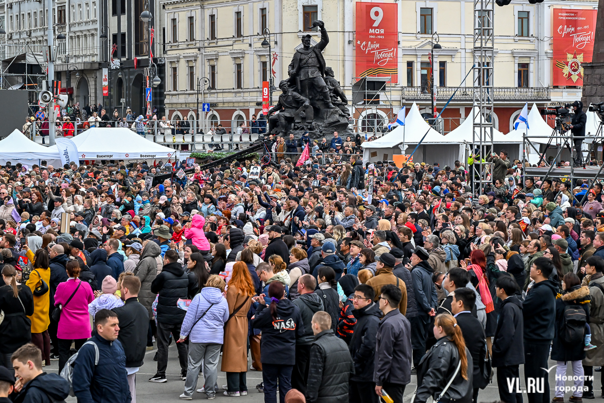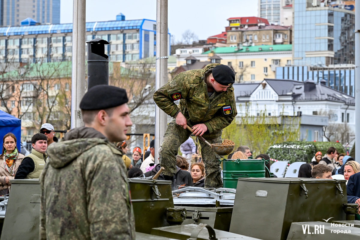 Во Владивостоке празднуют 9 Мая на центральной площади города, которую в этом году подготовили действительно масштабно и интересно. Люди начали заполнять её сразу после парада, выстраиваясь в очереди к разным интерактивным зонам: от настольных игр до авиационной техники. Среди тематических фотозон особенно выделяются парящие в небе белые журавли. А самая длинная очередь выстроилась к бесплатной солдатской каше. Но если лень стоять, можно купить её за 300 рублей.