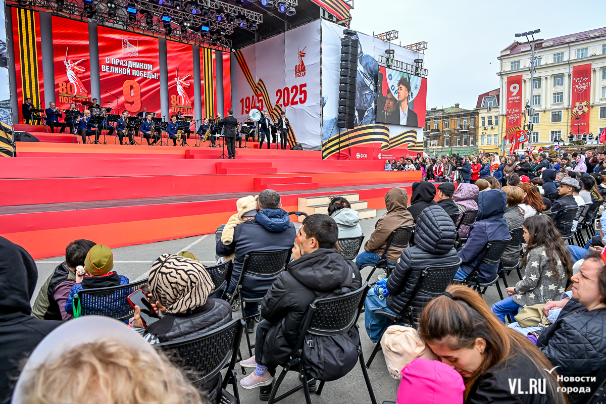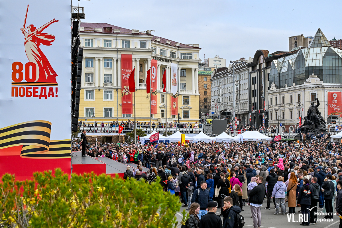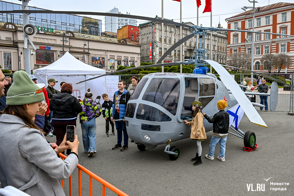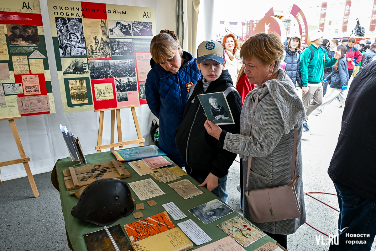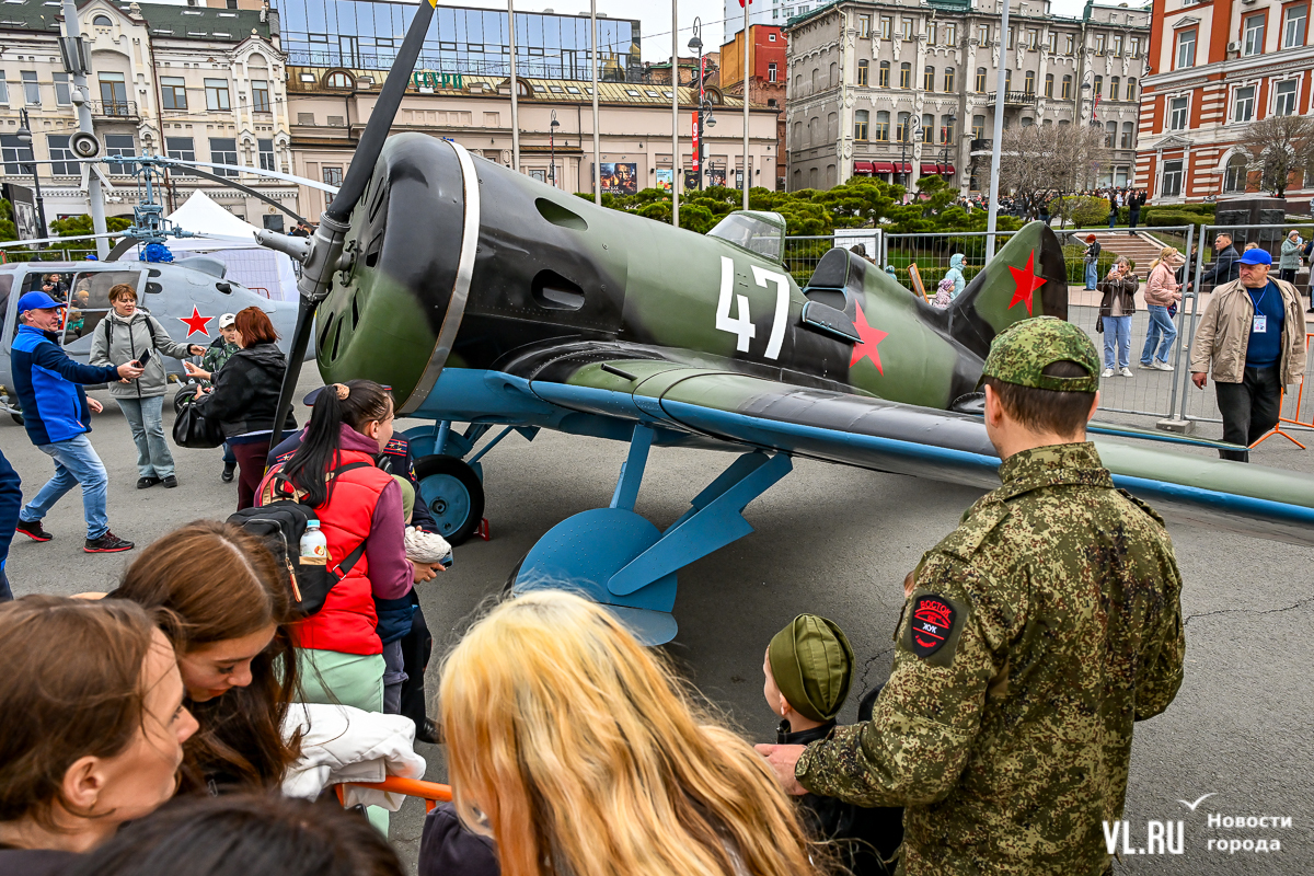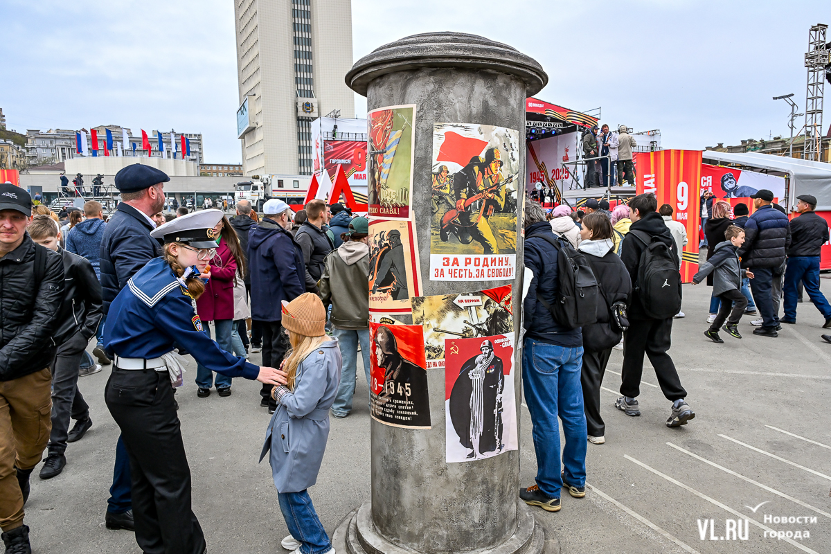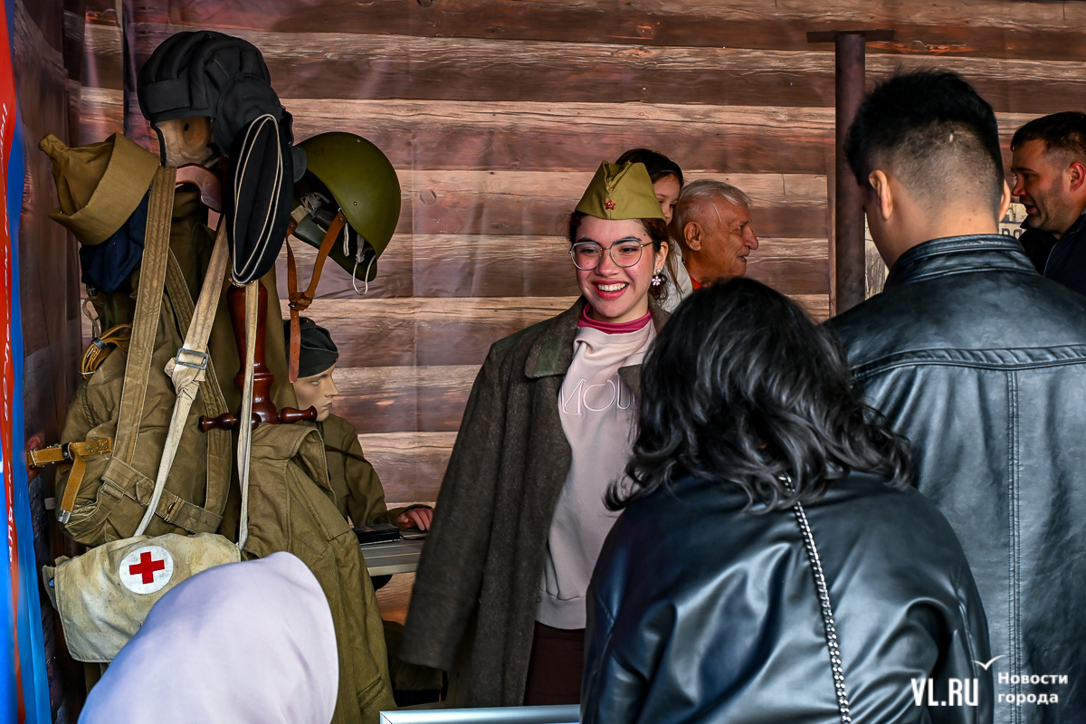 Во Владивостоке празднуют 9 Мая на центральной площади города, которую в этом году подготовили действительно масштабно и интересно. Люди начали заполнять её сразу после парада, выстраиваясь в очереди к разным интерактивным зонам: от настольных игр до авиационной техники. Среди тематических фотозон особенно выделяются парящие в небе белые журавли. А самая длинная очередь выстроилась к бесплатной солдатской каше. Но если лень стоять, можно купить её за 300 рублей.