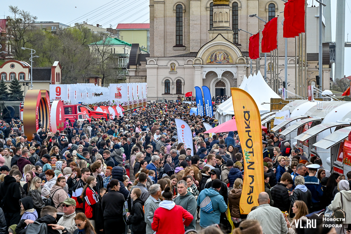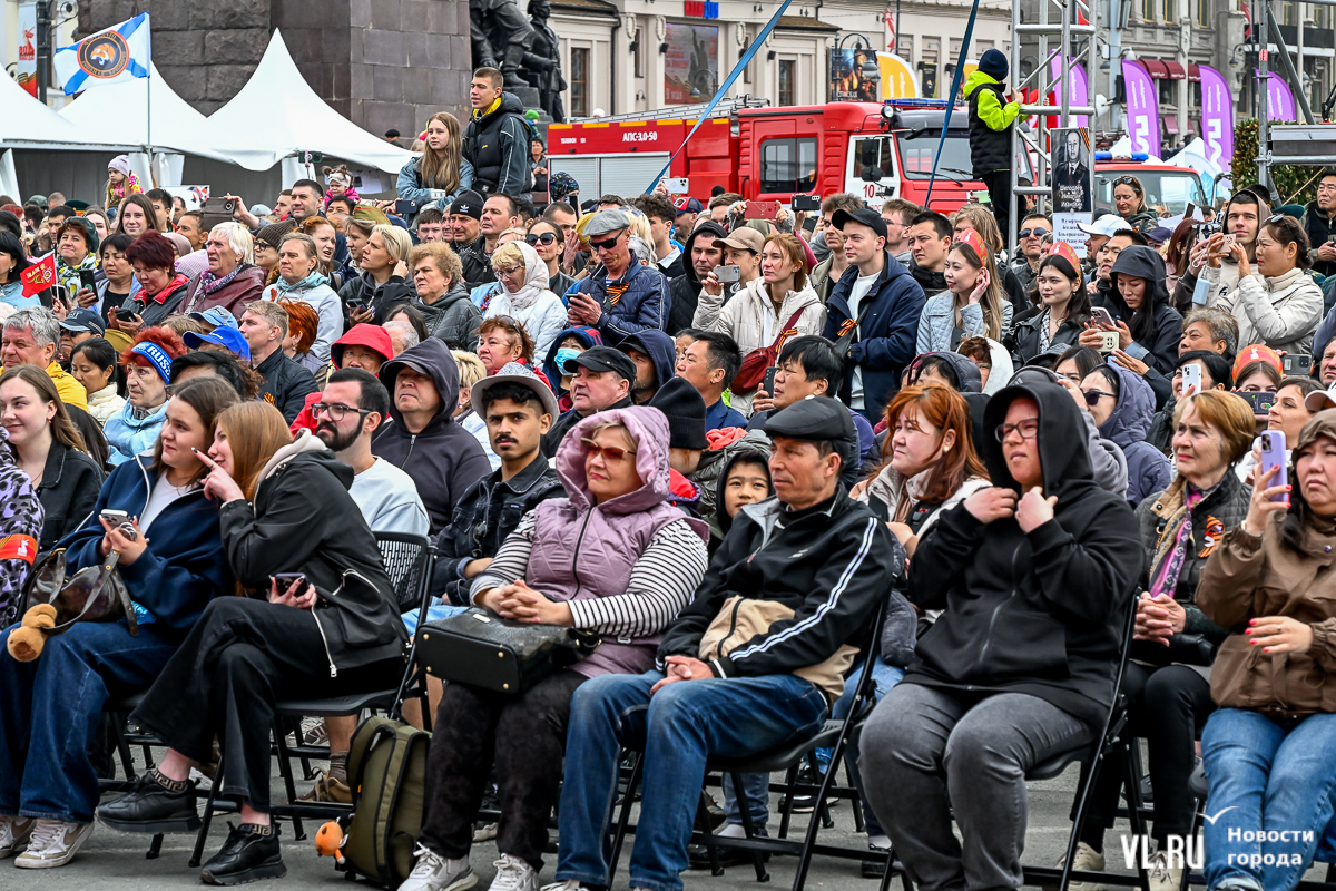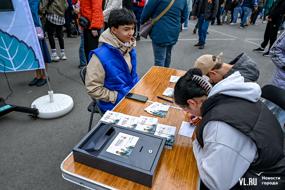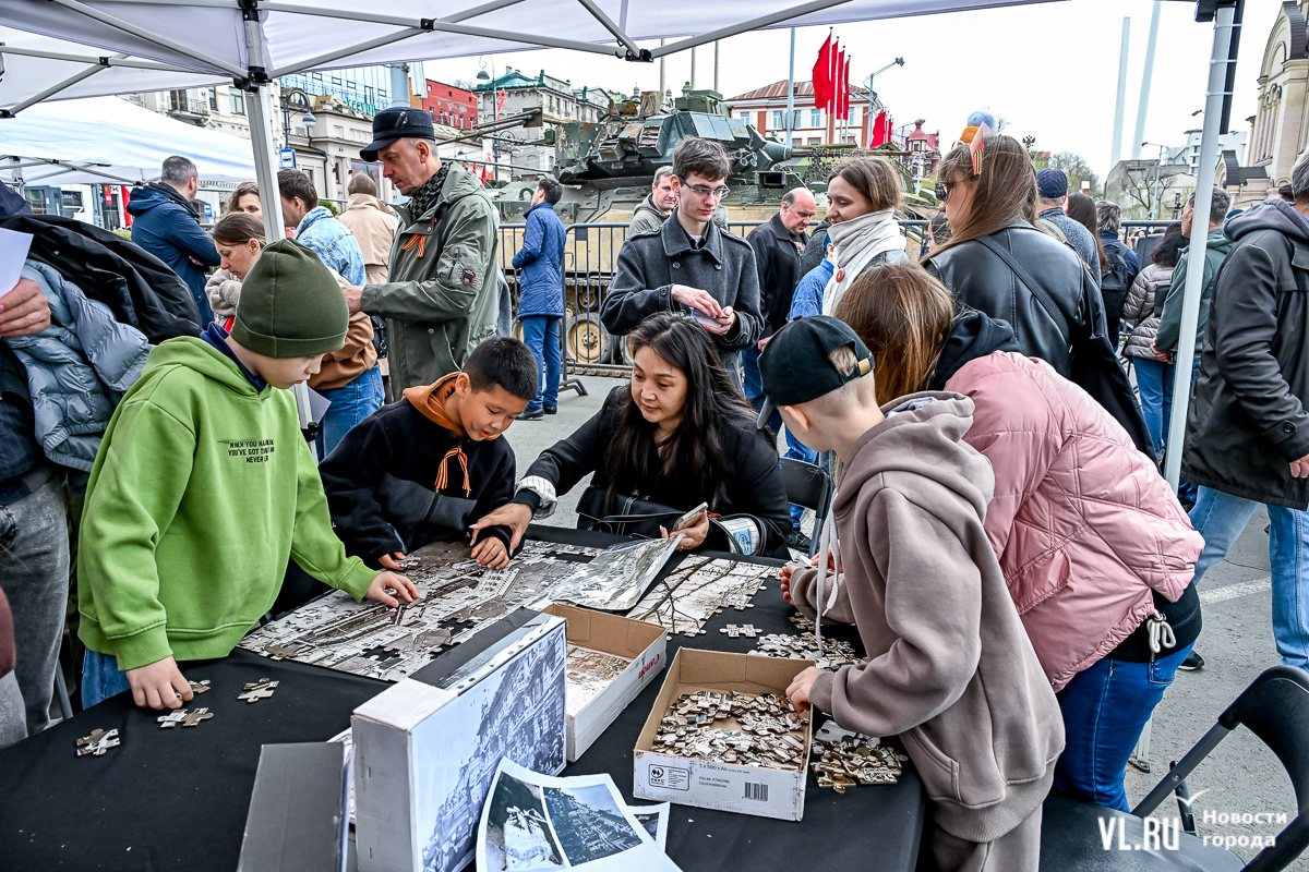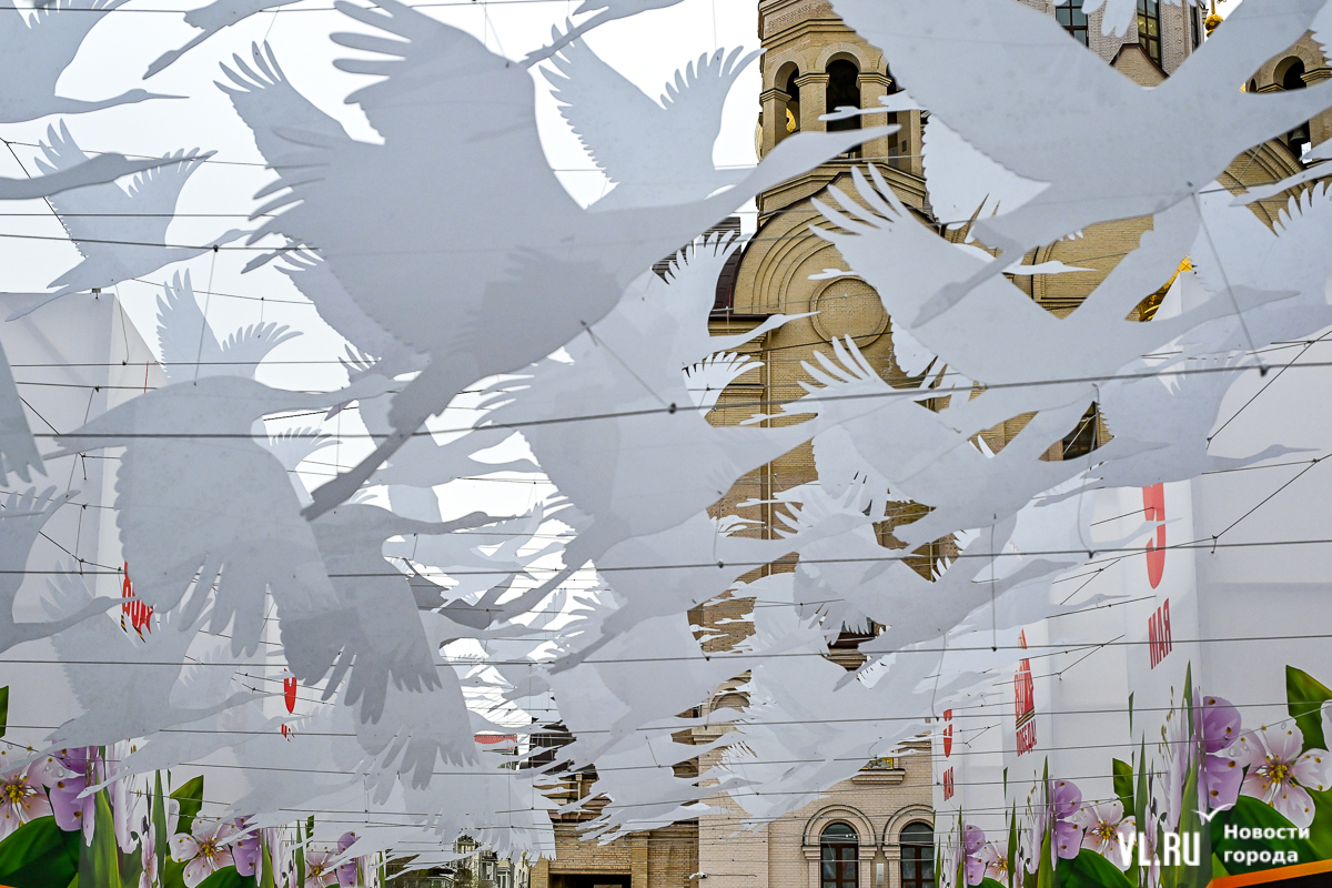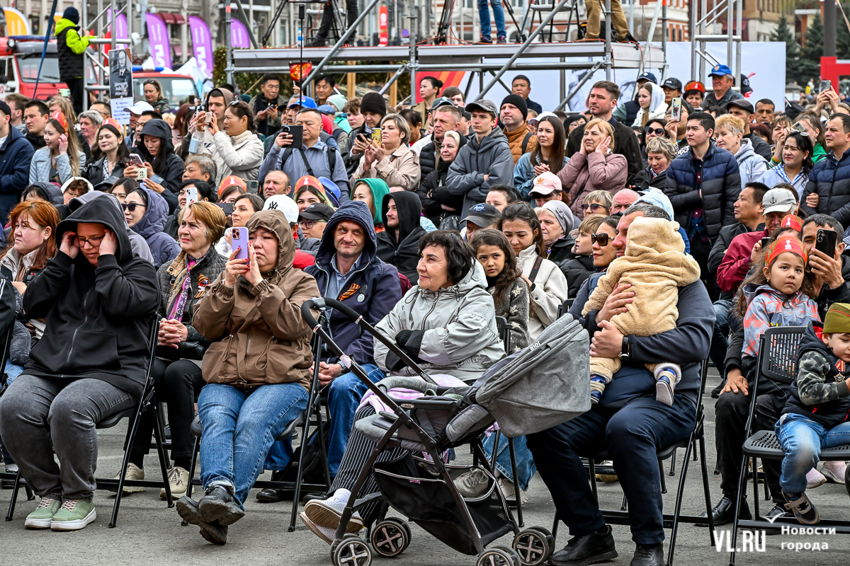 Во Владивостоке празднуют 9 Мая на центральной площади города, которую в этом году подготовили действительно масштабно и интересно. Люди начали заполнять её сразу после парада, выстраиваясь в очереди к разным интерактивным зонам: от настольных игр до авиационной техники. Среди тематических фотозон особенно выделяются парящие в небе белые журавли. А самая длинная очередь выстроилась к бесплатной солдатской каше. Но если лень стоять, можно купить её за 300 рублей.