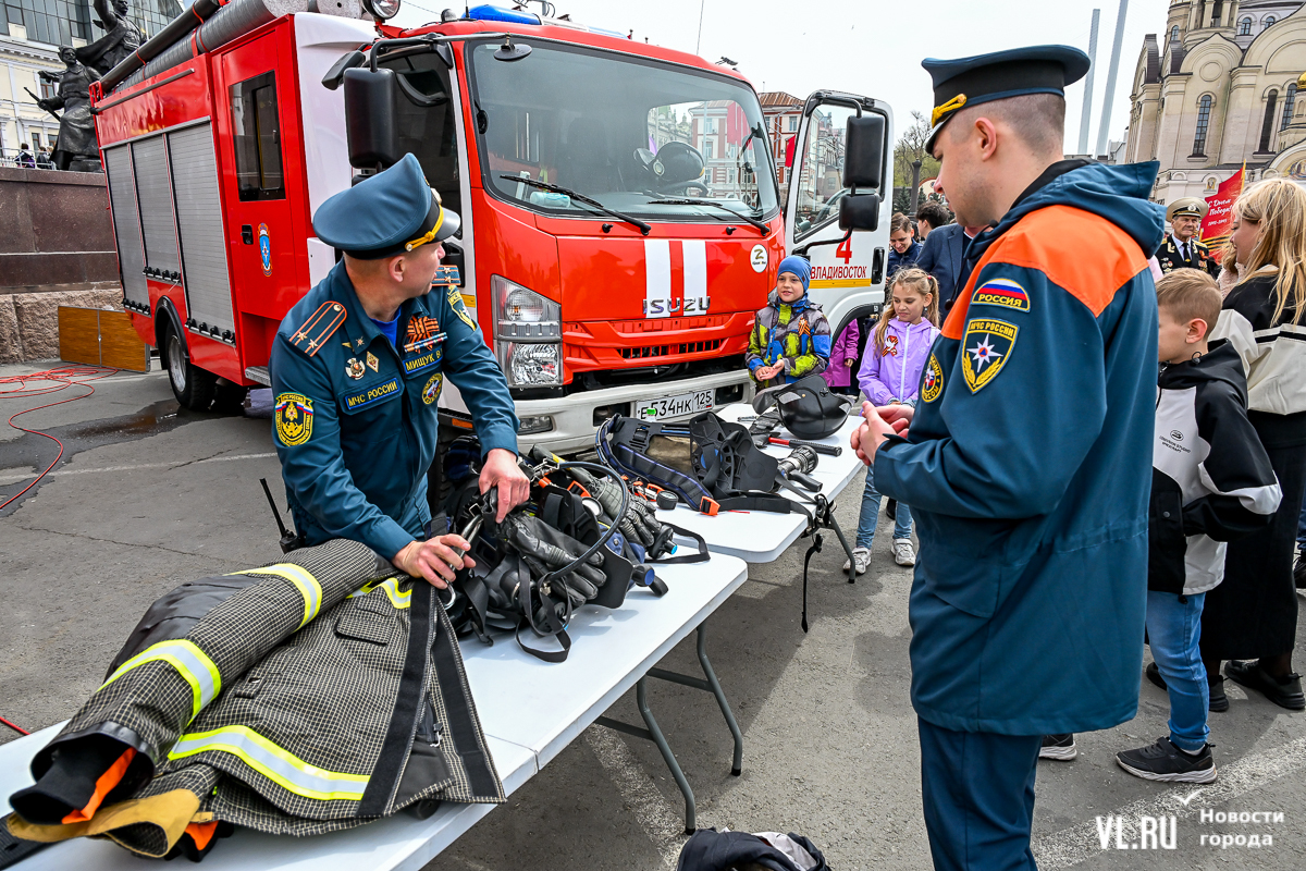 В основном все локации посвящены 80-летию Победы. Но можно встретить, к примеру, выставку современной пожарной техники, и людей вокруг неё тоже не мало. Гуляющие останавливаются, чтобы сфотографироваться или примерить на себе костюм пожарного. Некоторые ребята даже соревновались между собой, кто быстрее оденется.