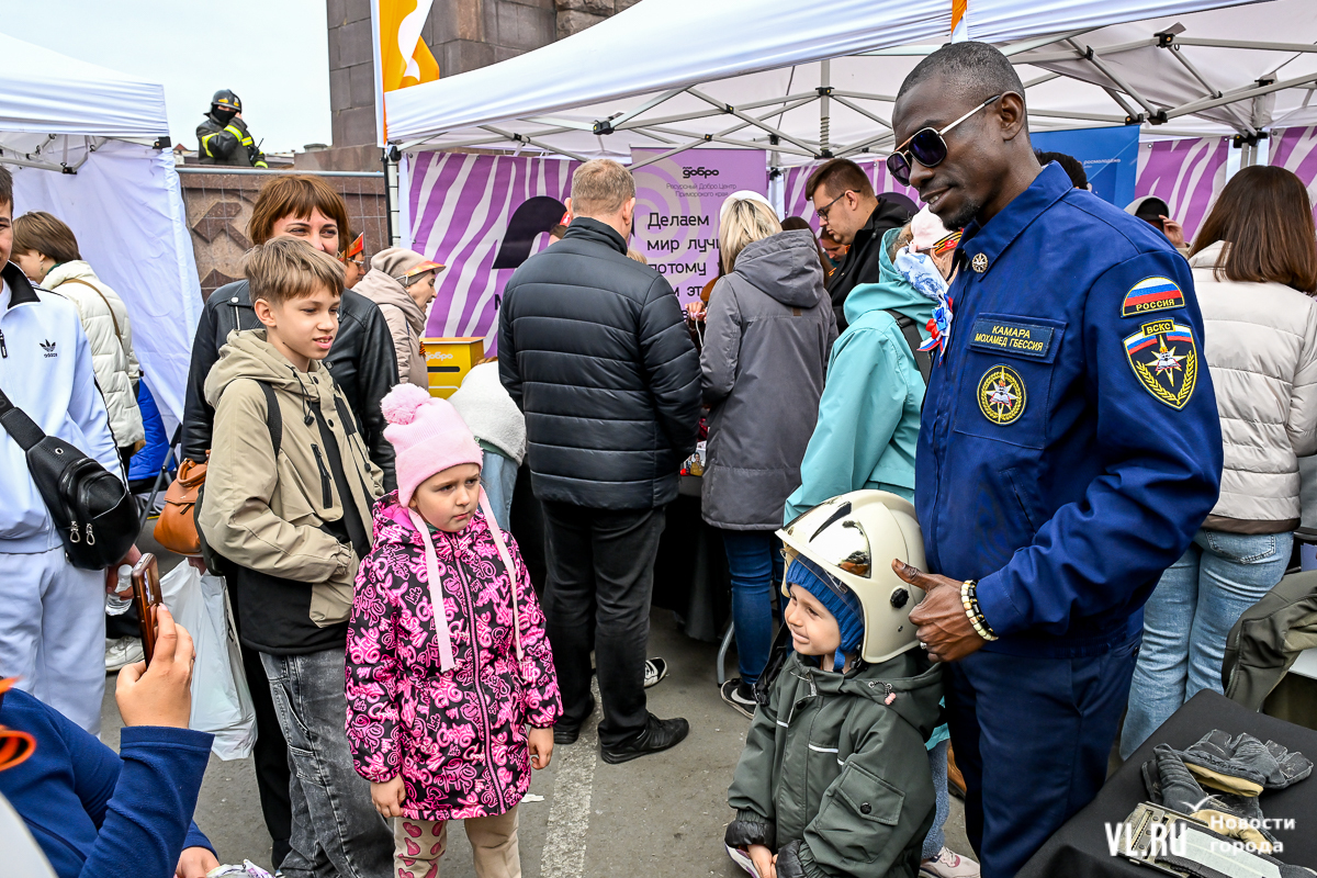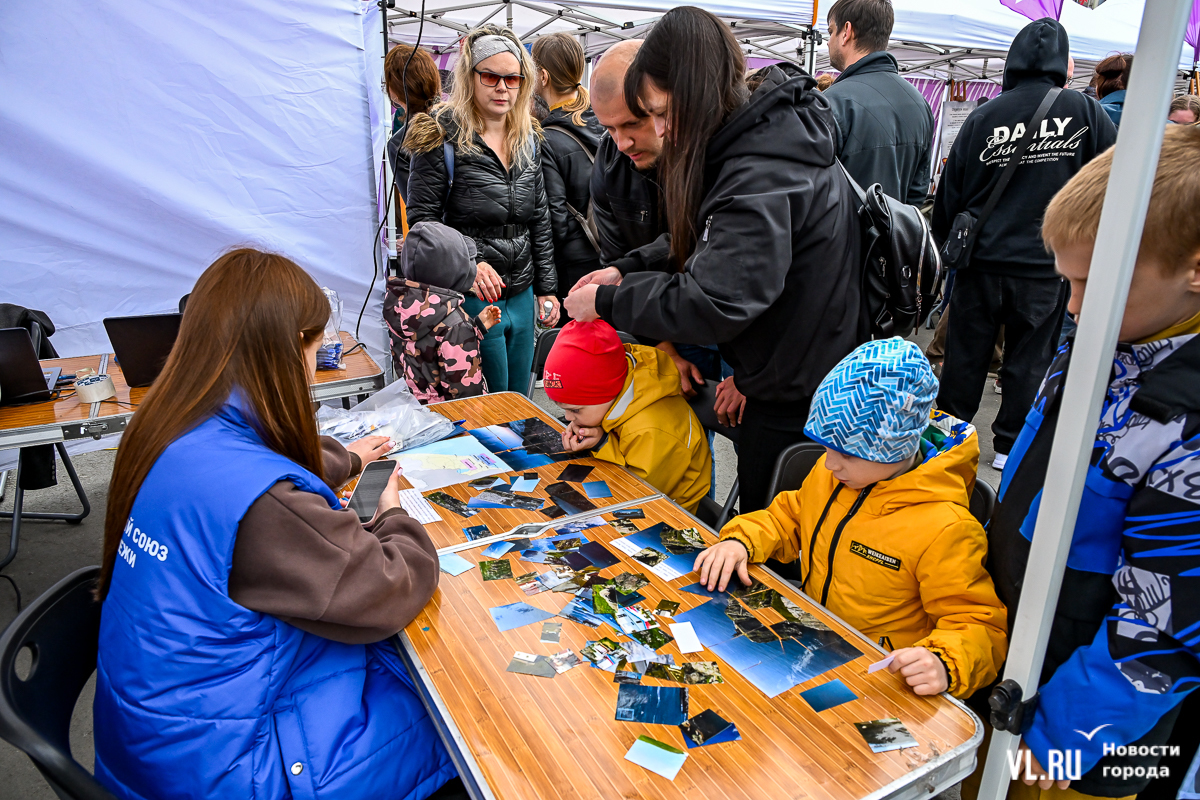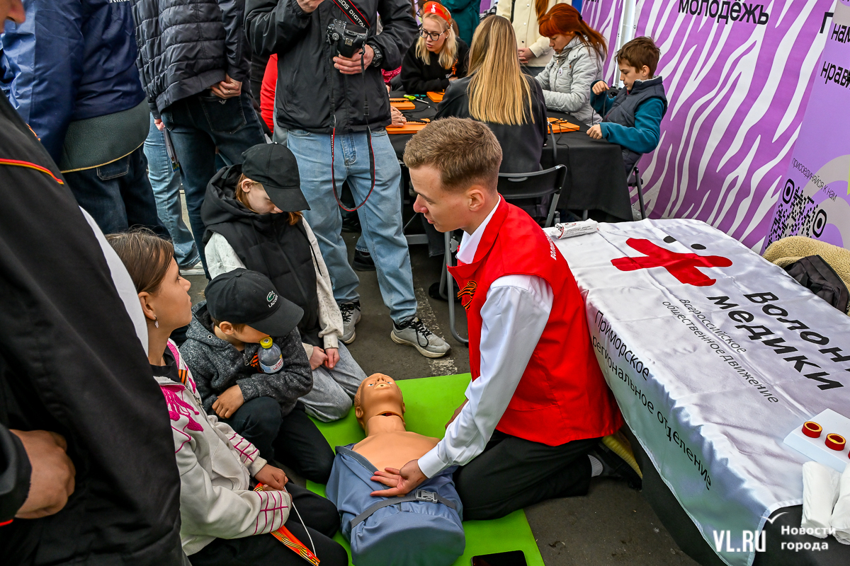 Рядом стоят палатки «Молодёжи Приморья». Тут можно написать письмо на тематической открытке и отправить своим родственникам, друзьям. Чуть дальше опять стенд не «в тему» – основы первой помощи. На земле лежит манекен, на котором волонтёры показывают, как нужно делать непрямой массаж сердца. Людей вокруг не много, в основном это дети, которые пришли с родителями на праздник – им интересно всё.