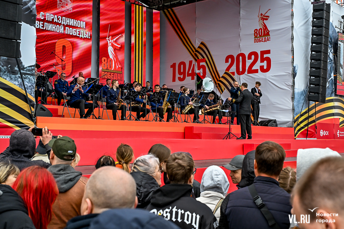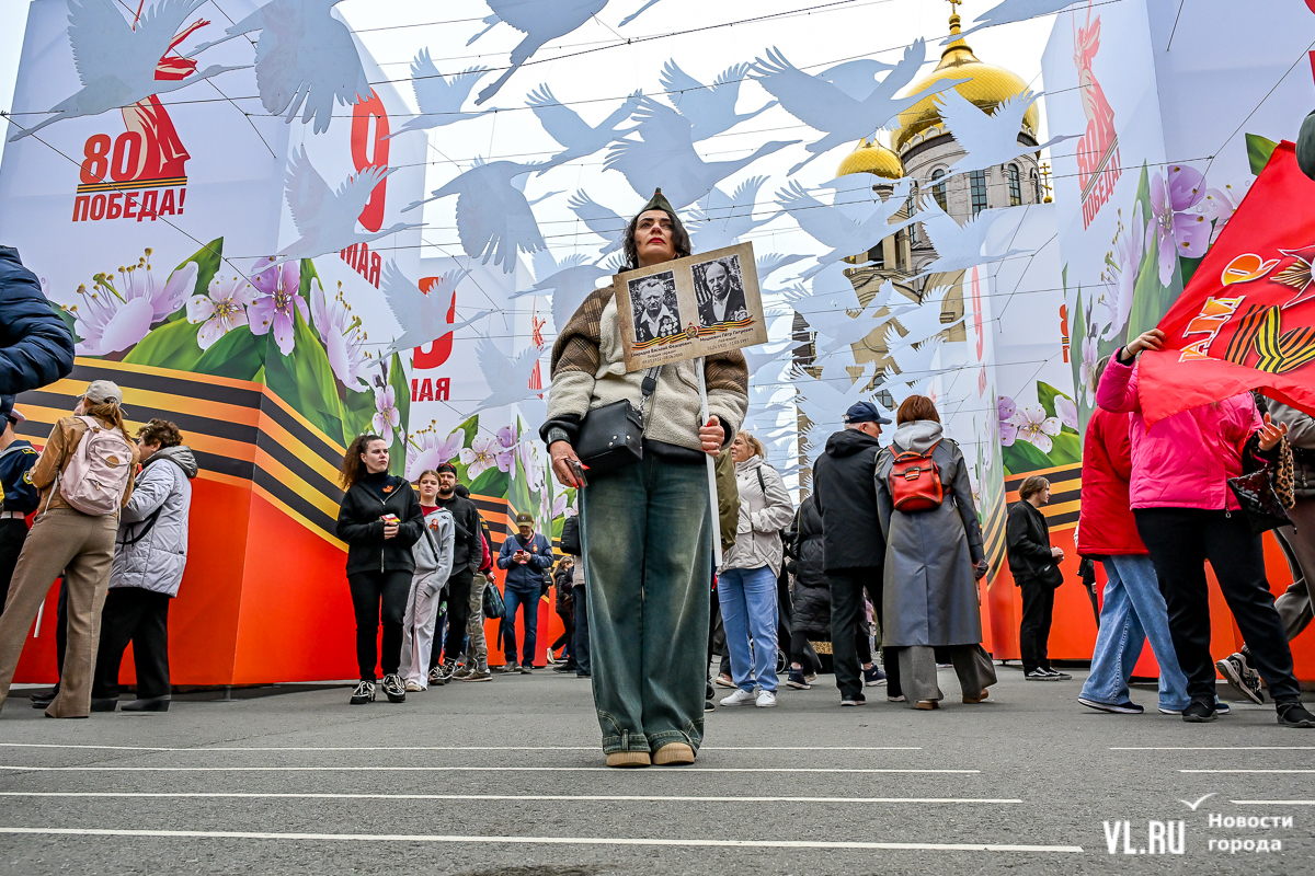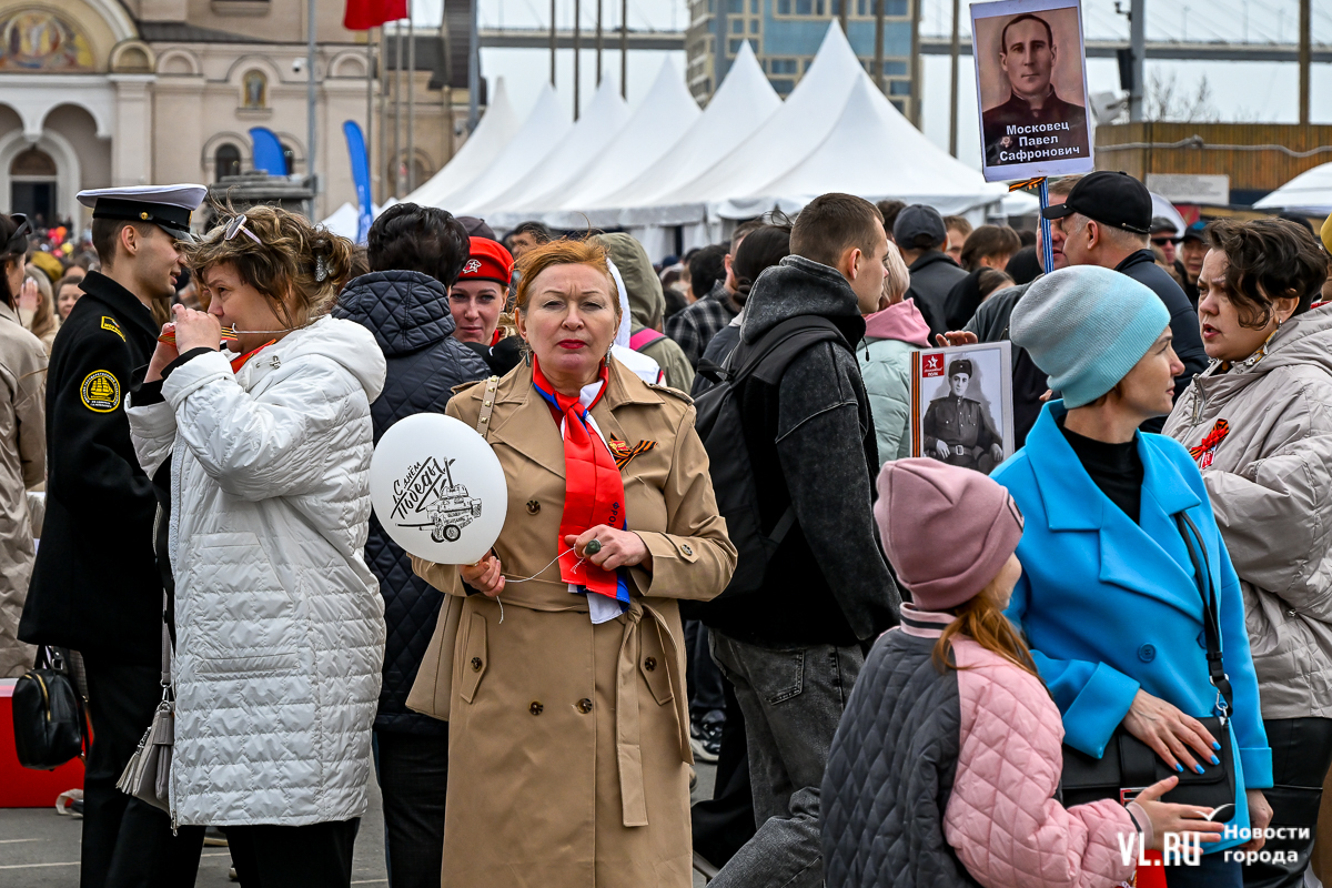 После завершения парада Победы и шествия «Бессмертный полк», примерно в 11:30, зрители переместились на площадь Борцов Революции. Тем, кто стоял со стороны Океанского проспекта, пройти достаточно сложно. Корреспондент Новостей VL.ru, как и многие другие, обходил через улицу Алеутскую. Пешеходный переход в центре был закрыт.