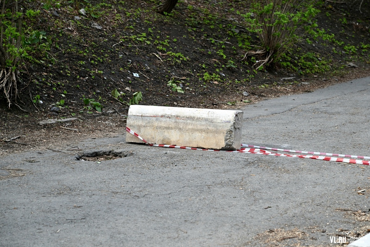 Обновление 13 мая: Сейчас место обвала огорожено оранжевой сеткой, опасный участок закрыт для проезда, по обочине дороги над косогором натянута сигнальная лента. Также оранжевая сетка натянута ниже по косогору и закрывает две лестницы.