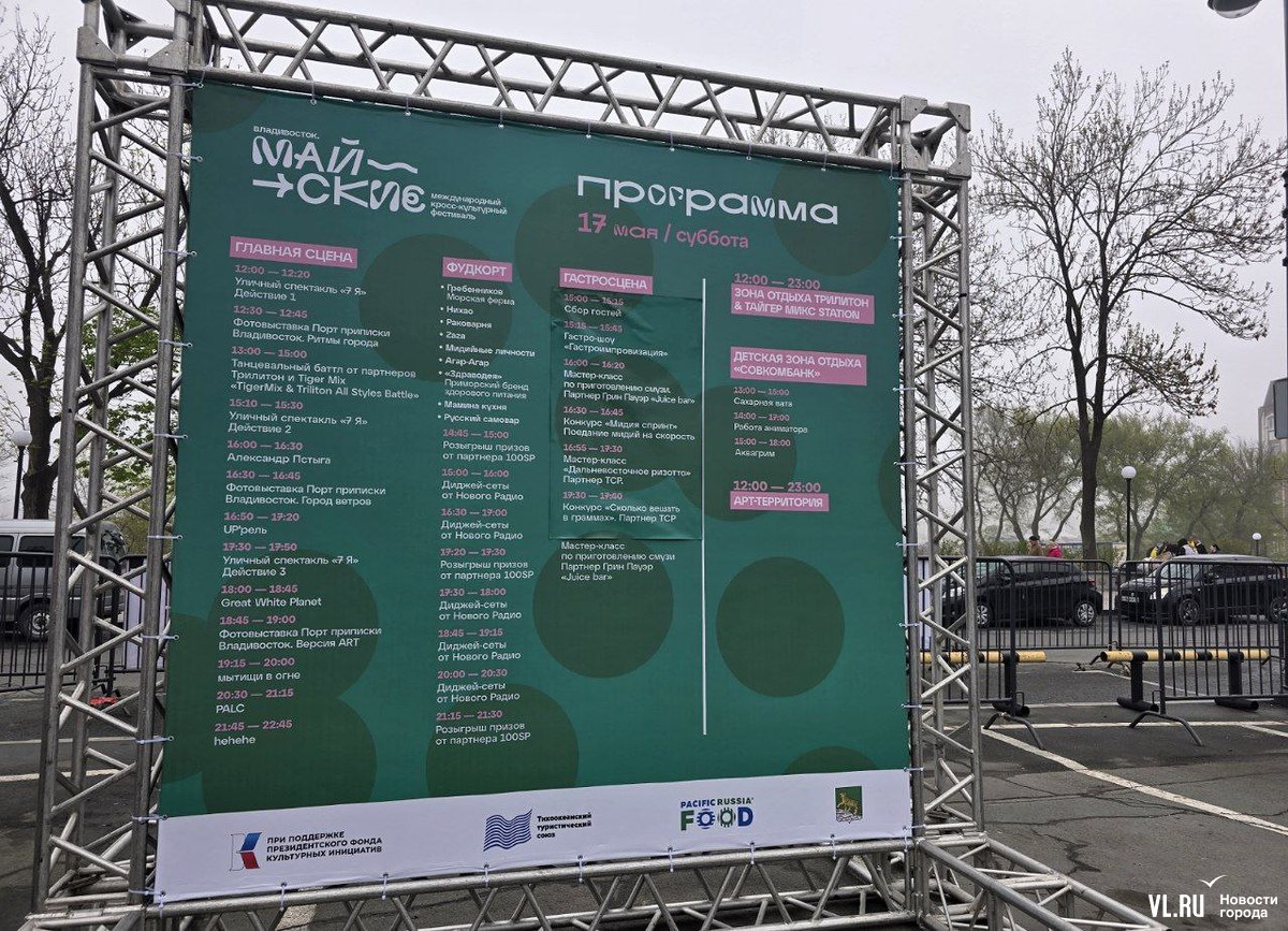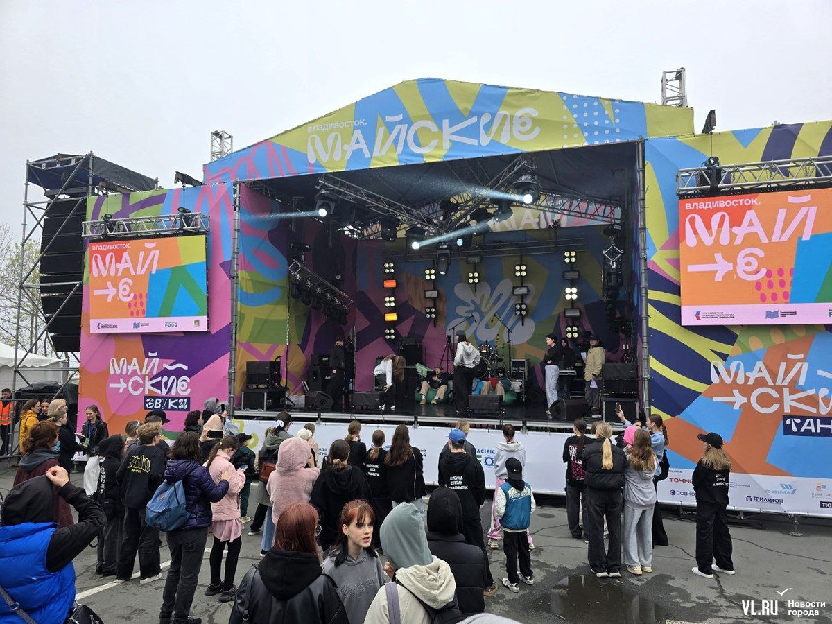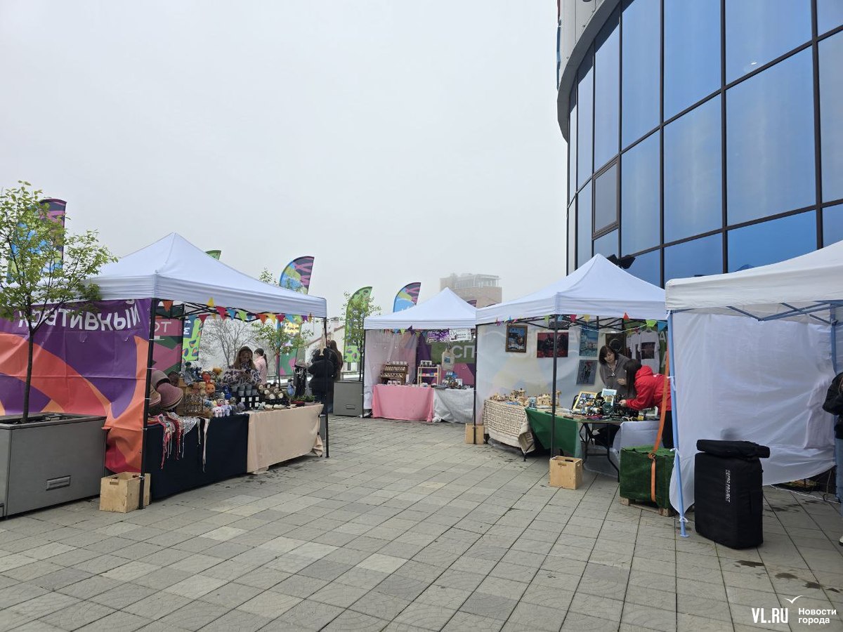На улице Набережной у кинотеатра «Океан» сегодня проходит первый день кросс-культурного фестиваля «Майские». На сцене под громкие хип-хоп биты танцоры участвуют в баттлах, чуть выше художники разукрашивают яркими красками скульптуры тигров, работают тематические пространства с пуфами и палатки с товарами местных мастеров. Детей развлекают аниматоры и мастера аквагрима. Но из-за погоды посетителей не очень много – в основном все прячутся в крытой палатке зоны фудкорта – здесь можно поесть как китайскую лапшу, так и морепродукты.