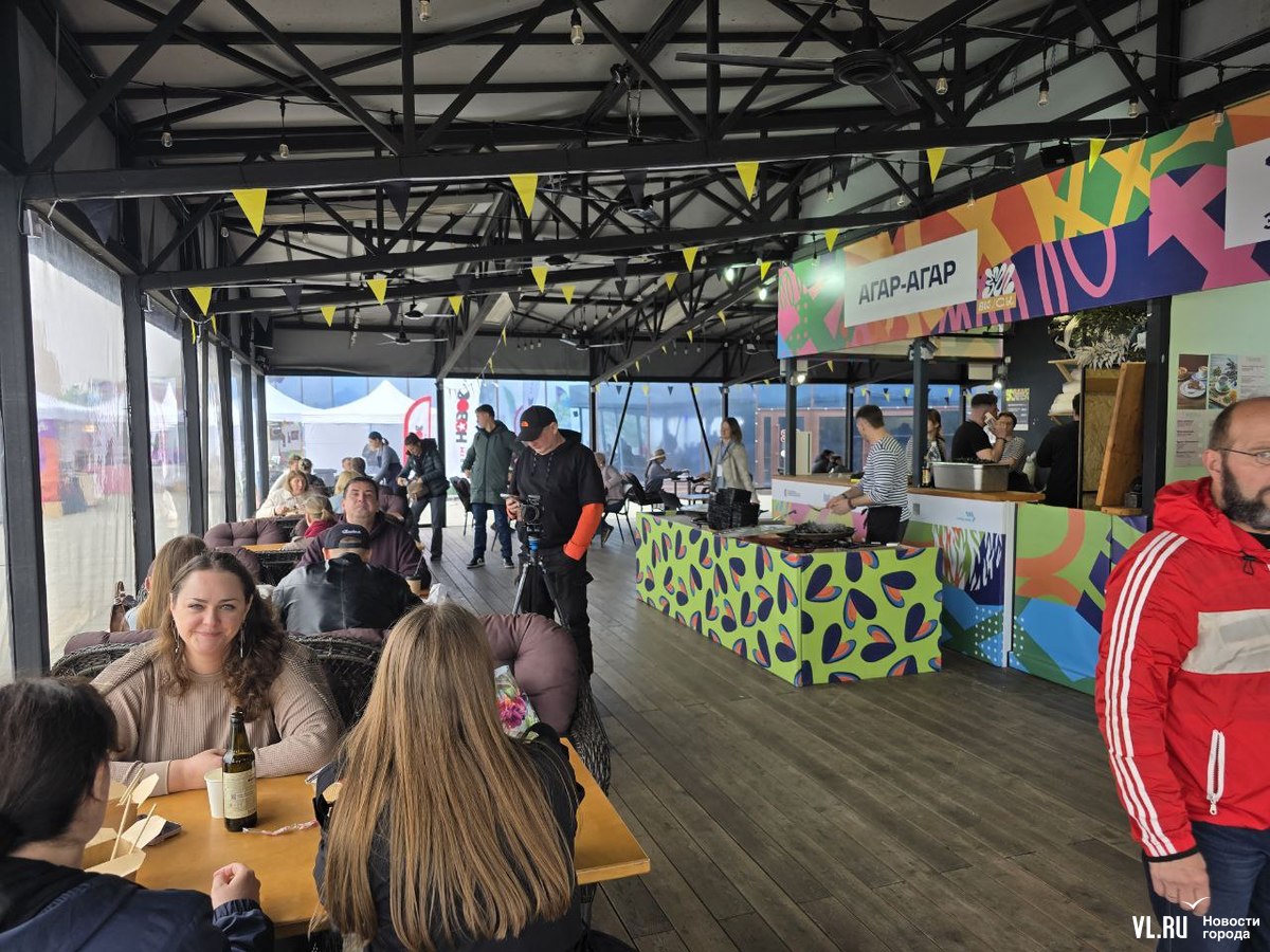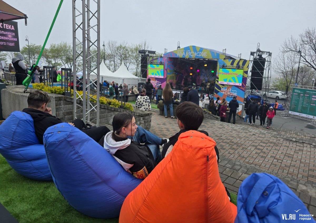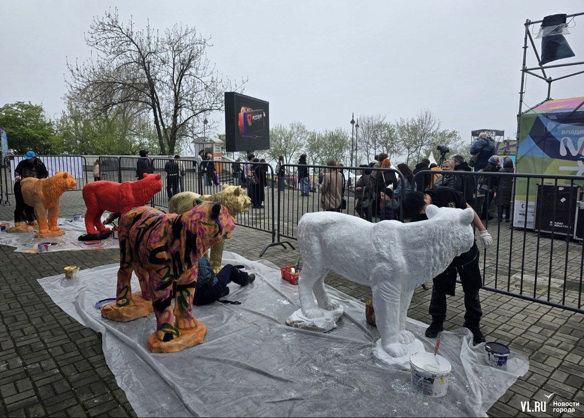 На улице Набережной у кинотеатра «Океан» сегодня проходит первый день кросс-культурного фестиваля «Майские». На сцене под громкие хип-хоп биты танцоры участвуют в баттлах, чуть выше художники разукрашивают яркими красками скульптуры тигров, работают тематические пространства с пуфами и палатки с товарами местных мастеров. Детей развлекают аниматоры и мастера аквагрима. Но из-за погоды посетителей не очень много – в основном все прячутся в крытой палатке зоны фудкорта – здесь можно поесть как китайскую лапшу, так и морепродукты.