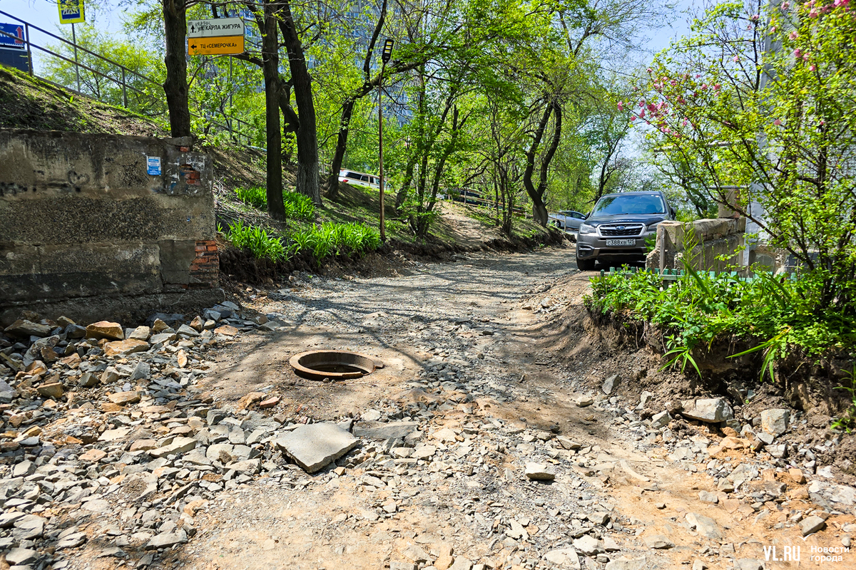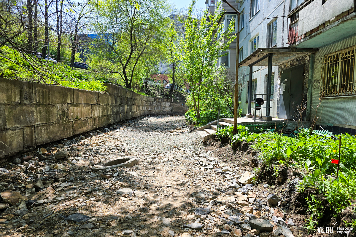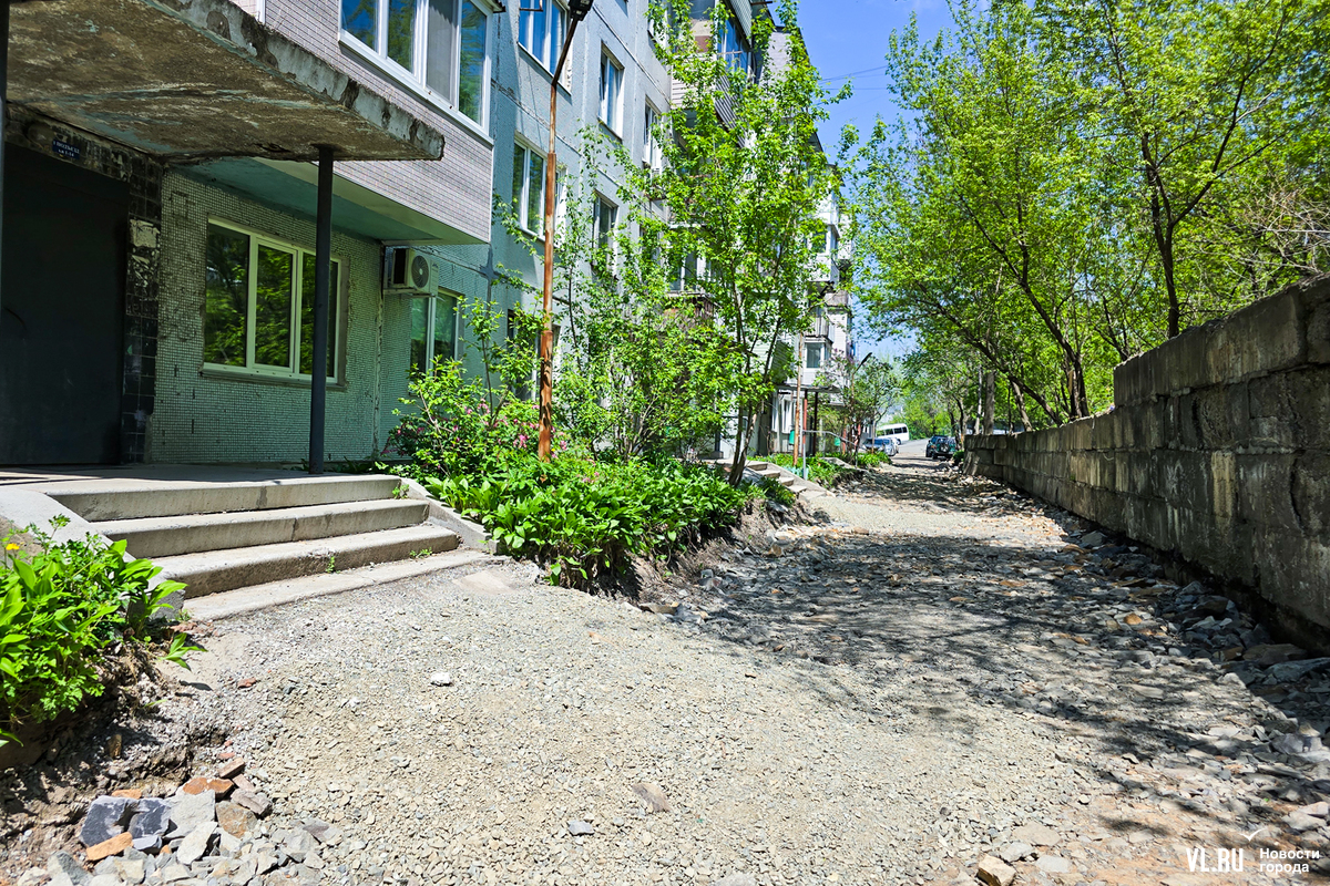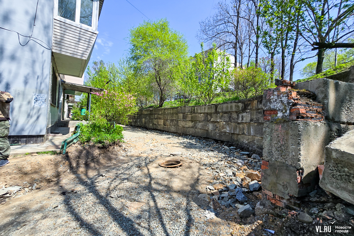 В апреле жителей пятиэтажки на Котельникова во Владивостоке обрадовали – начался долгожданный ремонт дороги перед их домом. Рабочие успели всё «разворошить», однако завершить ремонт в срок помешала найденная в коммуникациях течь. По словам жильцов, проблему так и не устранили, и всё это время им приходилось преодолевать разбитую и опасную дорогу. А сегодня напротив этого дома ещё и начали ремонтировать подпорную стену. И теперь, как говорят в мэрии, дорогу заасфальтируют, только когда закончат со стеной.