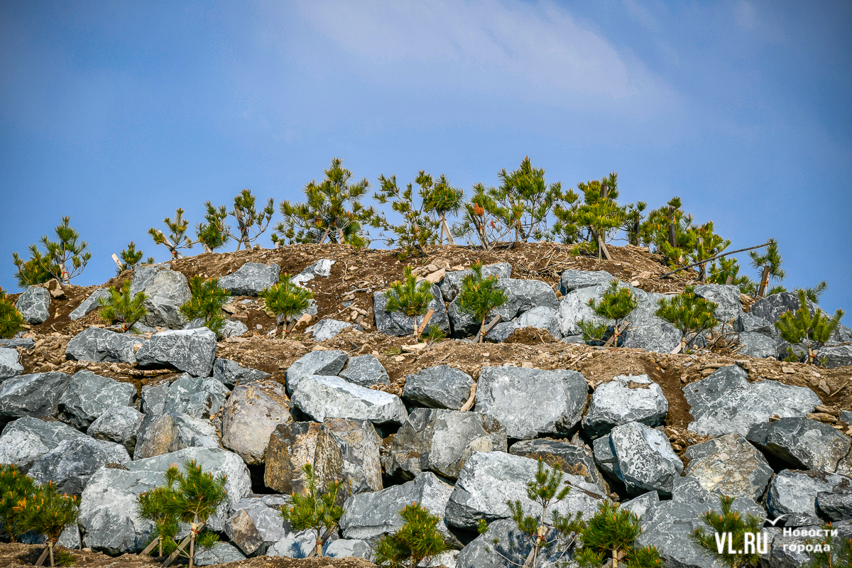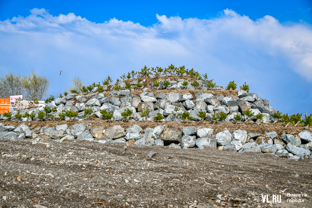 Этой весной на берегу Патрокла очень много заметных изменений. Большой стихийной парковки больше нет, на пустырь завезли грунт, подняв его уровень над морем. Ближе к полуострову Басаргина уже поработали ландшафтные дизайнеры: впервые на Патрокле появились земляные валы, оформленные каменными валунами. На этих искусственных холмах уже в большом количестве высадили саженцы сосны густоцветковой. В перспективе на берегу может вырасти лес. А пока новый рельеф станет защитой от ветров.