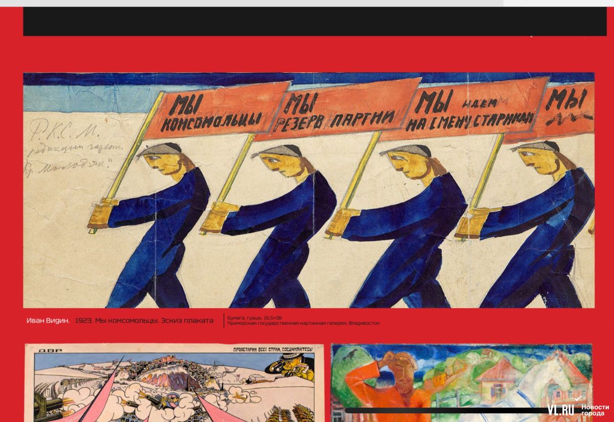 Вся выставка разместилась на нескольких больших стендах-призмах. По словам куратора Ольги Зотовой, их скошенная форма отсылает к ритму одной из картин проекта: Иван Видин «Мы комсомольцы» из Приморской картинной галереи.