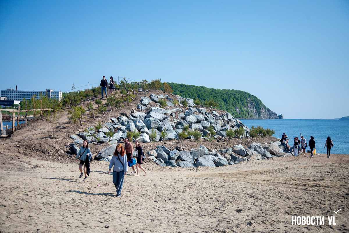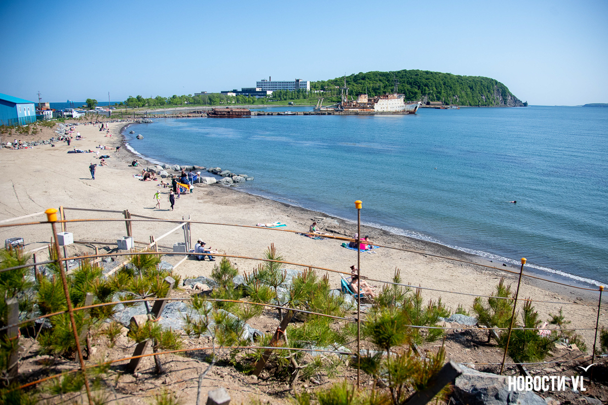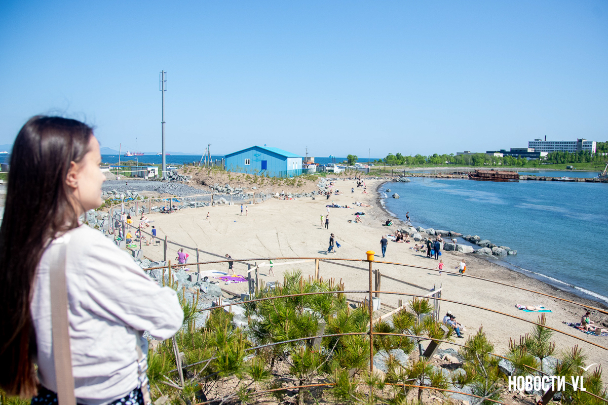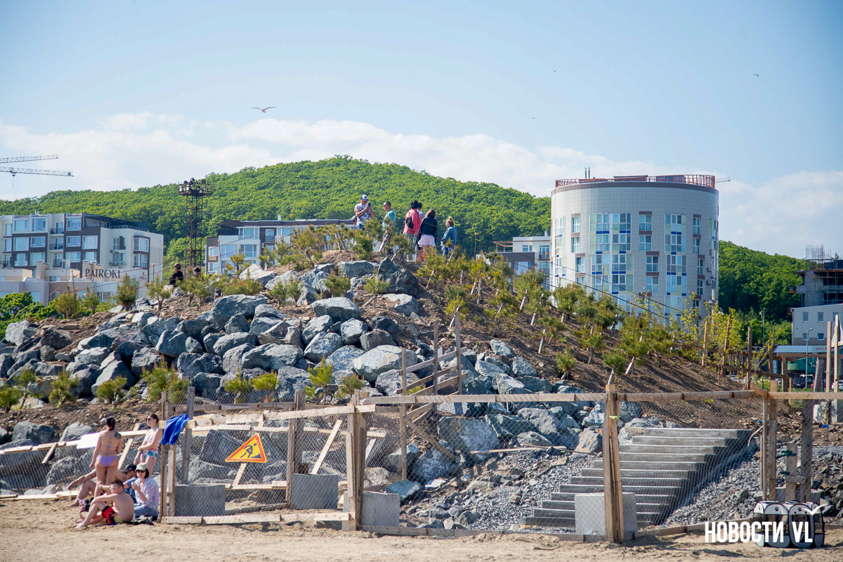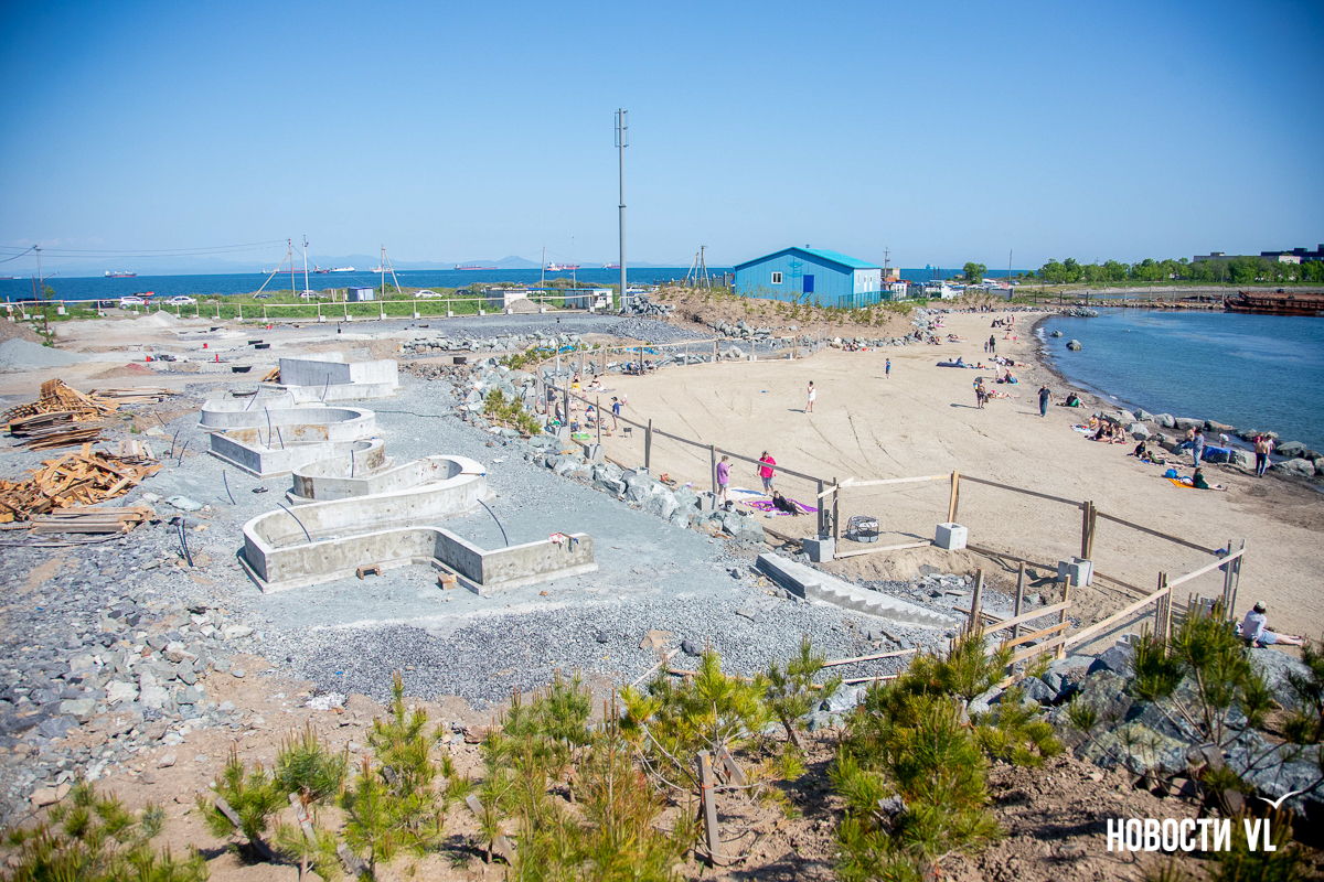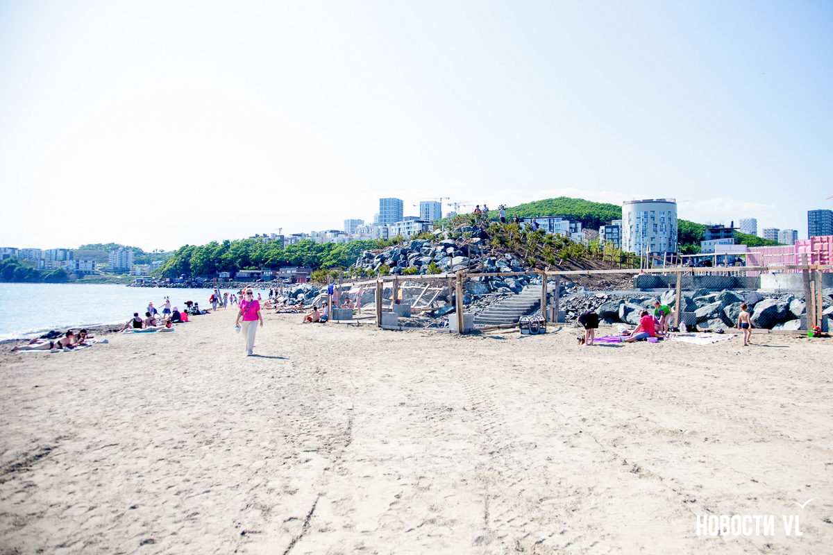 На берегу бухт Патрокл и Соболь АНО «Открывая море Владивостоку», ДНС и «Конкрит Джангл» продолжают возводить «лучший пляж России». Первую очередь пляжа, как и обещали, открыли к нынешнему купальному сезону. Работы здесь ещё не окончены – местами продолжают возводить «малые архитектурные формы», местами тропы остаются грунтовыми. Но отдыхать и купаться уже можно, и горожане как раз этим и занимаются – раскладывают пледы во всей прибрежной зоне и оглядывают обновлённые детали ещё не до конца завершённого благоустройства.