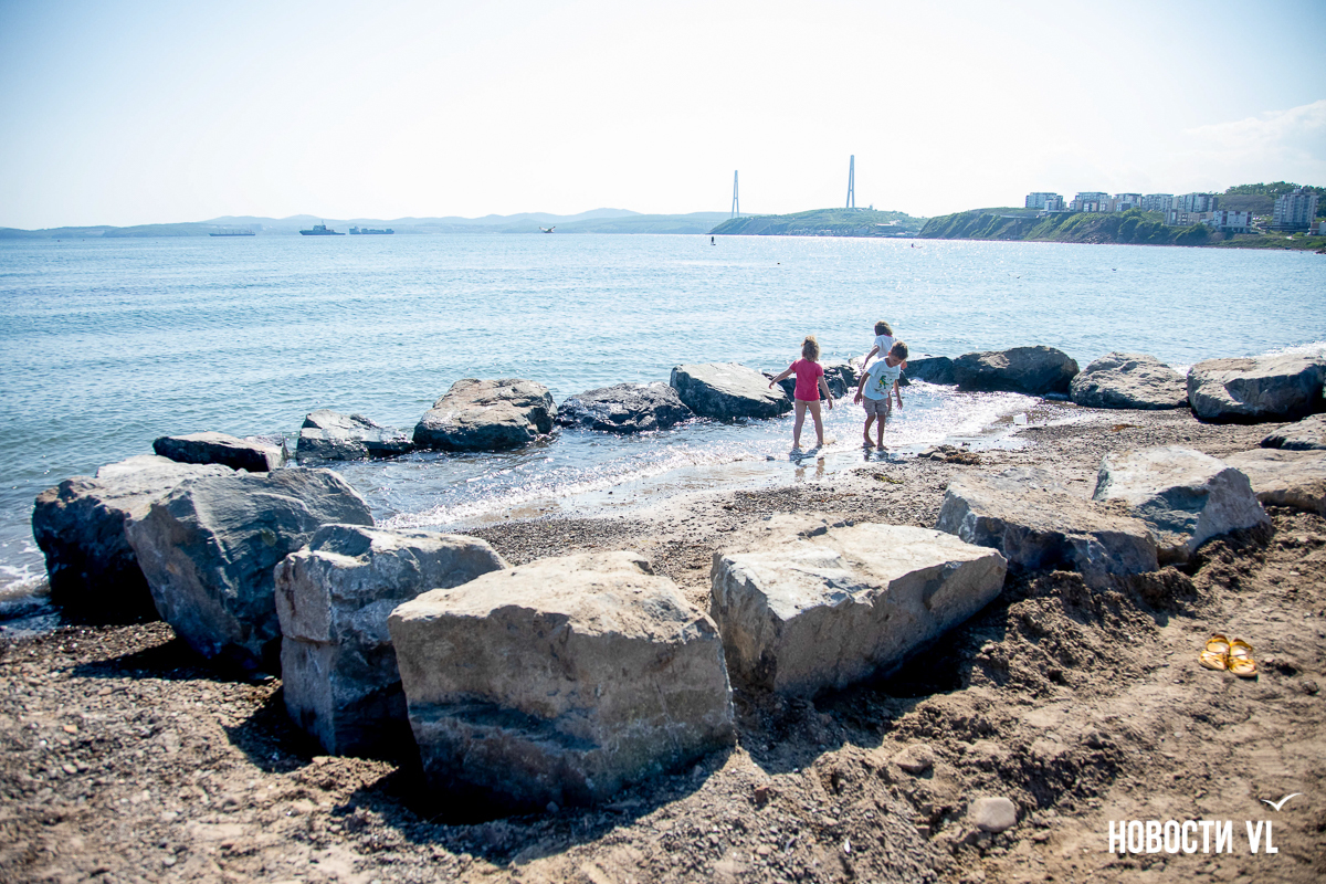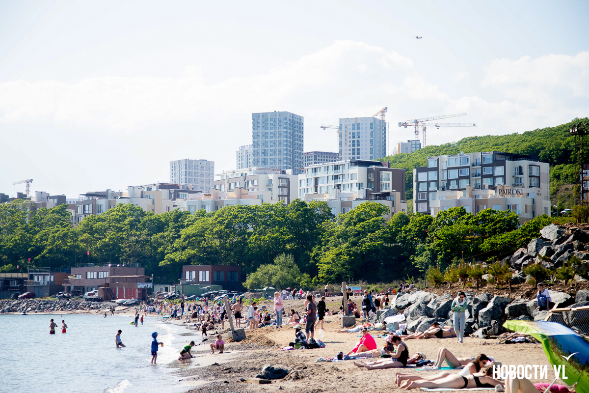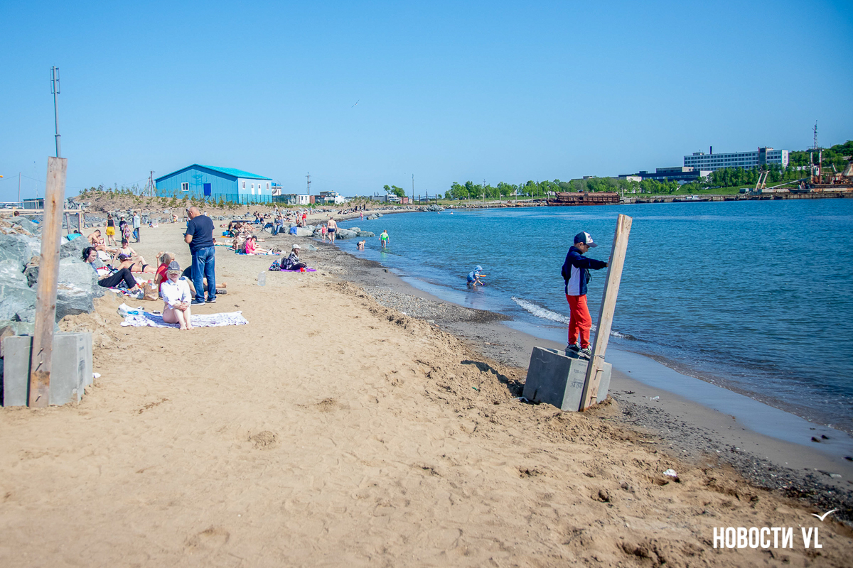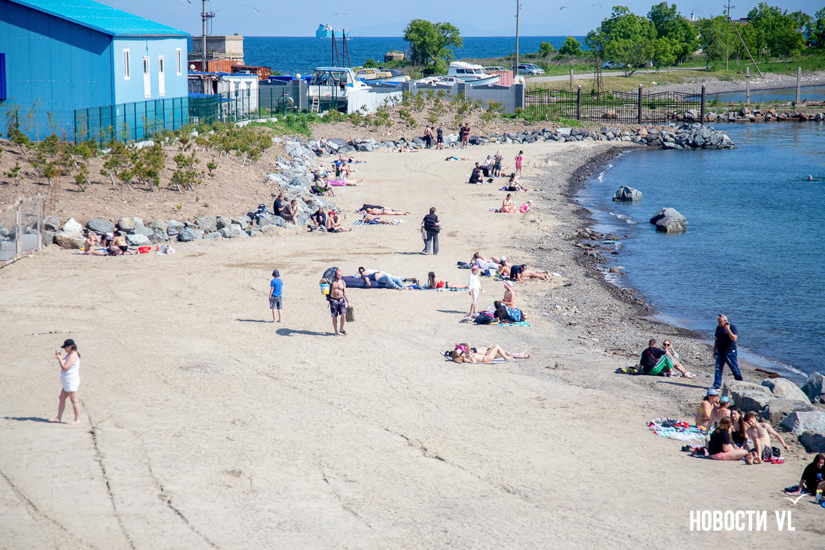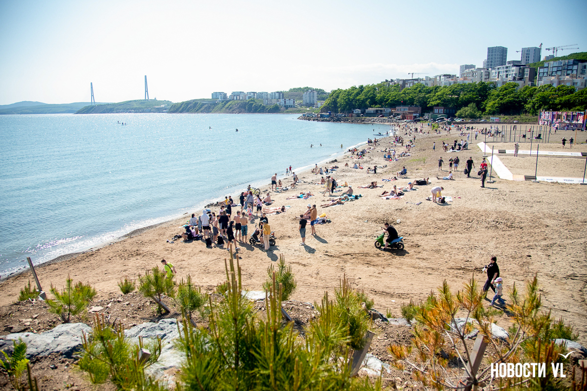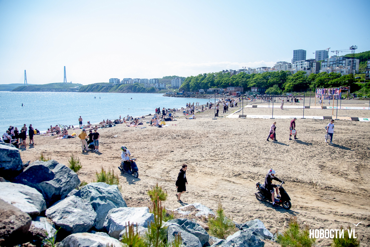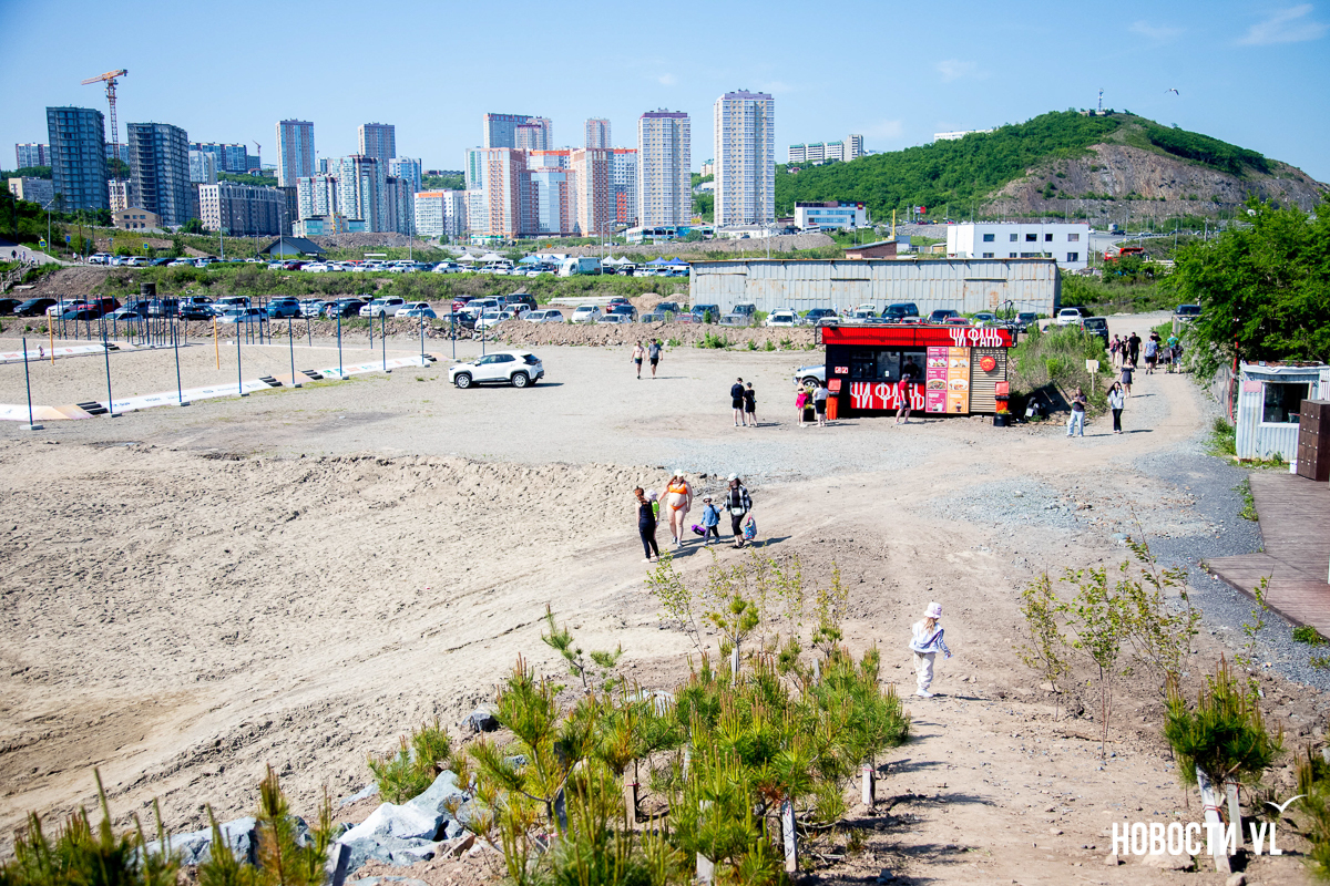 На берегу бухт Патрокл и Соболь АНО «Открывая море Владивостоку», ДНС и «Конкрит Джангл» продолжают возводить «лучший пляж России». Первую очередь пляжа, как и обещали, открыли к нынешнему купальному сезону. Работы здесь ещё не окончены – местами продолжают возводить «малые архитектурные формы», местами тропы остаются грунтовыми. Но отдыхать и купаться уже можно, и горожане как раз этим и занимаются – раскладывают пледы во всей прибрежной зоне и оглядывают обновлённые детали ещё не до конца завершённого благоустройства.