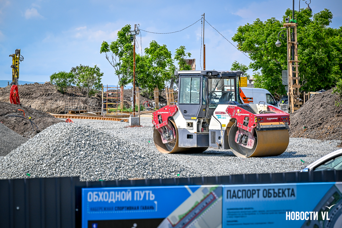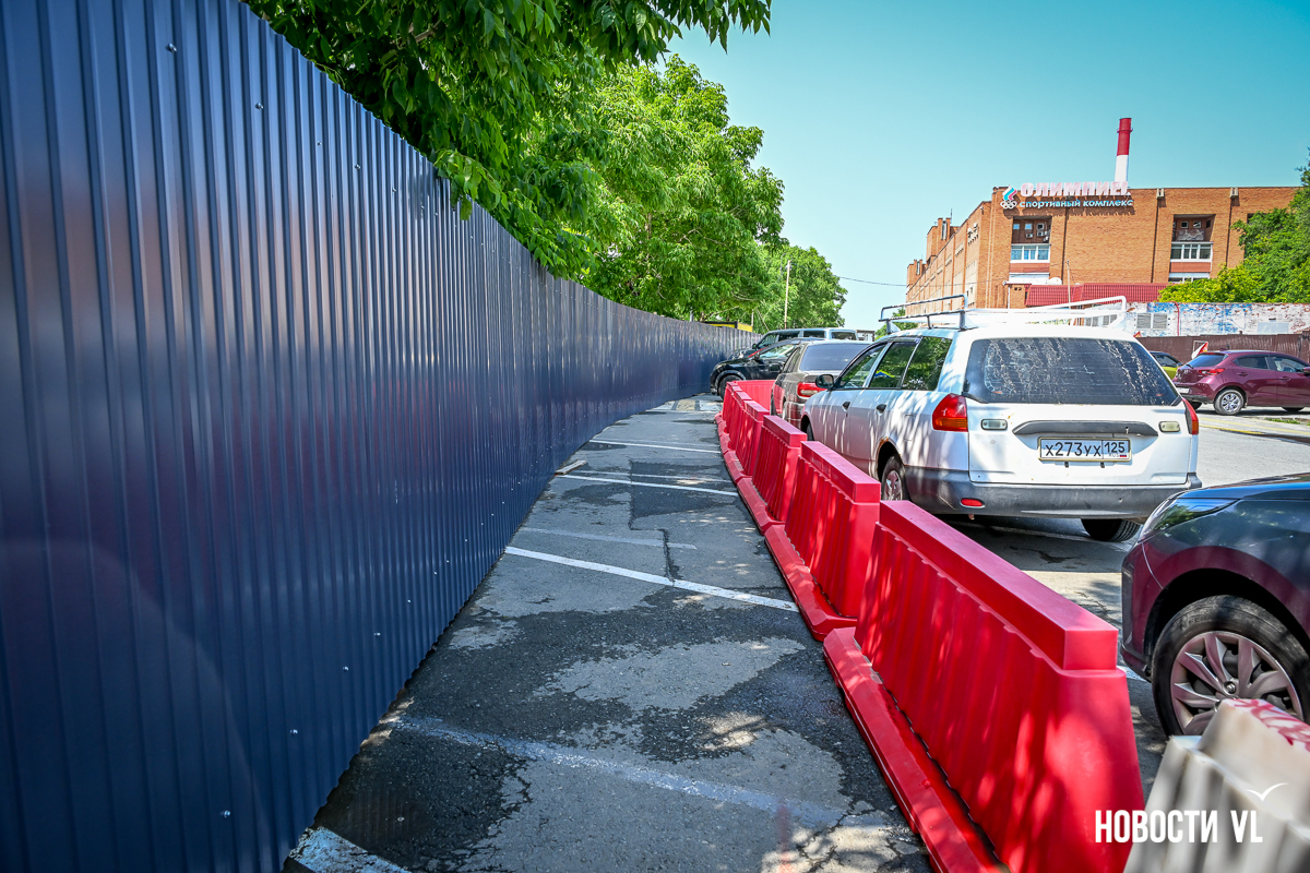 Сейчас на площадке кипит работа. Закрыли эту часть набережной в середине мая, но не полностью. Забором огорожен участок от скейт-парка до «нулевого километра», или почти до середины спорткомплекса «Олимпиец». Для проезда в обе стороны осталась одна полоса, формально перекрытая, но на деле запаркованная транспортом. Для пешеходов остался тротуар вдоль спорткомплекса, до которого ещё нужно добраться.