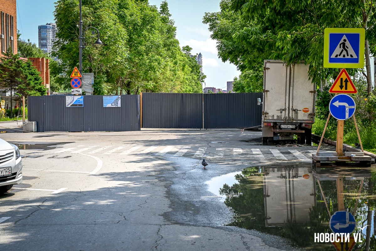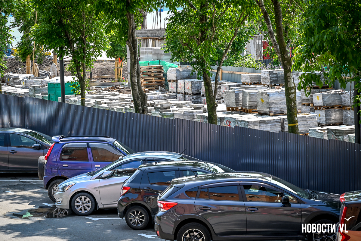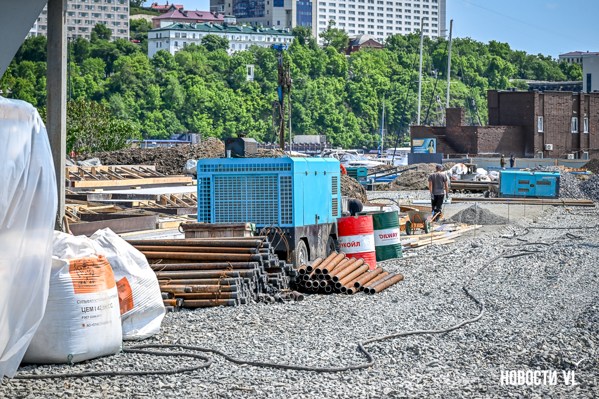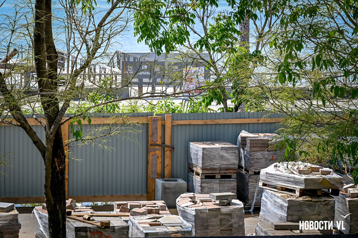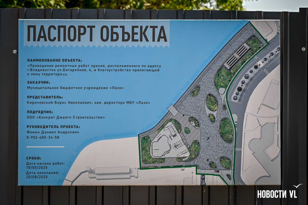 На заборе появился уже и паспорт объекта, которого не было почти месяц с начала стройки. Согласно ему, работы ведёт ООО «Конкрит Джангл Строительство», оно должно сдать благоустроенную зону до 20 августа – примерно в то же время должны закончить реконструкцию здания старого океанариума с превращением его в Национальный центр «Россия».