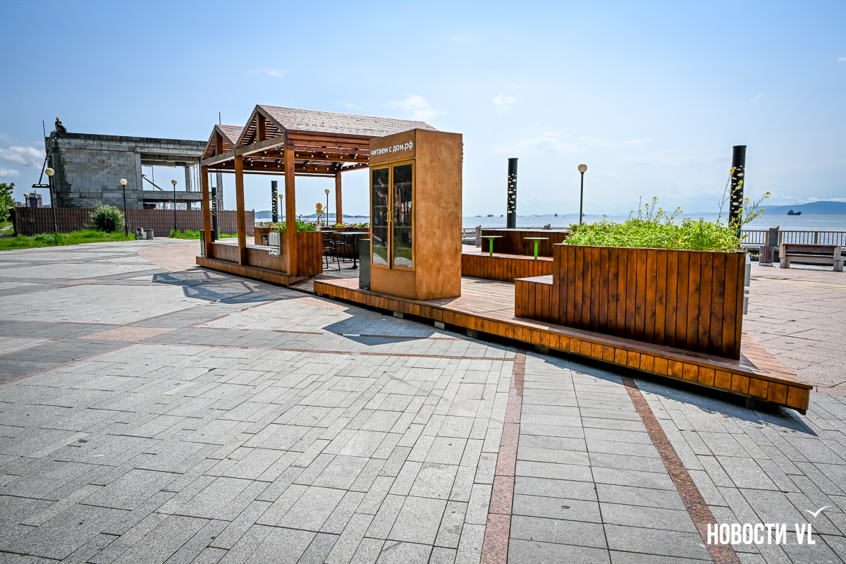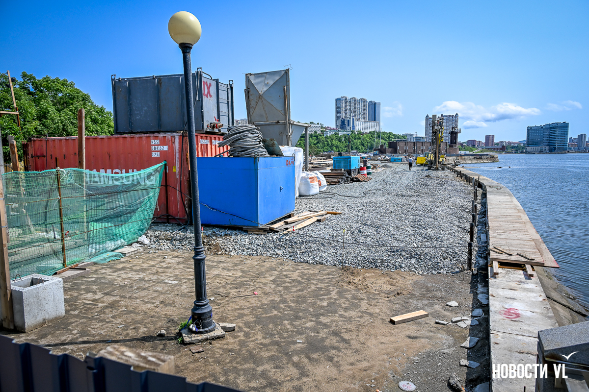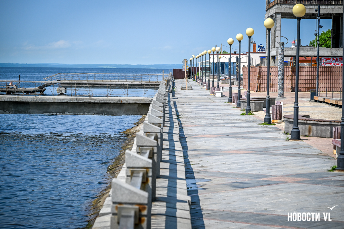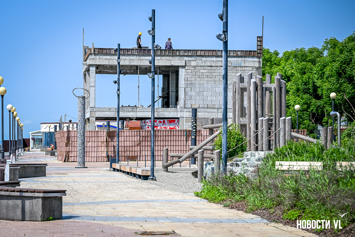 Открытая часть набережной абсолютно пустая – людей тут нет, только продолжают реконструкцию двух кафе, «Остров сокровищ» и «Клёв», которые также должны быть готовы до конца лета. Сюда же перенесли и беседку, которую недавно открывали возле океанариума.