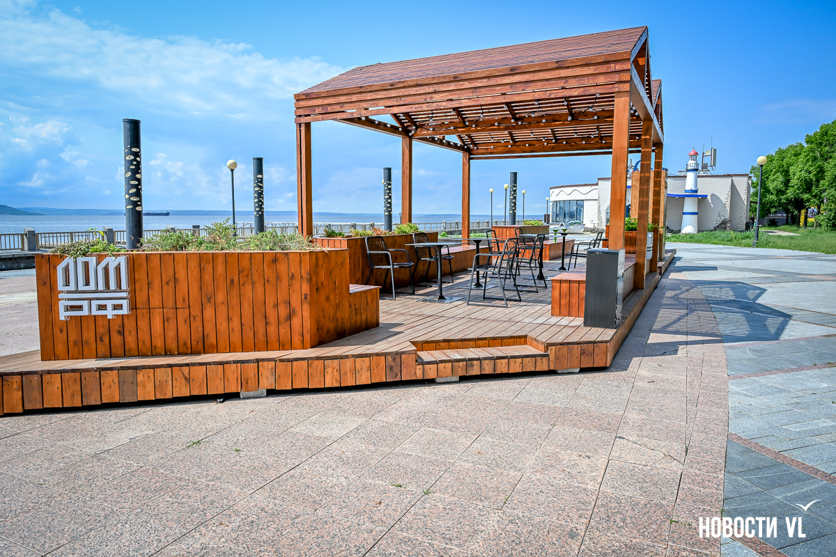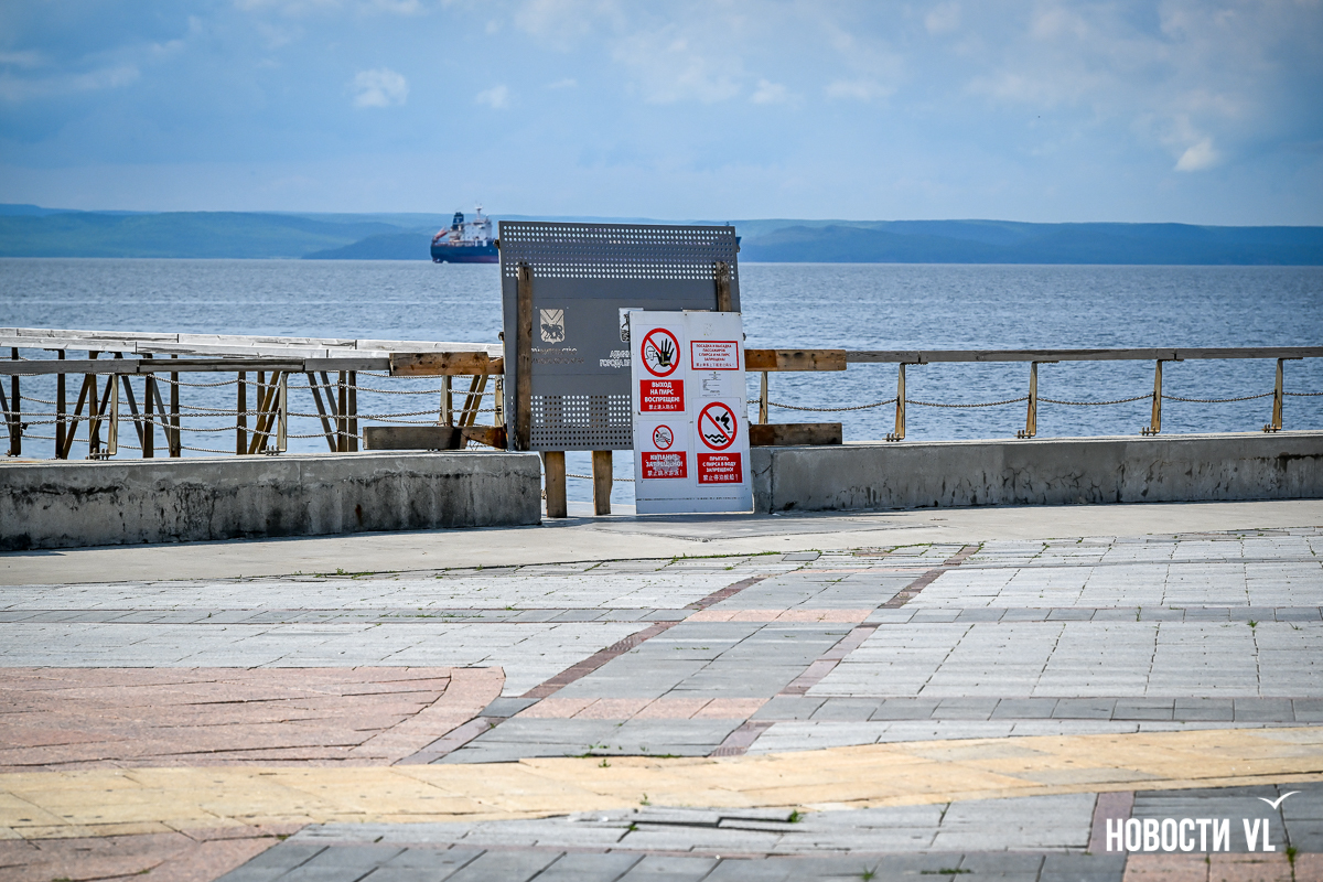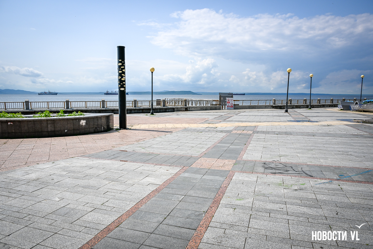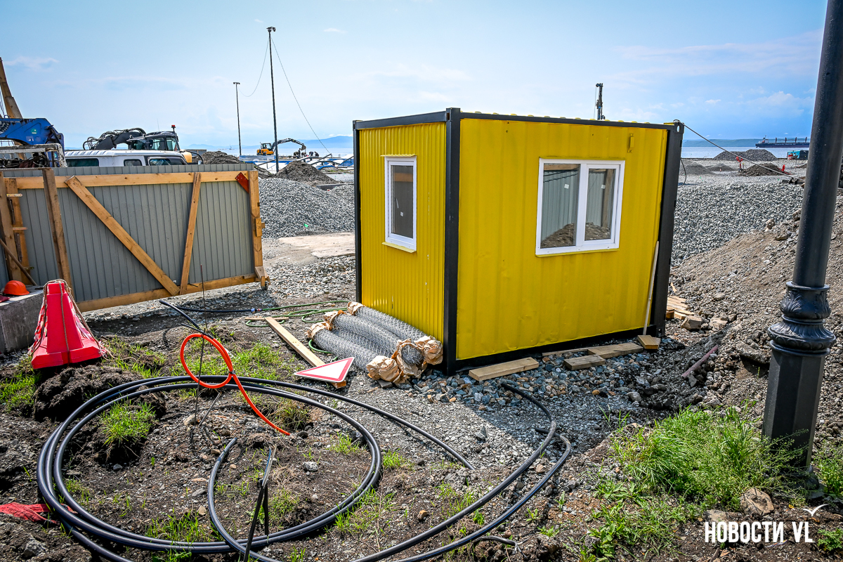Открытая часть набережной абсолютно пустая – людей тут нет, только продолжают реконструкцию двух кафе, «Остров сокровищ» и «Клёв», которые также должны быть готовы до конца лета. Сюда же перенесли и беседку, которую недавно открывали возле океанариума.