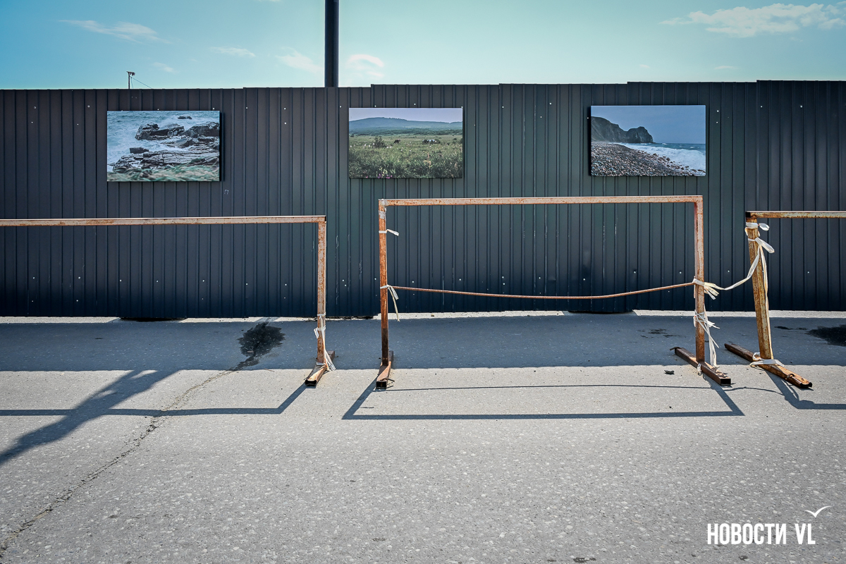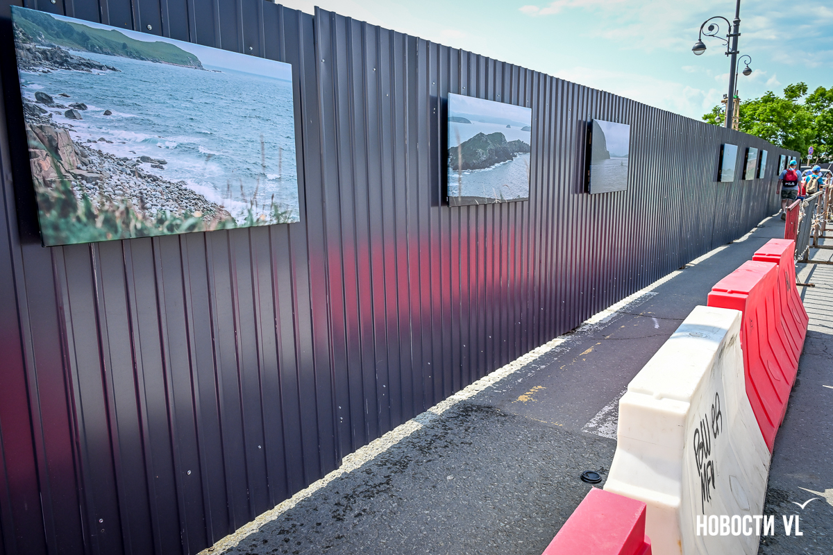 На строительном заборе повесили фотографии с видами природы около Владивостока – море, камни, цветы. Фото красивые, и парочку, судя по расстояниям между ними, уже кто-то прибрал к рукам.