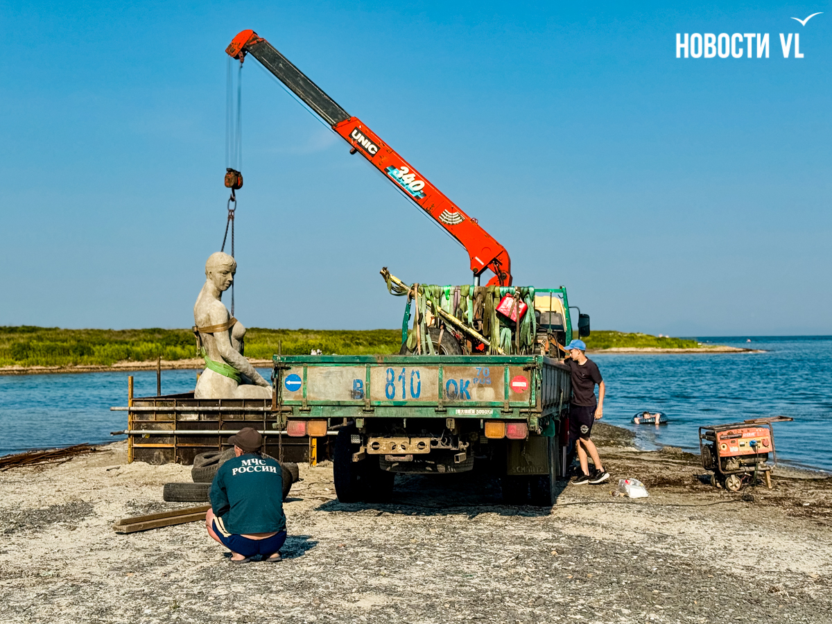 Сегодня, 24 июня, на пляж в районе мыса Ахлёстышева на Русском острове, обмотанную цепями, рабочие спустили с кузова грузовика скульптуру знаменитой русалки, которая украшала Спортивную гавань в нулевые, а потом 14 лет пролежала на дне моря. Скульптуру восстановили, но решили внезапно не возвращать на место, где её бы опять сломали льды, а поставить в зоне отлива на Ахлёстышева, чтобы она, как в сказке Андерсена, то оказывалась на суше, а то опять окуналась в море. Хвоста пока нет, обещают приделать позже.