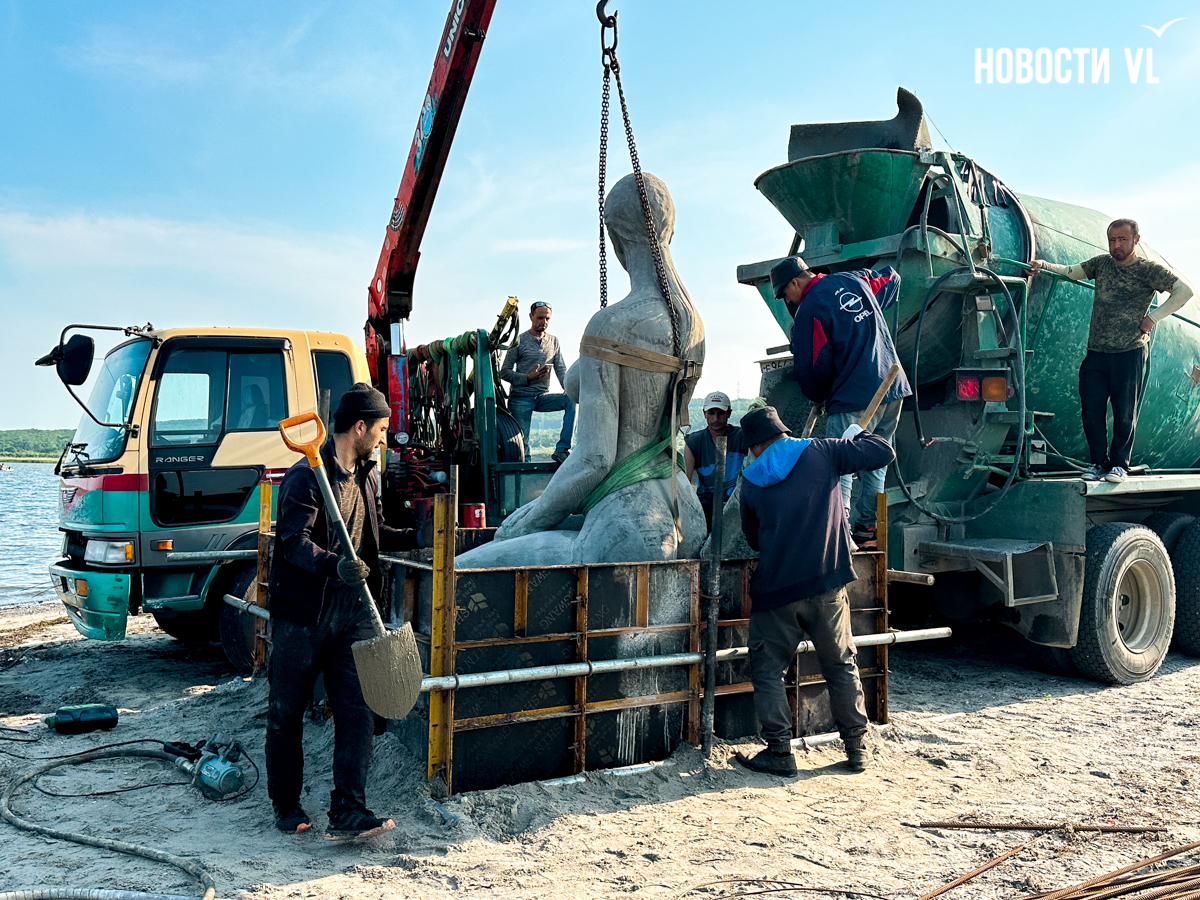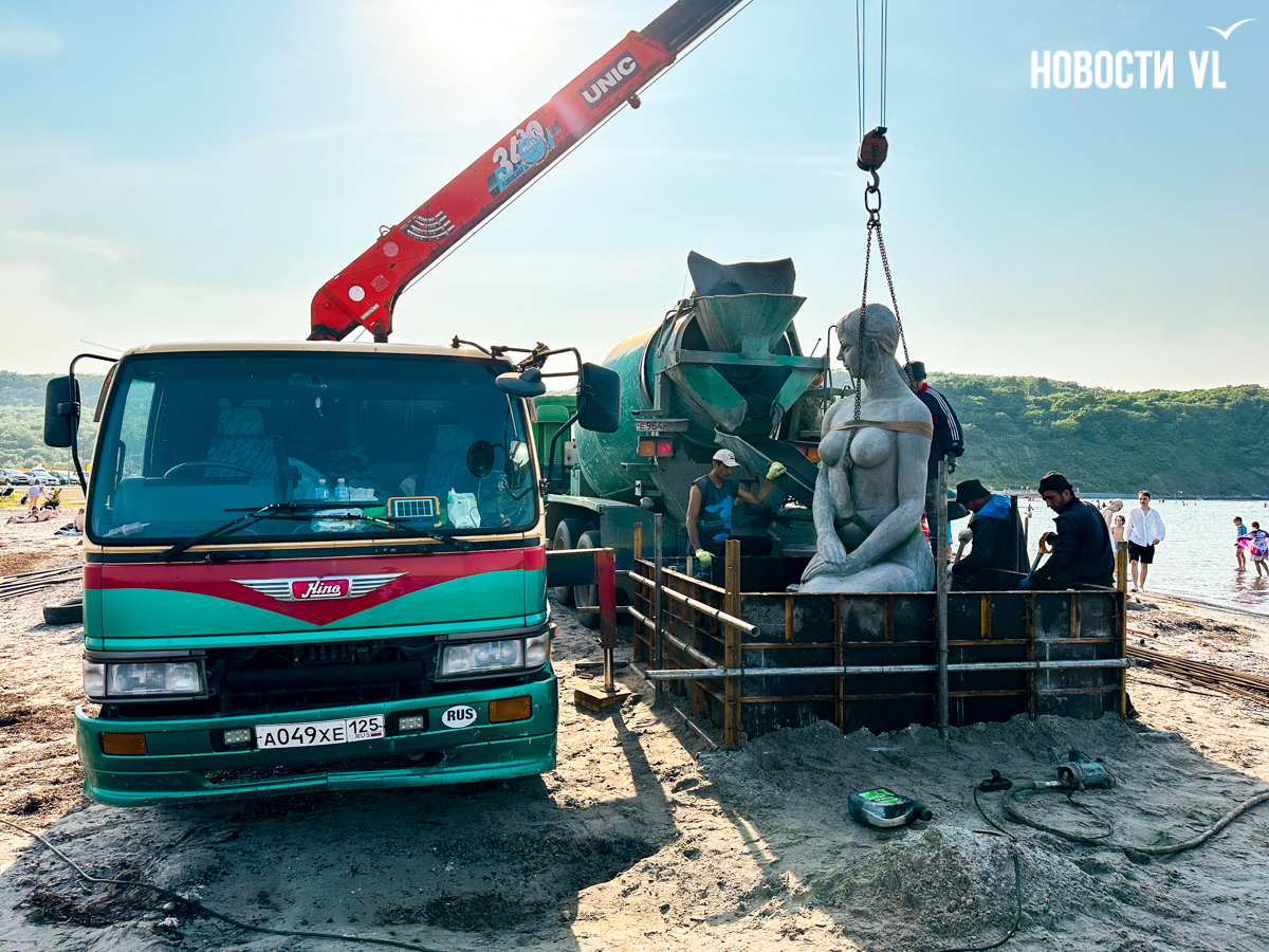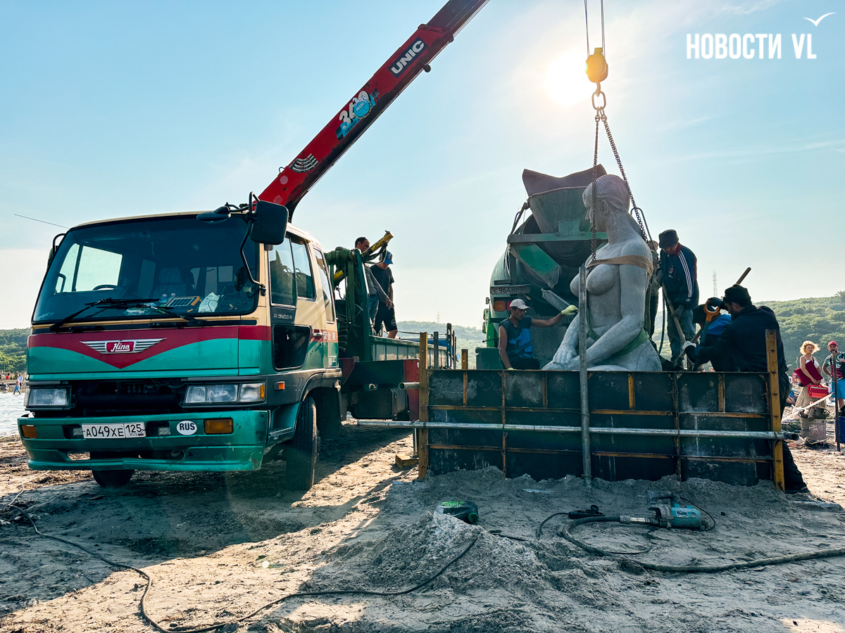 Реставрация и установка – это частная инициатива скульптора, общественников и спонсоров. Город не тратил на это бюджетные деньги. Рабочие подготовили на берегу опалубку под прямоугольный постамент, который, судя по всему, ещё предстоит залить, но саму бетонную даму сегодня на глазах отдыхающих уже установили на место. В процессе, правда, немного пострадал настил на пляже – на него заехала бетономешалка, – но повреждённые доски должны скоро восстановить.