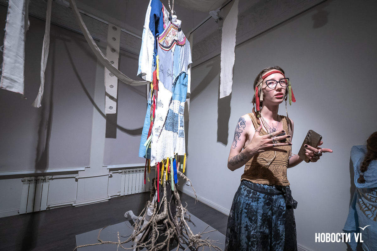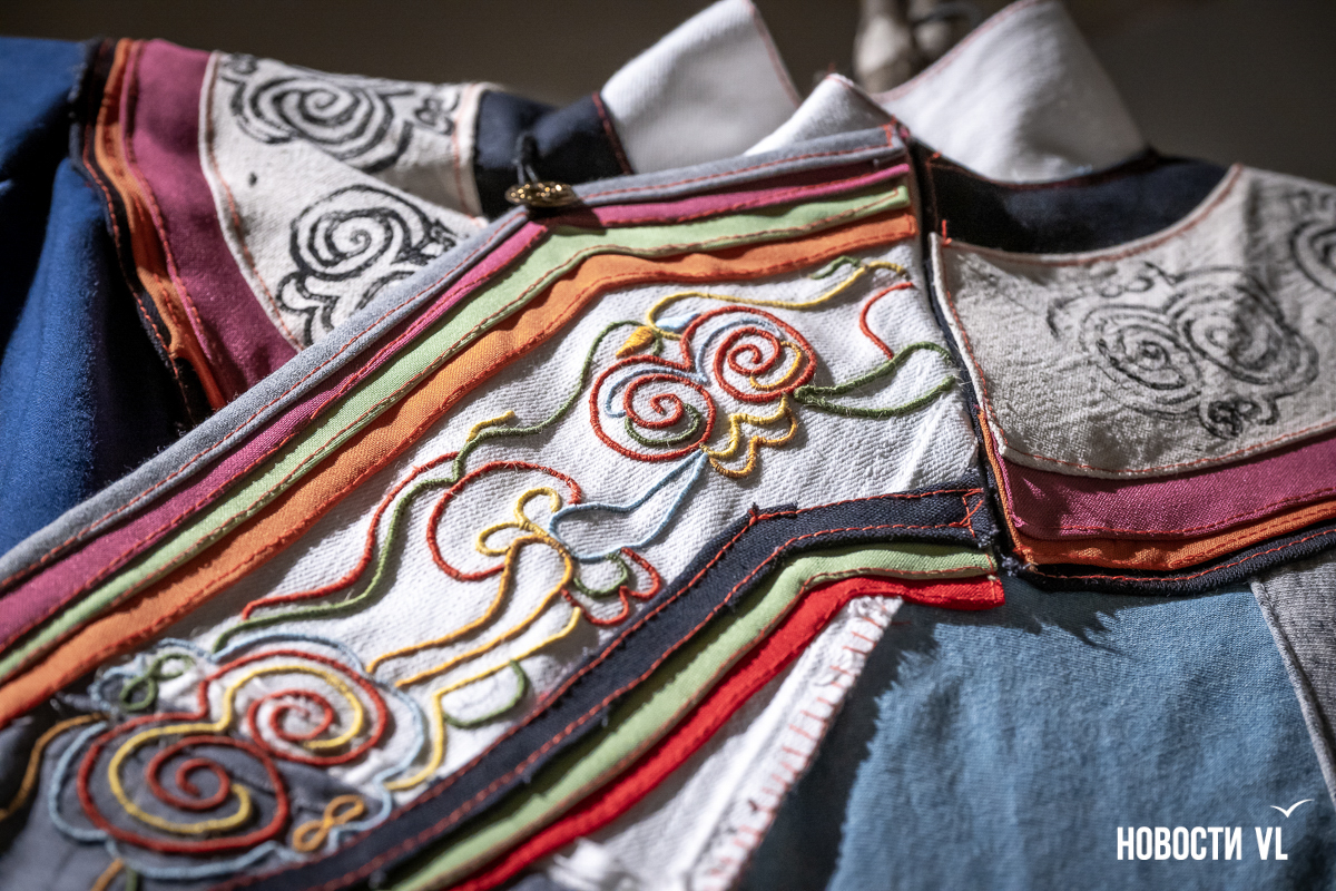 – Я могла выбрать любой народ, но выбрала удэгейцев. Мне интересна их культура – узоры, орнаменты, ремесло. Начала копаться в теме, пошла посмотреть экспозицию в музее Арсеньева, читала книги. Кусочки взяла нейтральных оттенков, добавила яркие акценты, потому что они присутствуют в этой культуре. Вот эти свисающие ленточки – сначала они использовали пёрышки, а со временем стали делать украшения из ткани. Мне нравится заниматься одеждой. Сама придумываю, создаю коллекции, делаю вышивку.