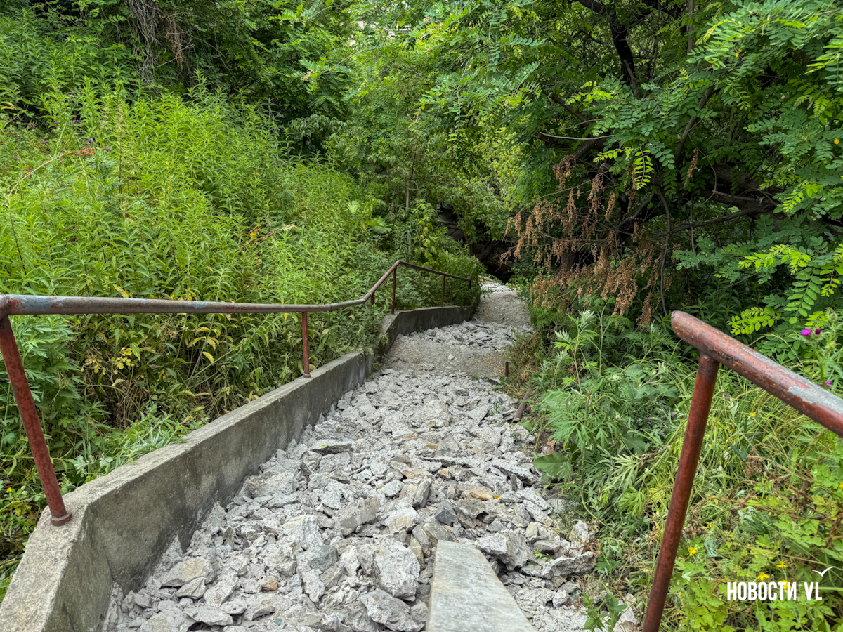 В Муниципальном центре управления города Владивостока сообщили, что участок будет закрыт до конца недели. Связано это с тем, что на лестнице сейчас производится демонтаж и сварочные работы. Пройти пешком там действительно проблематично, лестничный спуск превратился в горку, которая засыпана скальным грунтом. Однако есть те, кто перелазит через закрытые заборы на свой страх и риск.