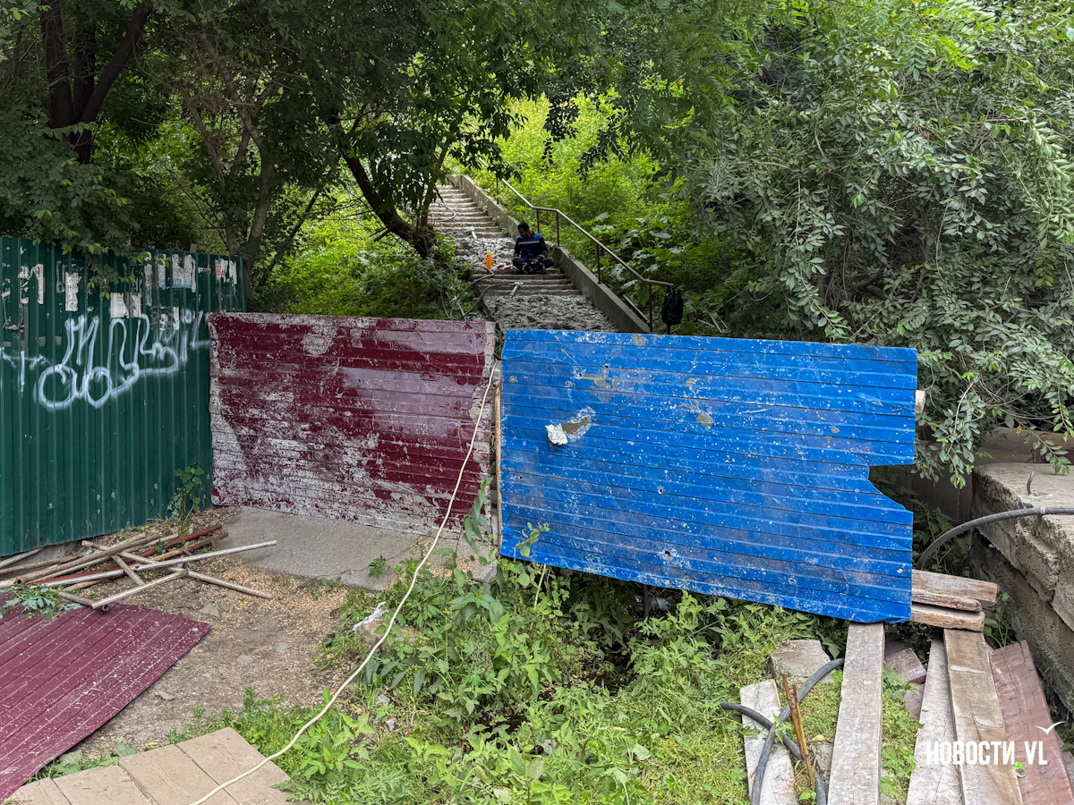 Во Владивостоке приступили к ремонту лестничного спуска в районе улицы Мыс Чумака, 1а. Из-за работ проходы на лестницу закрыли железными листами, однако обходного пути никто не предусмотрел. Рабочие подрядной организации «Союз» выступают и в роли охранников, не пуская никого пройти по привычному маршруту. Местным жителям теперь приходится идти в обход через неасфальтированную дорогу без тротуаров и частный сектор.