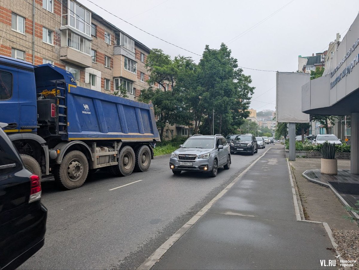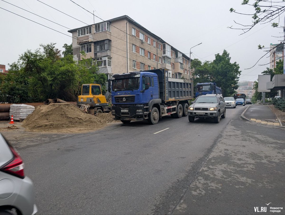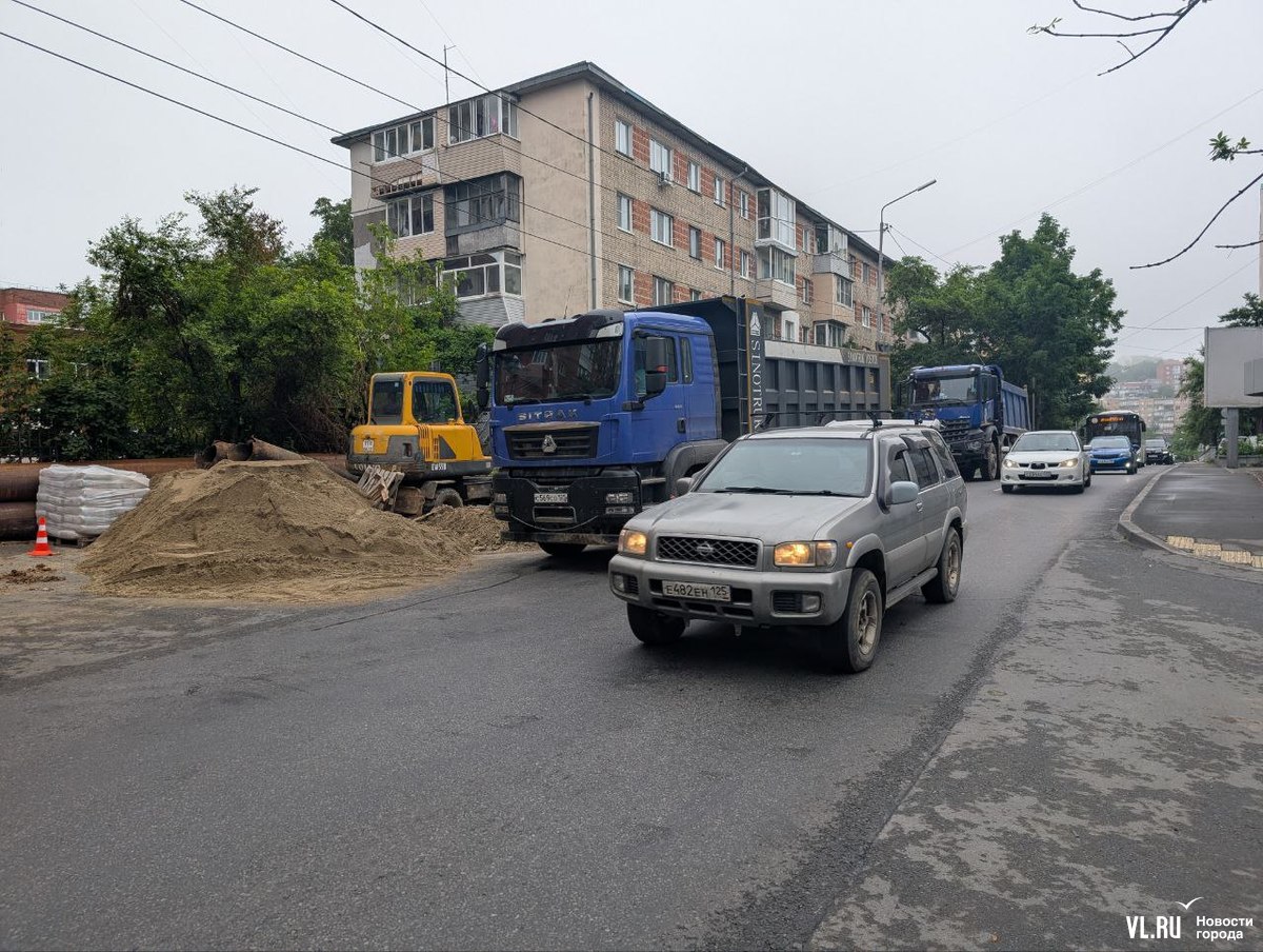 В четверг, 3 июля, в районе Бестужева, 23 во Владивостоке одну из двух полос проезжей части и пешеходную зону заняла дорожная техника, видимо, предназначенная для ремонта теплотрассы, и большие трубы. Пешеходы перебегают на другую сторону, чтобы пройти по тротуару там, а вот машины с самого утра вынуждены стоять в пробке. Через неделю этот участок должны перекрыть полностью для ремонта теплотрассы, на это время Посьетская станет двусторонней.
