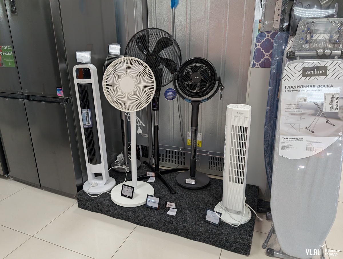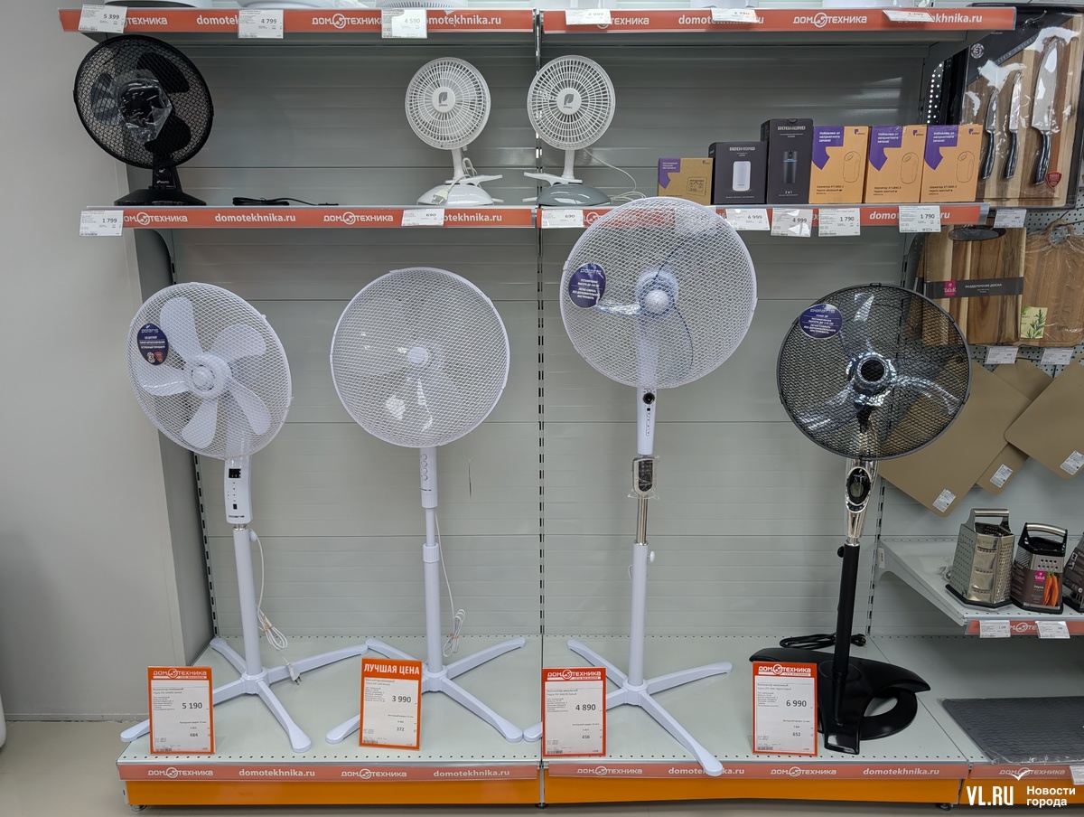 Старые добрые вентиляторы, по данным FarPost.ru, стали искать в два раза чаще с прошлым летом. Есть вентиляторы с охлаждением – испаряющие прохладную воду из специального резервуара, стоят они от 1000 рублей. Хотя сейчас воздух во Владивостоке и без того влажный. Выбор напольных вентиляторов в целом достаточно большой. За 2-4 тысячи рублей можно найти мощную вращающуюся в разные стороны дуйку с пультом и несколькими режимами работы. Например, в магазинах DNS в наличии вентиляторов почти нет, правда, ждать их придётся не так долго, как установку кондиционера, – один-три дня.