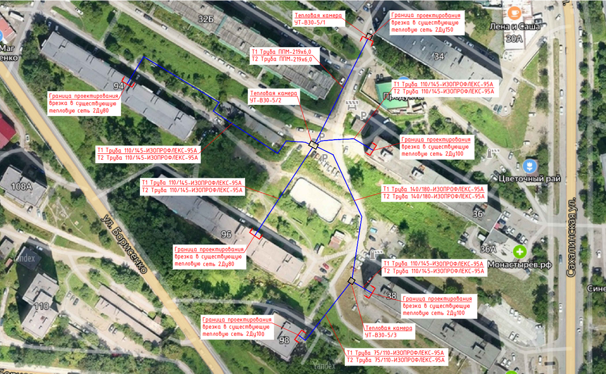 Главная камера, от которой расходится трубопровод, находится возле хоккейной коробки на Борисенко, 96. Ещё одна внешняя камера возле Сахалинской, 38. От них расходятся трубы к домам вокруг. Также замене подлежат трубопроводы в подвалах всех домов.