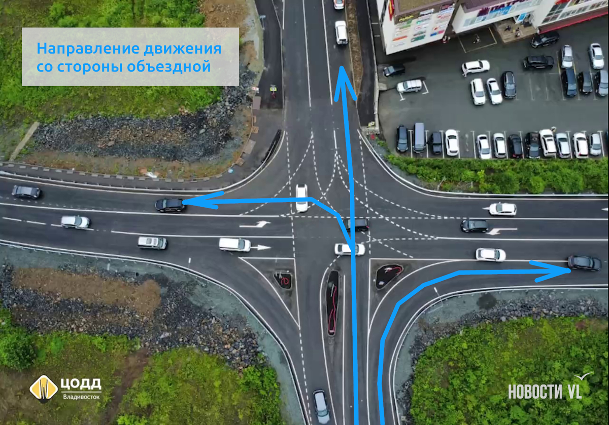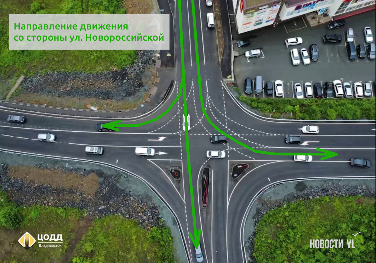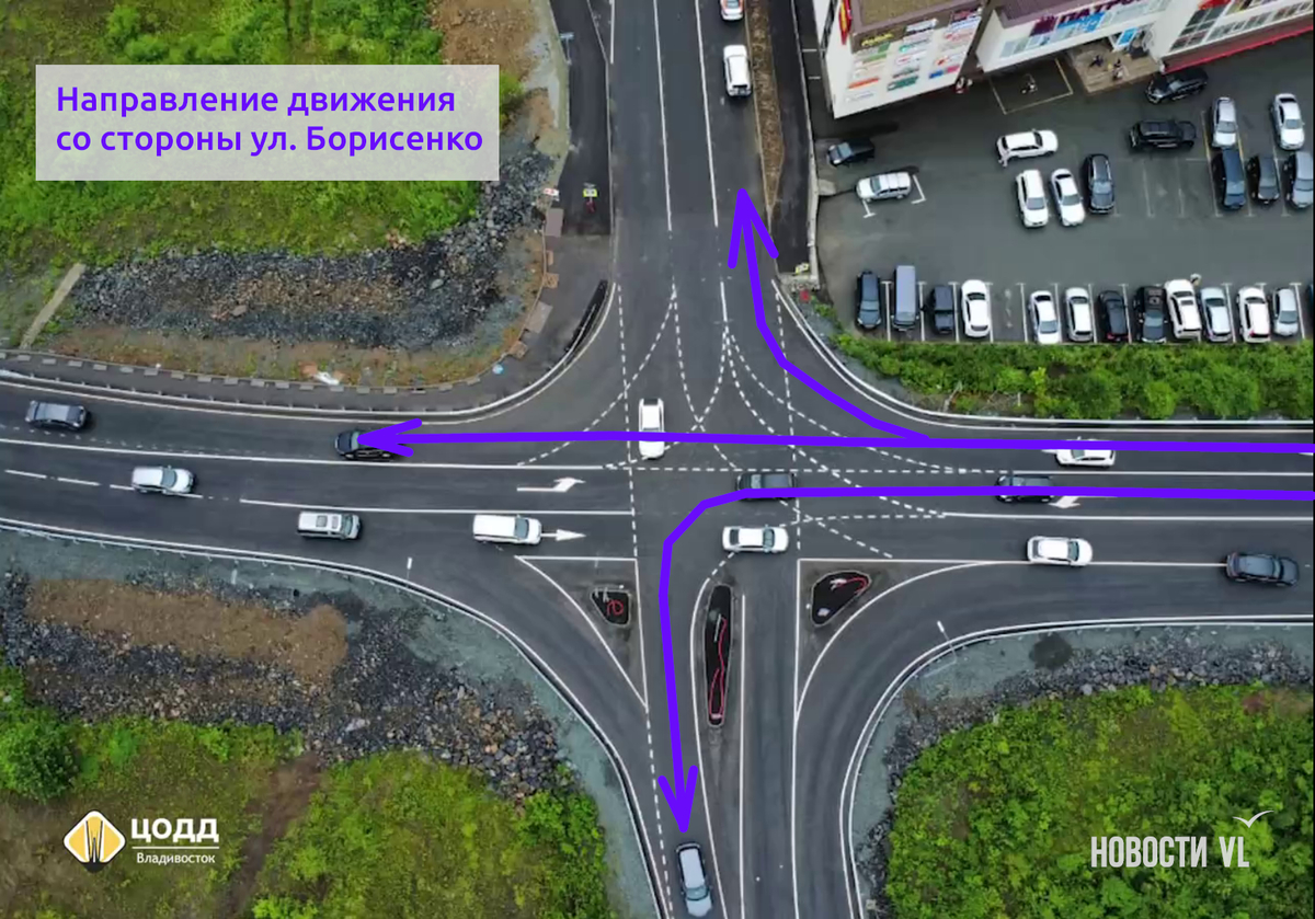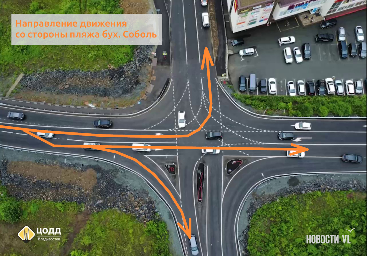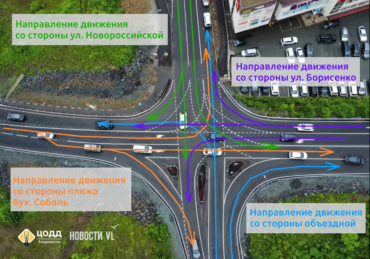 – со стороны улицы Борисенко левая полоса может ехать только налево, на развязку объездной трассы Седанка – Патрокл. Правая полоса может двигаться прямо, к бухте Соболь, а также поворачивать направо, на улицу Новороссийскую;