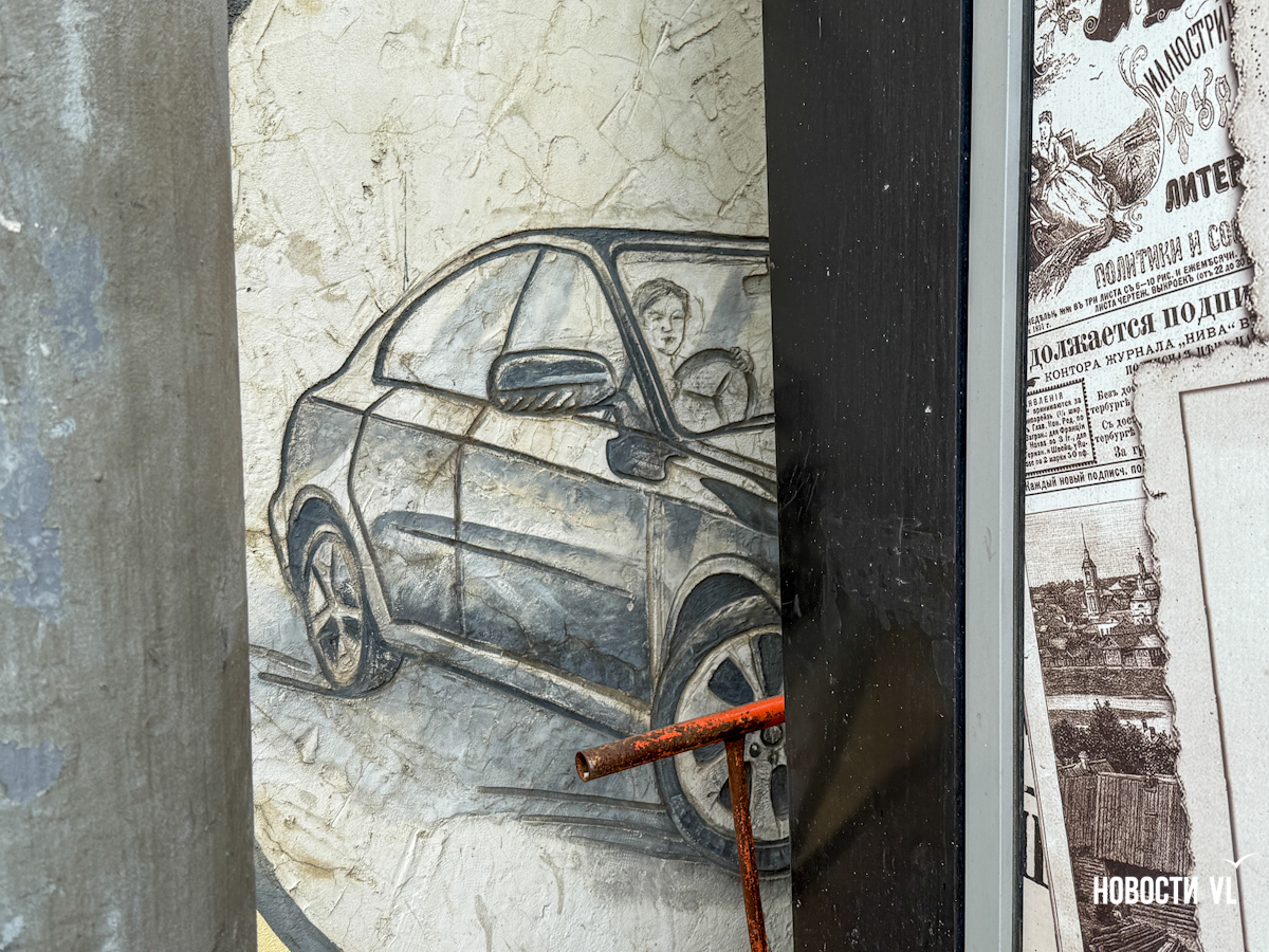 «Пока мы зачищаем всю стену, а потом будем наносить фон. Тут, помимо рисунка, есть барельефы, как этот автомобиль, – показывает художник Пётр. – В нашем рисунке его не будет, мы его залепим. Из всех барельефов мы оставим только самые крутые, которые будут вписываться в концепцию рисунка. Вы можете заметить: где есть крестик, значит, мы будем убирать [барельеф], да, он крутой, но не подходит под новый рисунок».
