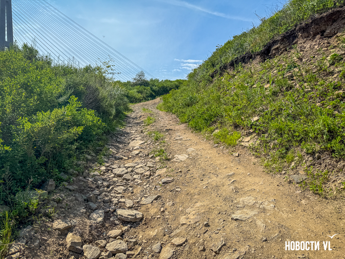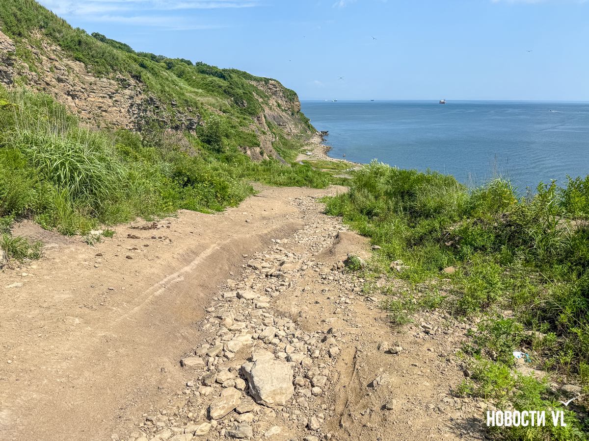 Дорога к побережью убитая, её делали в 2011 году для строительной техники, которая укрепляла берег и прокладывала водовод с материка на Русской остров. Ехать по ней решаются в основном джипы, хотя есть смельчаки на низких машинах. Попасть на пляж можно и пешком, через открытую калитку в заборе. Путь займёт около 10-15 минут. Но идти туда лучше налегке – спуск к морю довольно крутой и затяжной.