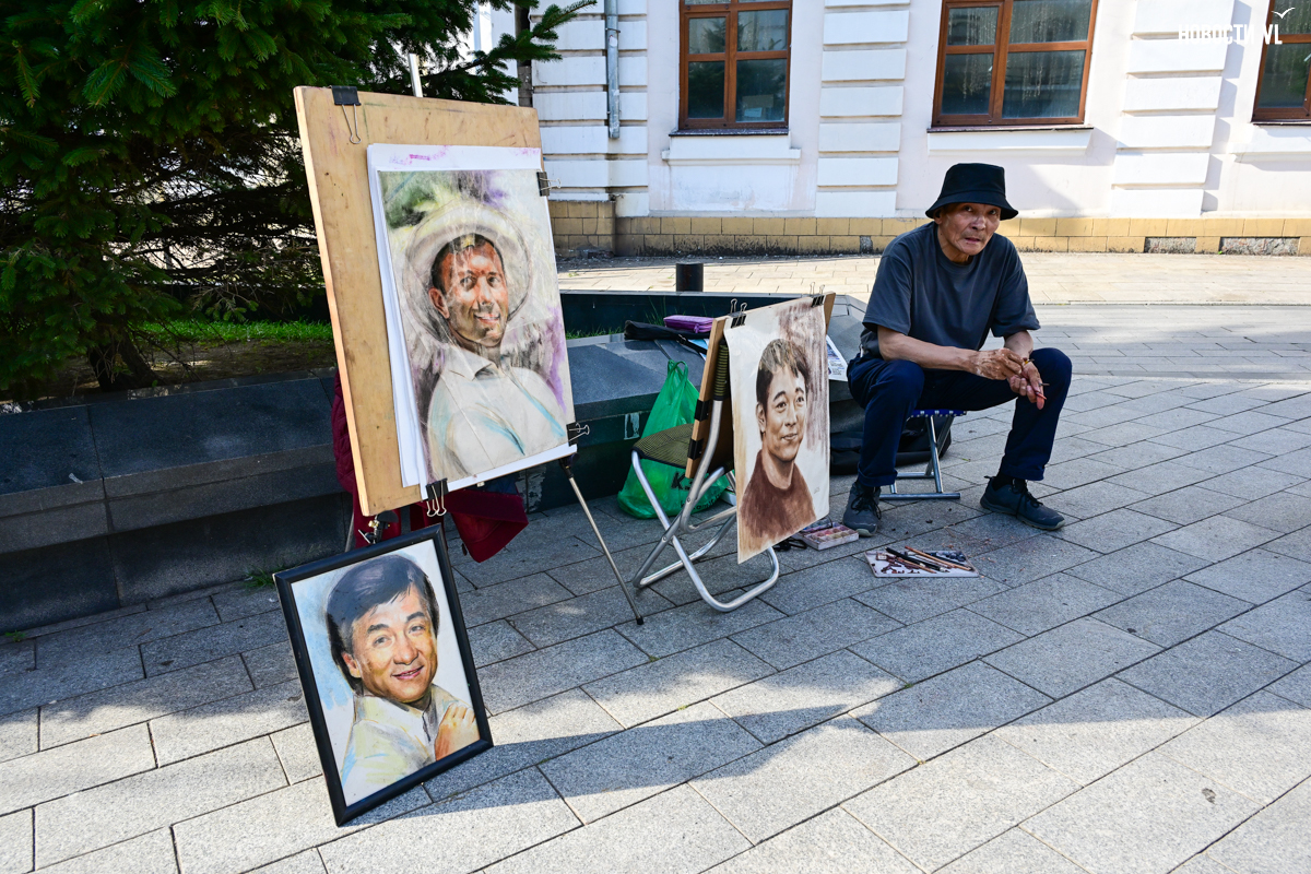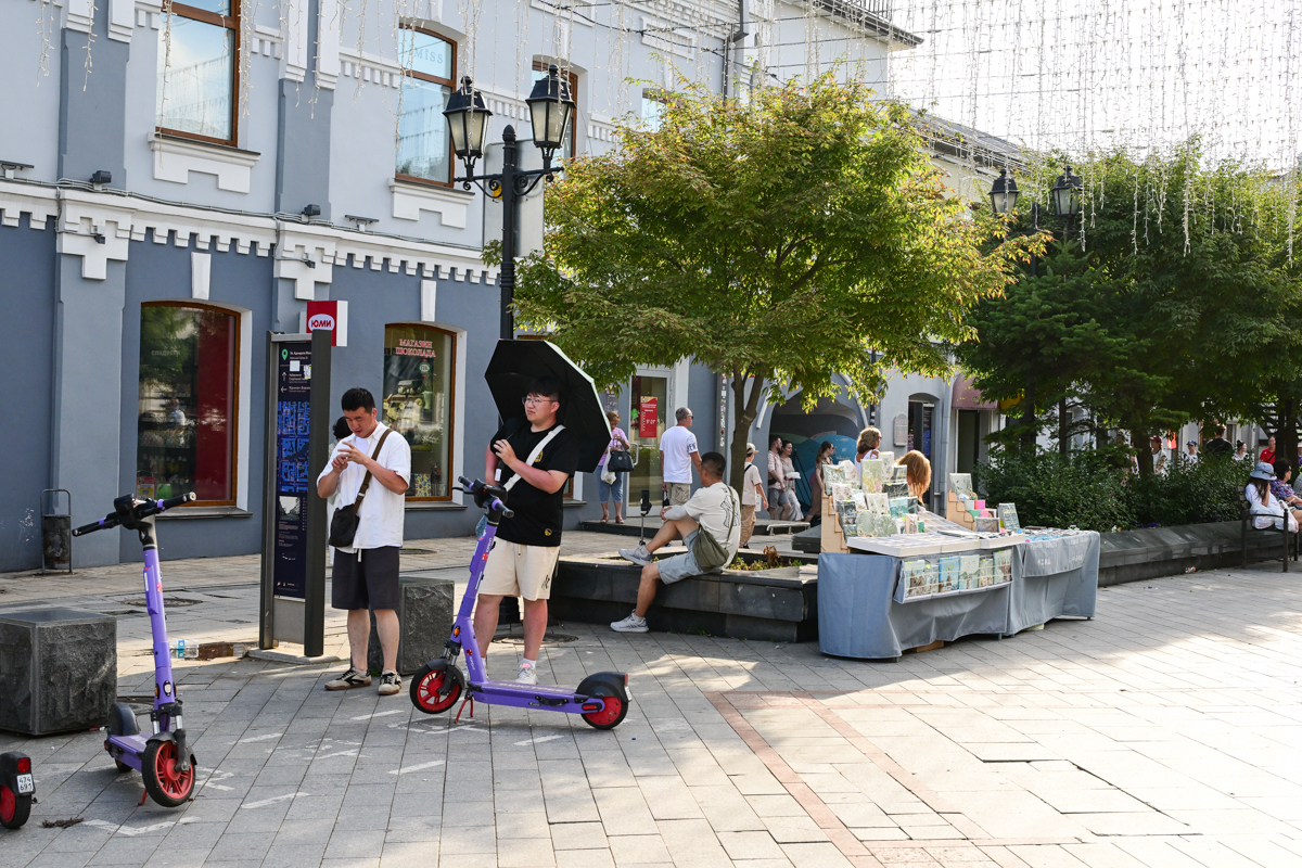 Наша прогулка по Арбату начинается от торгового центра «Алеутский» – переходим через пешеходный переход и натыкаемся на армию брошенных самокатов. Огибаем железных коней и упираемся в островок искусства – местный художник-маринист рисует и продаёт свои картины. Появляется ощущение какой-то упущенной детали в общем пейзаже – в этот день не хватало грустных пони в розовых костюмах единорогов. Возможно, их пожалели и решили не выводить под палящее солнце катать детей по плитке мимо исторических зданий бывшей Пекинской улицы. То же самое пекло отправляет детей купаться в фонтаны. По понедельникам они традиционно не работают, хотя в последнее время не только по понедельникам – из-за шутников, засыпающих в фонтаны стиральный порошок.