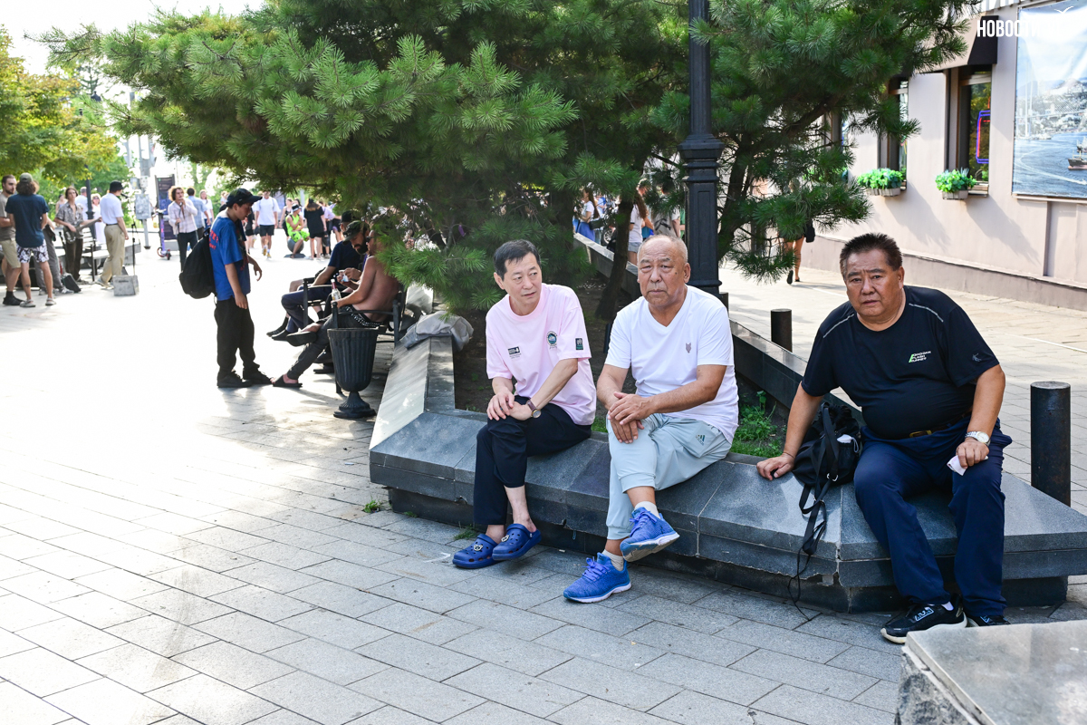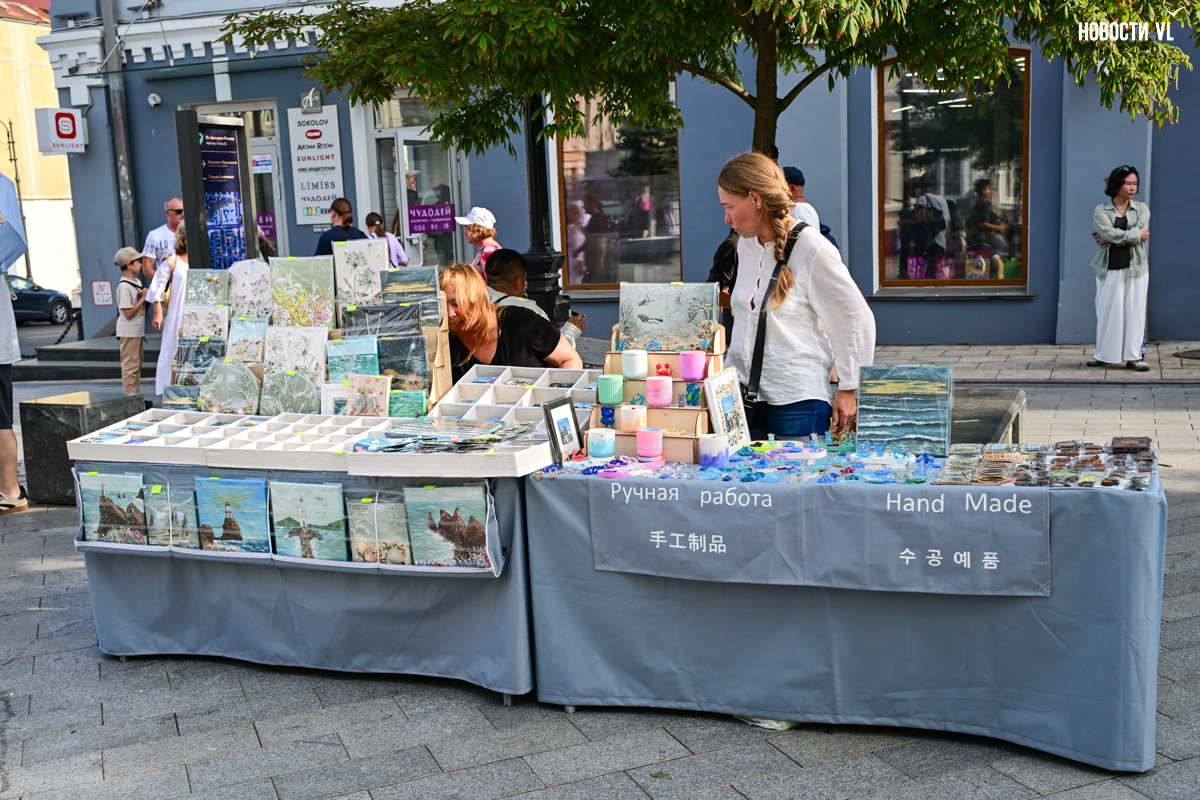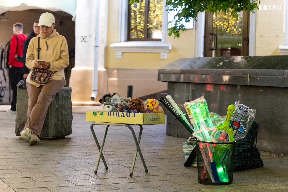 На месте – открывающиеся каждое лето торговые точки. Одна из них специализируется на «китайщине» – неоригинальных монстров-лабубу всевозможных размеров, ободках, шарах, машинках и ещё чём-то ярком и пластиковом. Продавец неохотно отвечает на вопрос о том, как идёт торговля, но, по всей видимости, очень неплохо – за последние пару недель лавка выросла от стула и корзины со светящимися палками до целого стола с баулами всякой всячины. На соседней более «капитальной» торговой точке лежит скатерть с надписью «ручная работа» на русском, корейском и, разумеется, китайском языках – продают картины, фигурки и свечи. На набережной Спортивной гавани выделили небольшой участок под таких продавцов, но тут, видимо, конкуренции меньше.