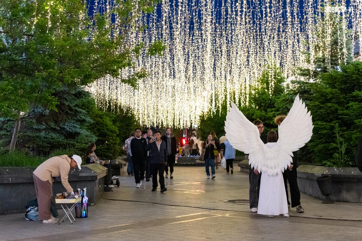 Сидеть неприятно не только из-за благоуханий с разных сторон, но и из-за опасности быть пойманным клоуном из фильма «Оно», Ститчем, котёнком из мультфильма «Три кота» или ангелом. Аниматоры подходят, машут и предлагают сделать фото, могут и по всему Арбату с вами прогуляться с той же целью. Приходится предупреждающе махать руками, убегать или платить за фото от 300 до 1000 рублей.
