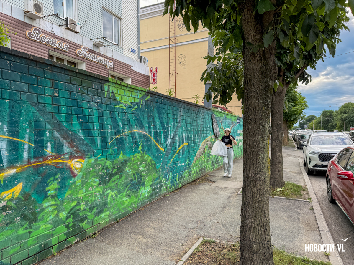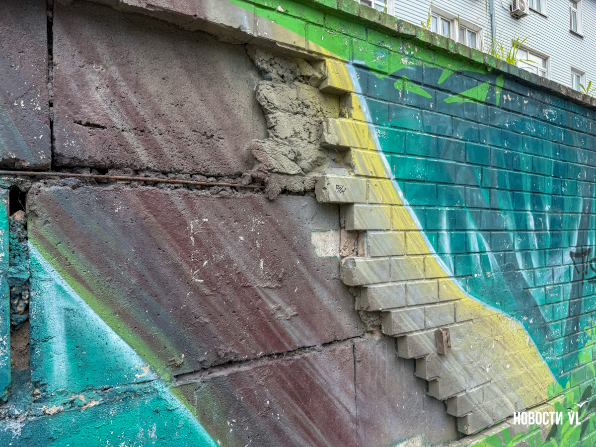 Рисунки неплохо замаскировали неприглядные места, но со временем стали облезать, кое-где их покрыли надписи баллончиком и объявления. Стену решили не просто перекрасить, а подремонтировать. Для этого сейчас ищут подрядчика, а на работы готовы выделить 4,5 млн рублей.