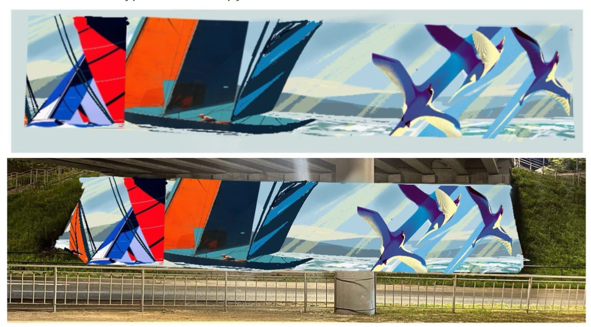 Автор мурала «Сёрферы» Ксения Илларионова оформит подпорную стену моста «Дружба» в районе улицы Гоголя. Её работа посвящена морскому пейзажу с сёрферами и волнами.