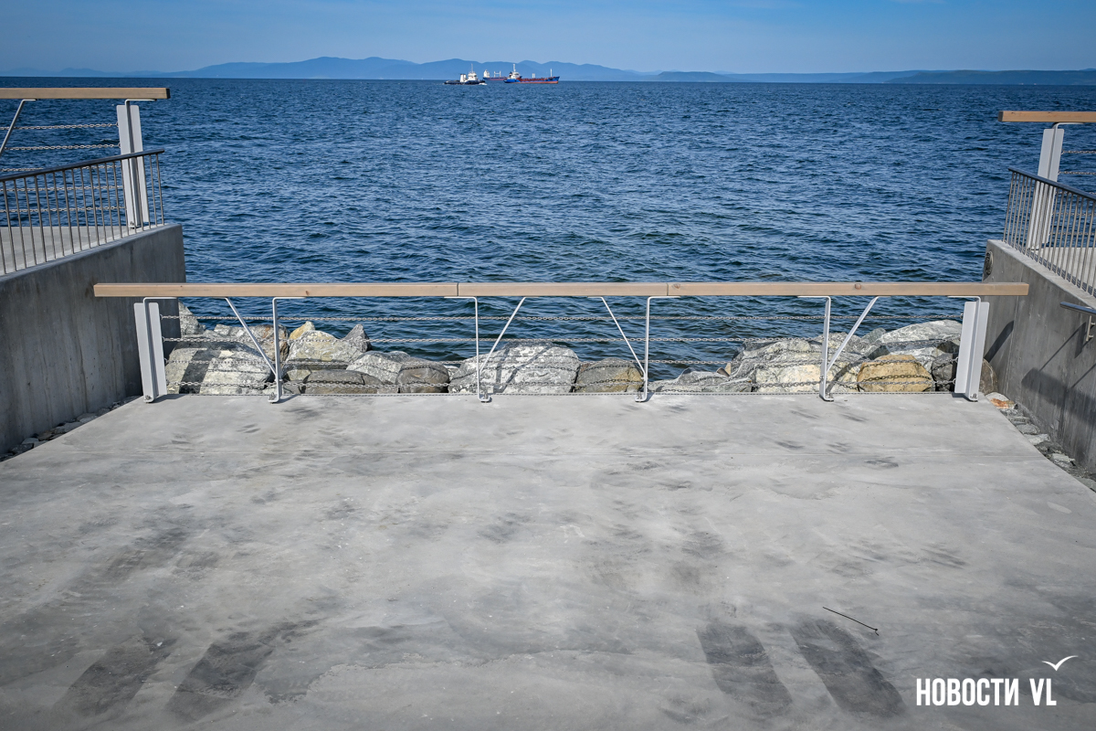 Старый аварийный пирс демонтировали, но спуск к нему решили оставить. Но не ступенями, а в виде пандуса, при этом добавив скальник. Камни частично погружены в воду. Получилась необычная фотозона.