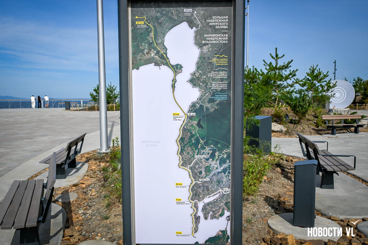 В конце парковочного, а теперь уже «пешеходного расширения» установили стенд, который декларирует очень амбициозные планы – непрерывную набережную/марафонский маршрут вдоль Амурского залива от маяка до посёлка Угловое – это как раз 42 км пути. Альтернативный будущий маршрут для бегунов – от маяка через низководный мост до Вольно-Надеждинского. Здесь же синим пунктиром отмечены перспективные направления в развитии набережных речек – Первой, Второй и Объяснения.