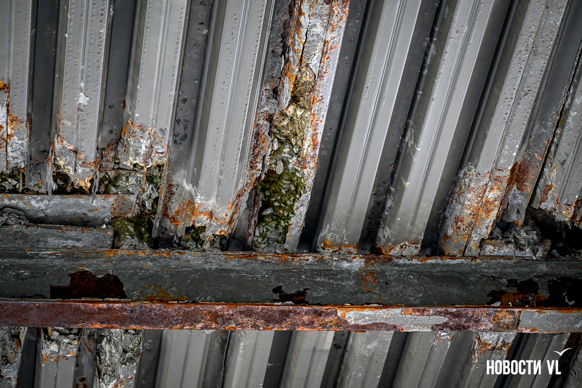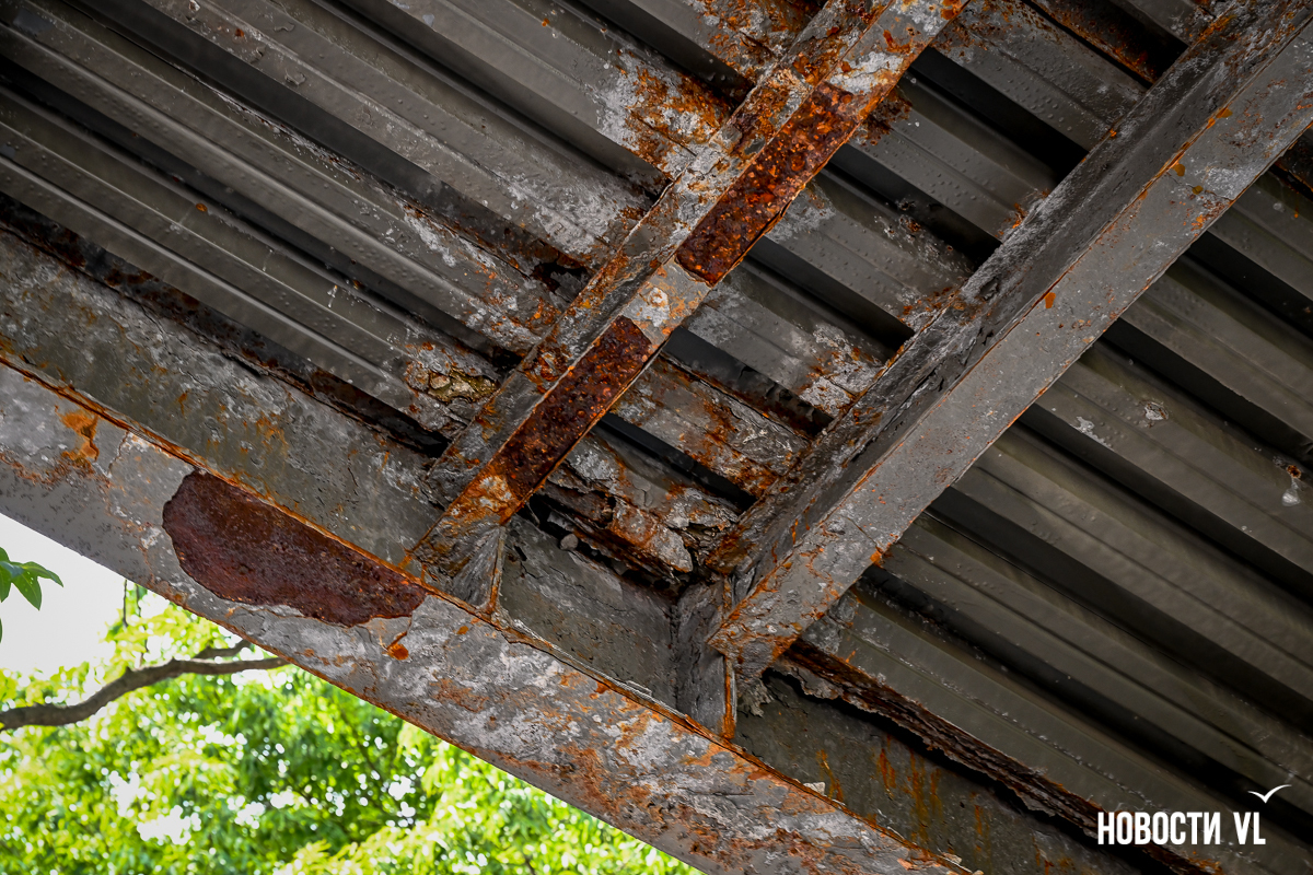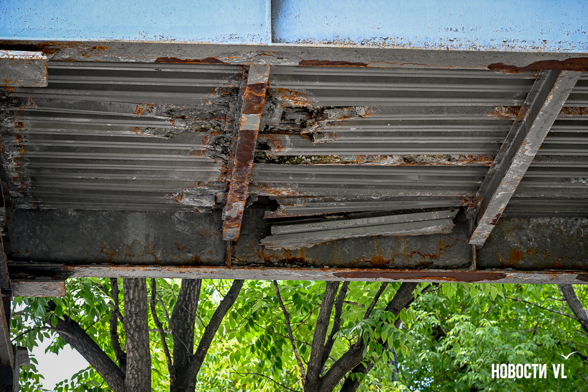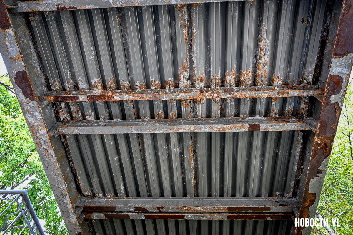 Здесь есть небольшие повреждения на лестничных маршах и площадках между ними. Но хуже всего сейчас здесь выглядят перекрытия виадука из стальных швеллеров – они сильно проржавели. Лежащие на них железные листы тоже в очень большой коррозии. Есть пара мест, с которых по виду скоро могут упасть большие куски металла. Пока что на асфальтированный тротуар падают маленькие куски ржавого металла.