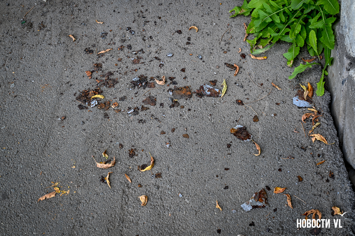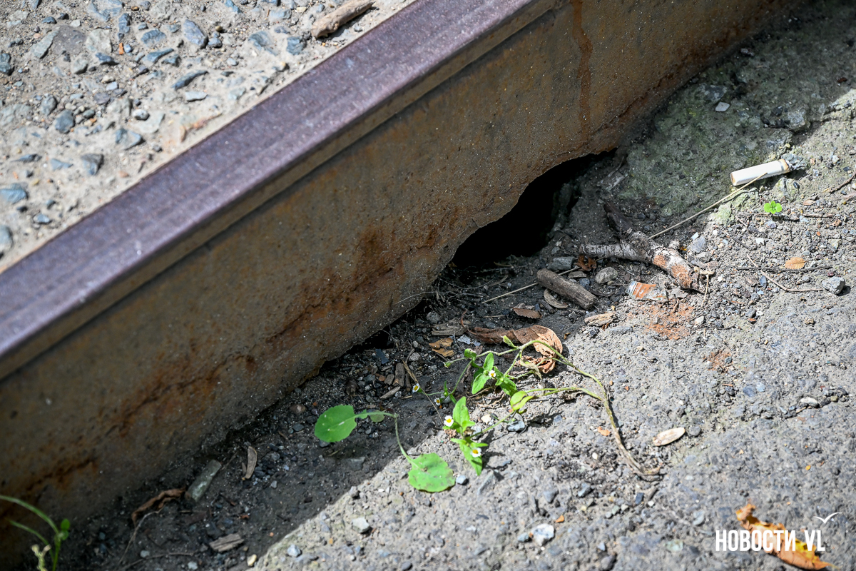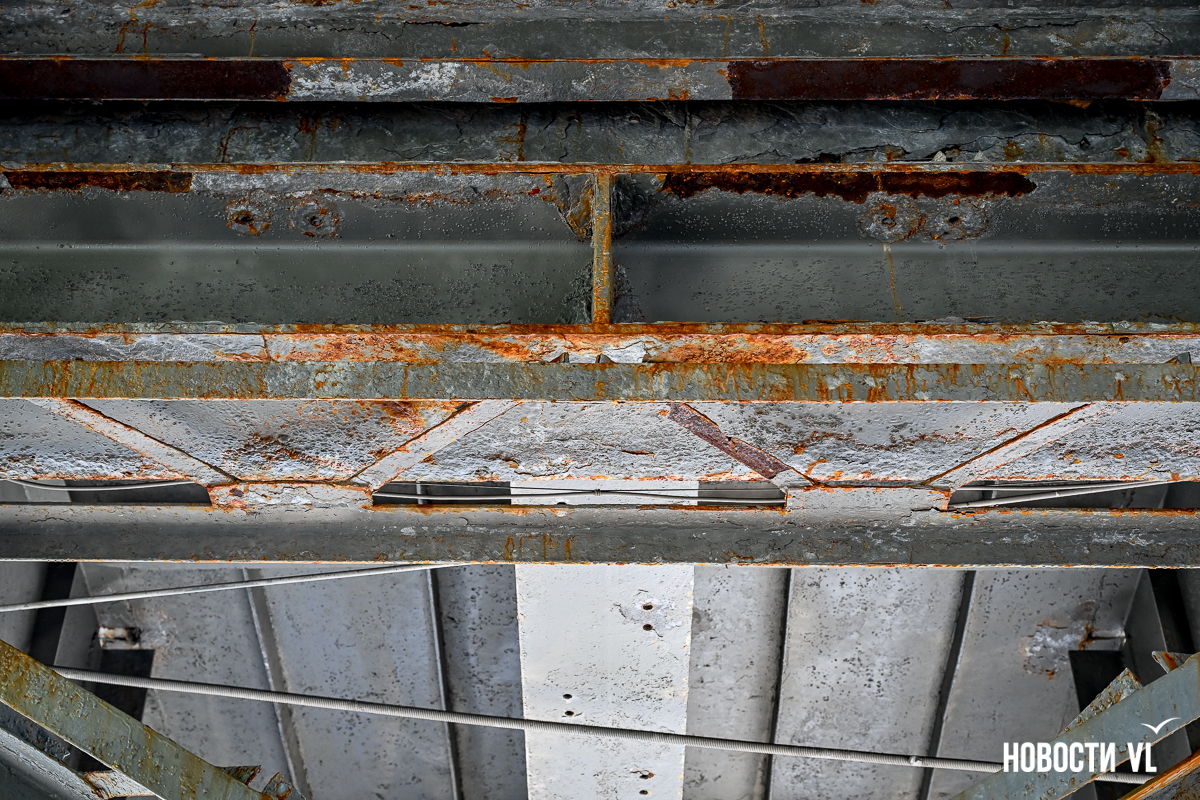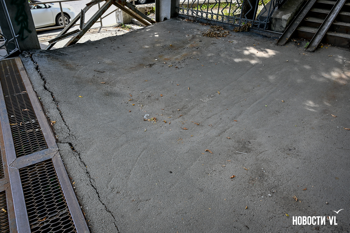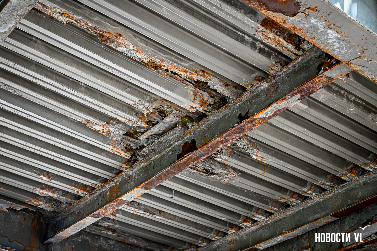 Здесь есть небольшие повреждения на лестничных маршах и площадках между ними. Но хуже всего сейчас здесь выглядят перекрытия виадука из стальных швеллеров – они сильно проржавели. Лежащие на них железные листы тоже в очень большой коррозии. Есть пара мест, с которых по виду скоро могут упасть большие куски металла. Пока что на асфальтированный тротуар падают маленькие куски ржавого металла.