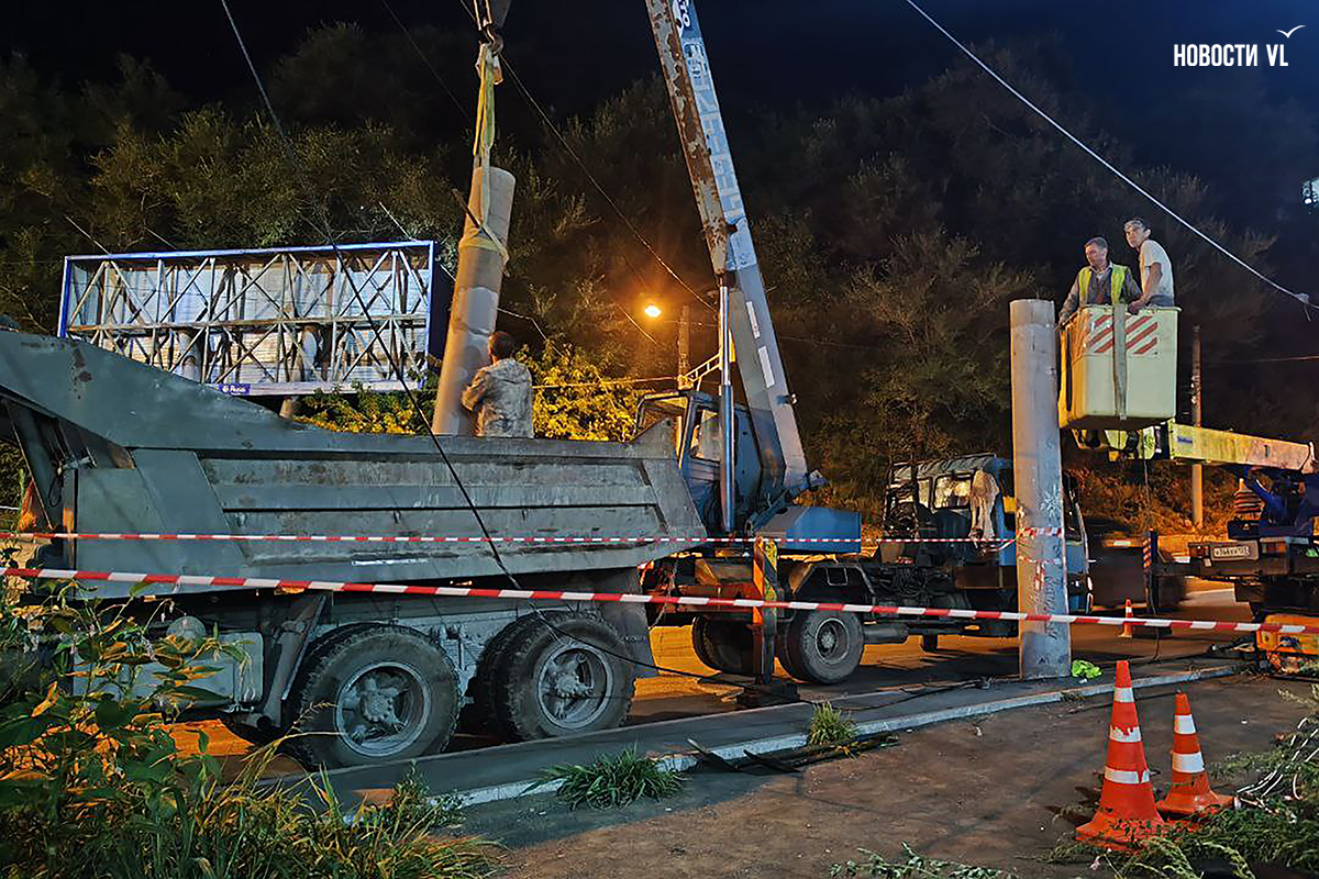 Видимо, вопрос всё-таки решился. В ночь на 21 августа бригада рабочих демонтировала столб на Дальпрессе. Провода с него сняли и перевесили на соседние опоры, сам объект разобрали, основание спилили вровень с тротуаром и подсыпали щебнем.