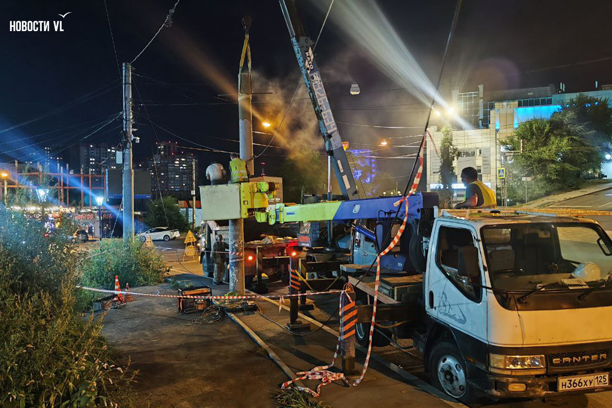 Старые столбы, оставшиеся от контактной сети трамваев, начали убирать во Владивостоке. В ночь на 21 августа демонтировали один такой в районе Дальпресса. Он примечателен тем, что стоит ровно посреди тротуара, обустроенного застройщиком ЖК «Атлантикс Сити». Почему-то при строительстве убирать столб или обходить его не стали. Сейчас проходу пешеходов здесь почти ничего не мешает, хотя осталась засыпанная щебнем яма. Работы по демонтажу обещают продолжить, но пока не сообщают следующие точки.