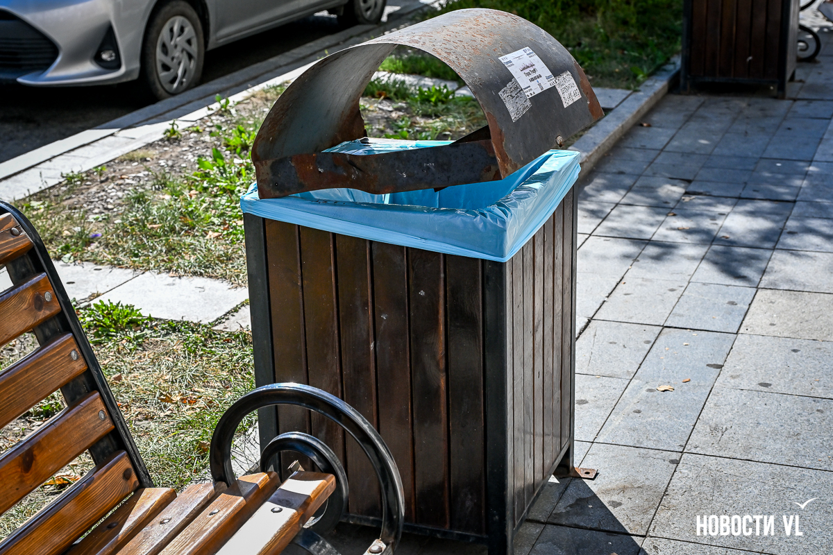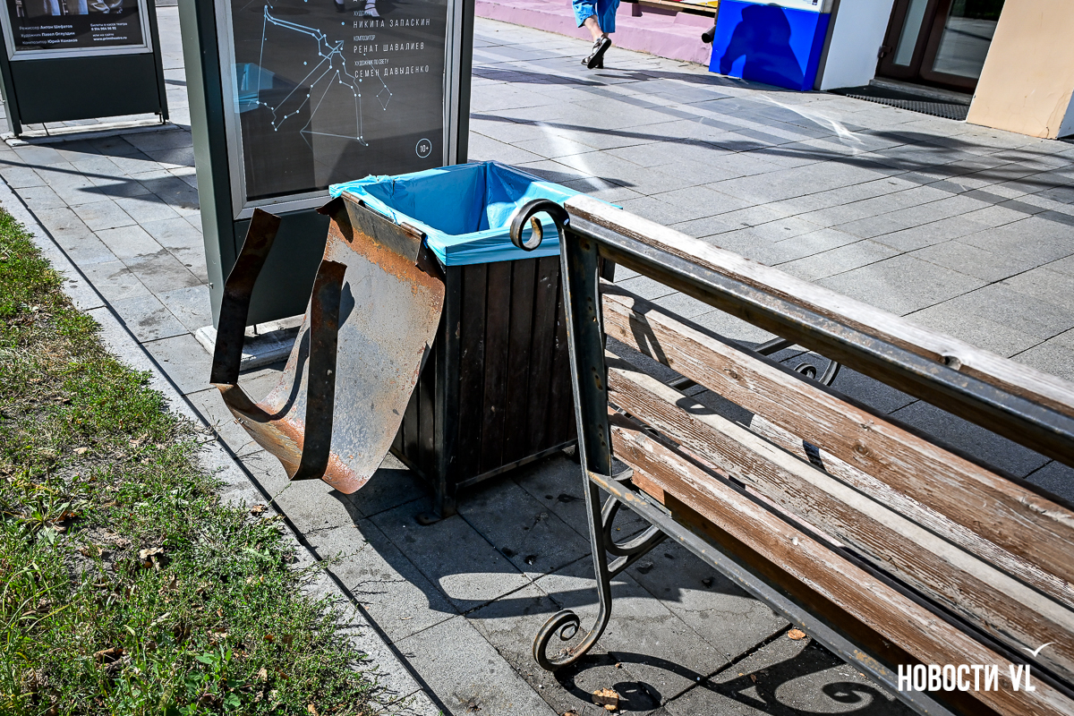 Почти всё, что есть металлического на главной улице города, помято, пробито или заржавело. Разномастные урны – с закрытыми козырьками, открытыми или вовсе без оных, правда, заправлены свеженькими яркими мусорными пакетами. Деревянные детали лавок и урн, если ещё сохранились, выглядят так, будто пережили не одну сотню лет – поломаны и исцарапаны.