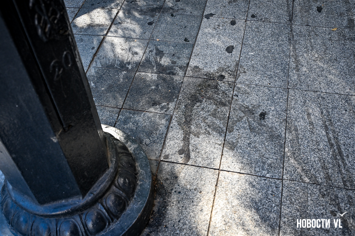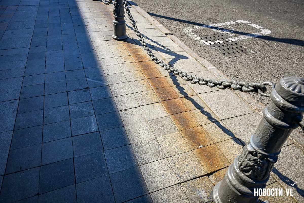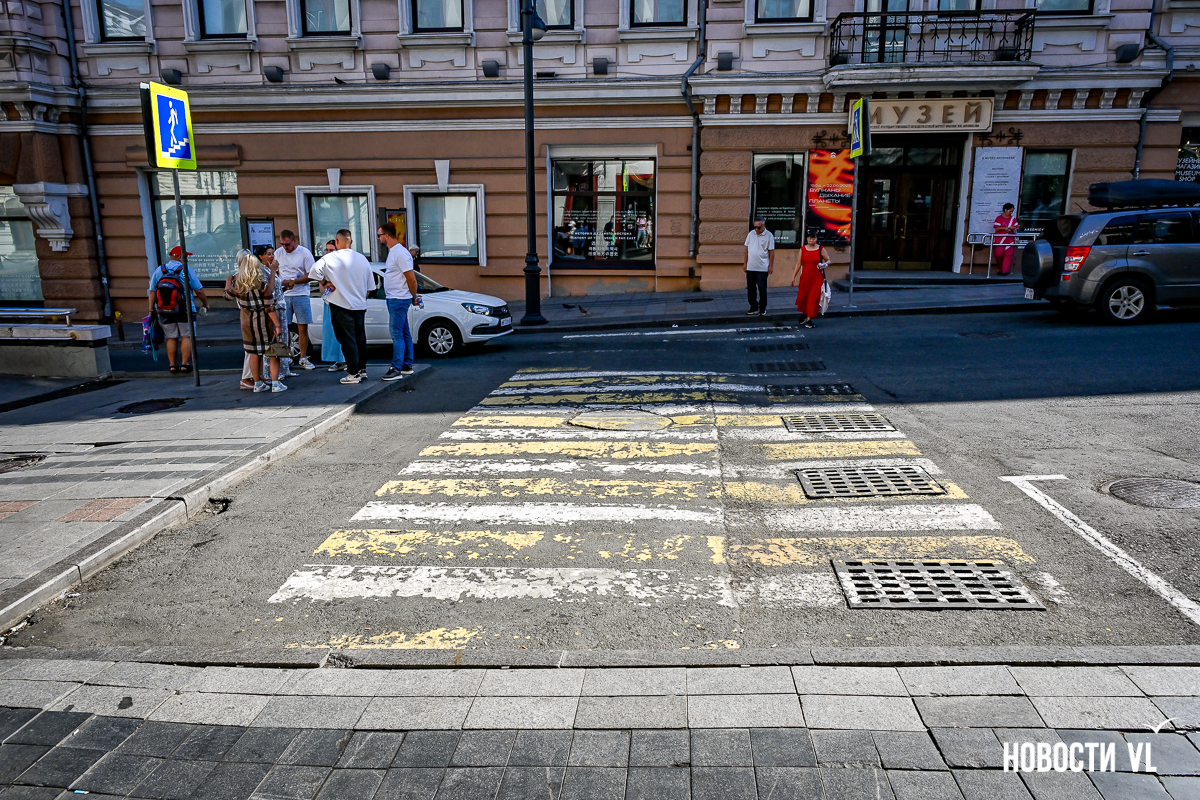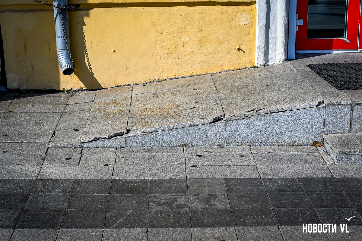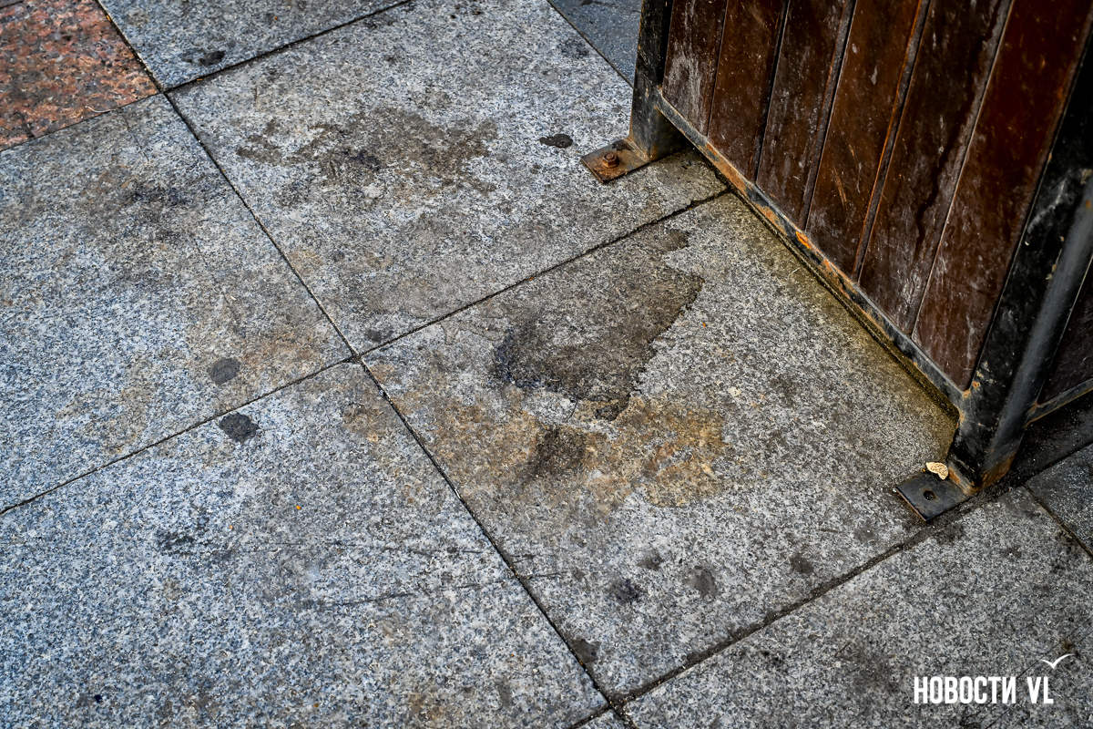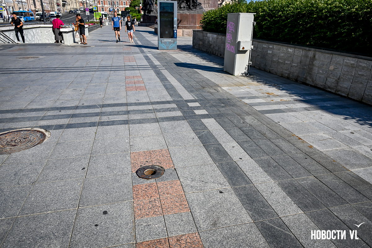 Вода, капающая со зданий, декоративных цепей и водоотливов, приносит на гранитную плитку частицы коррозии, добавляя ещё и грязно-рыжих разводов. В районе музея Арсеньева выходящих из подземного перехода встречает облезший, уже почти невидимый пешеходный переход. Бело-жёлтая краска ещё угадывается там, где машины не ездят. Но в полосе для движения от неё ничего не осталось.