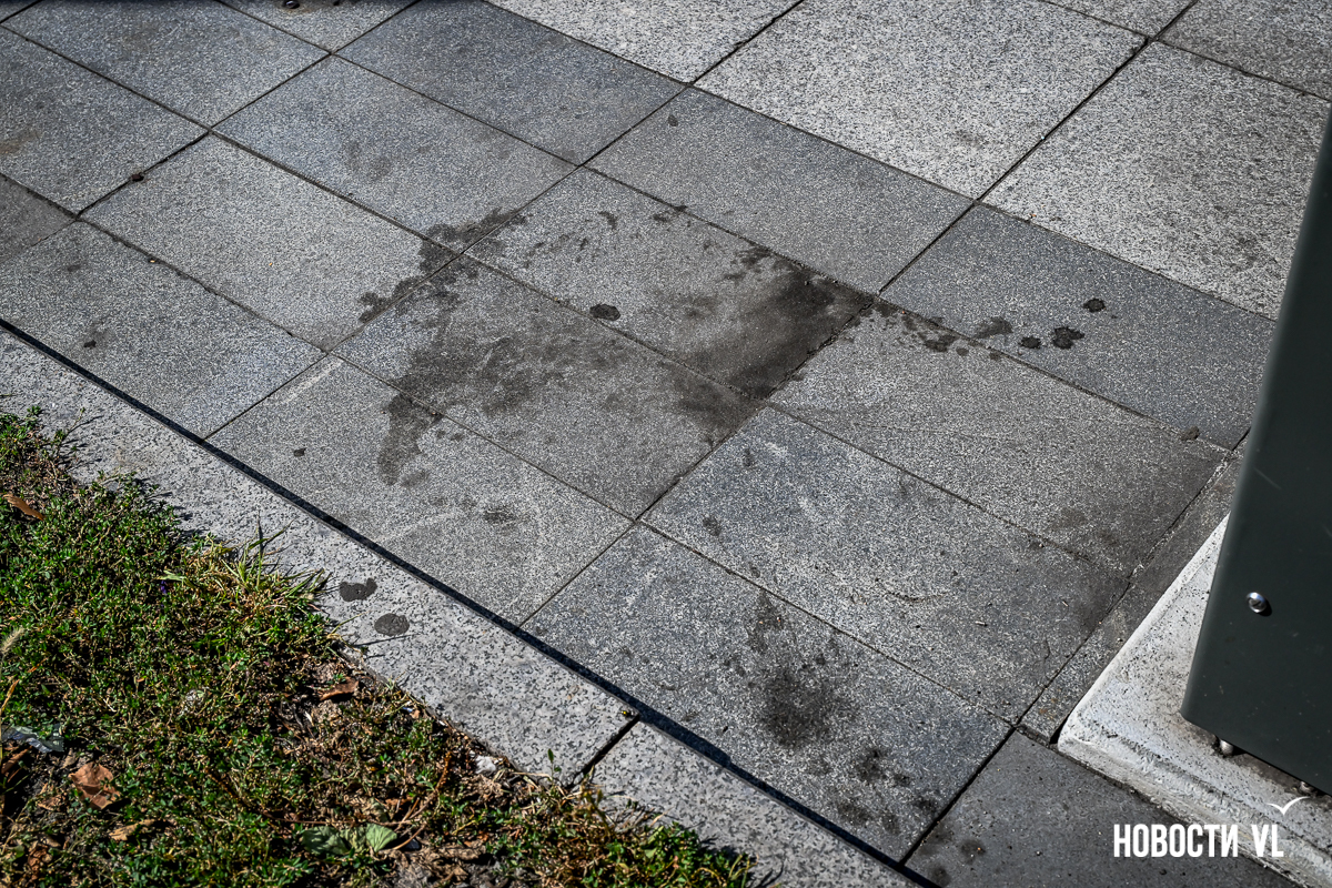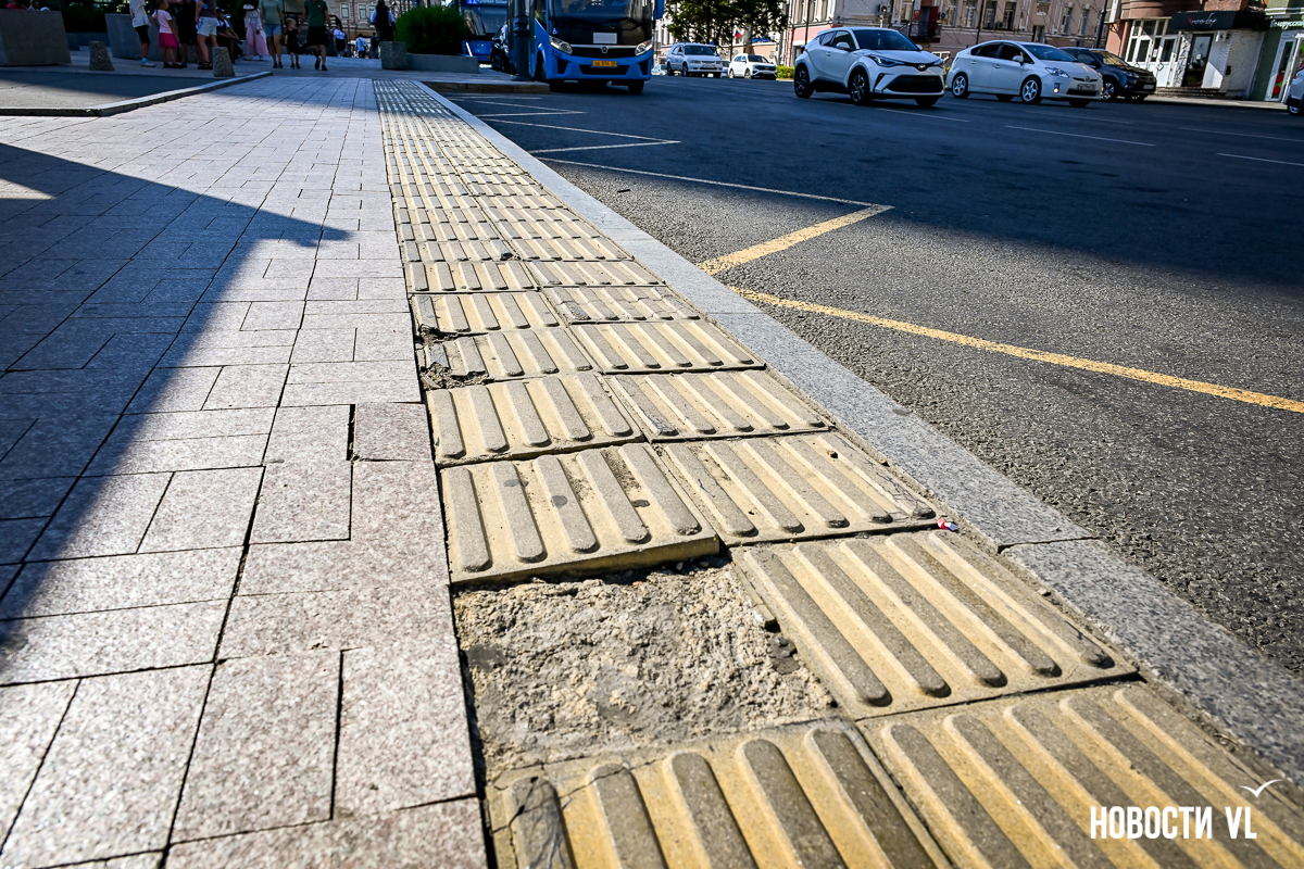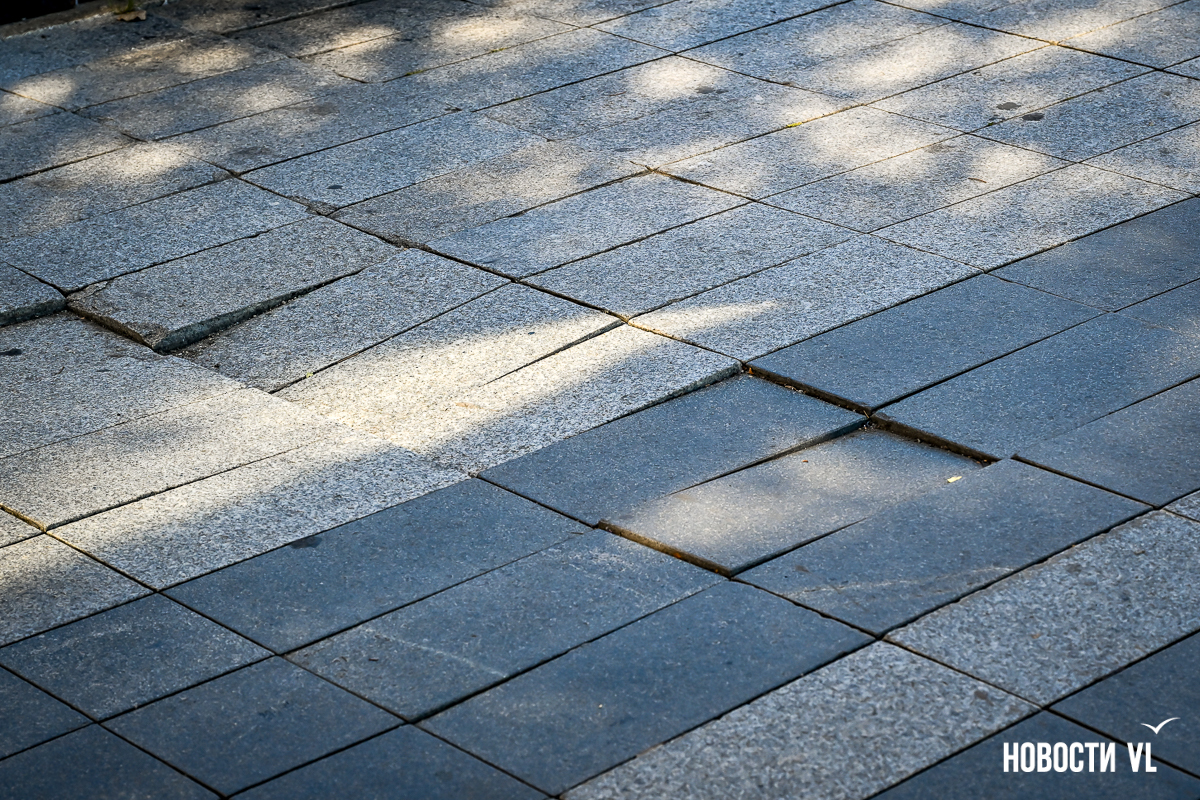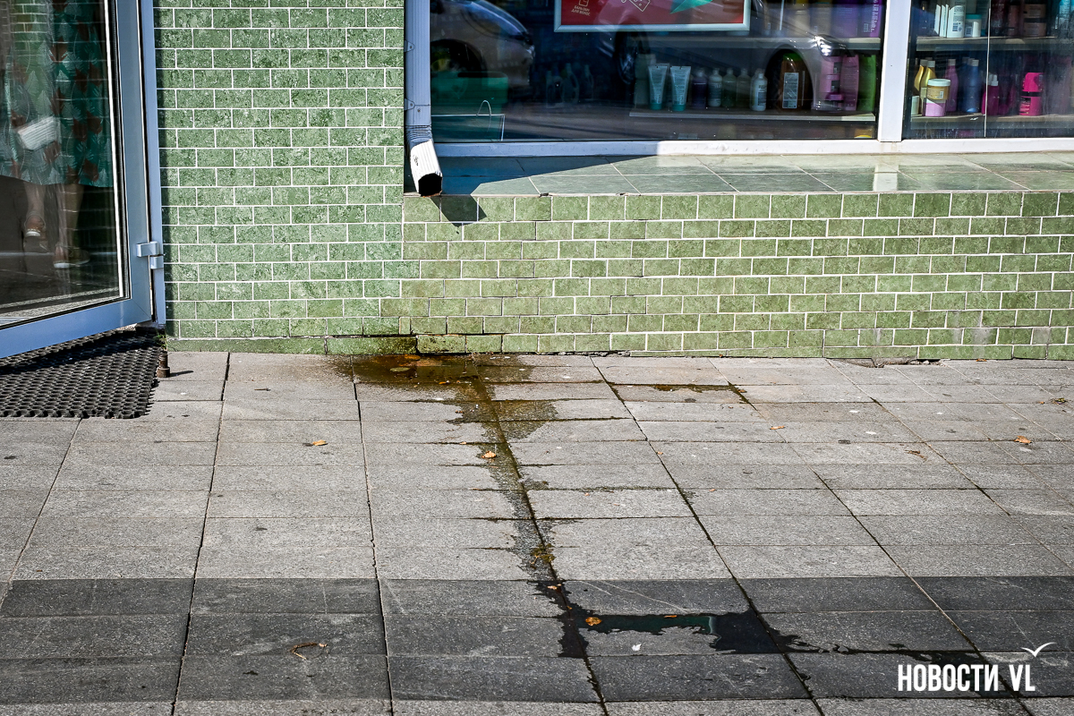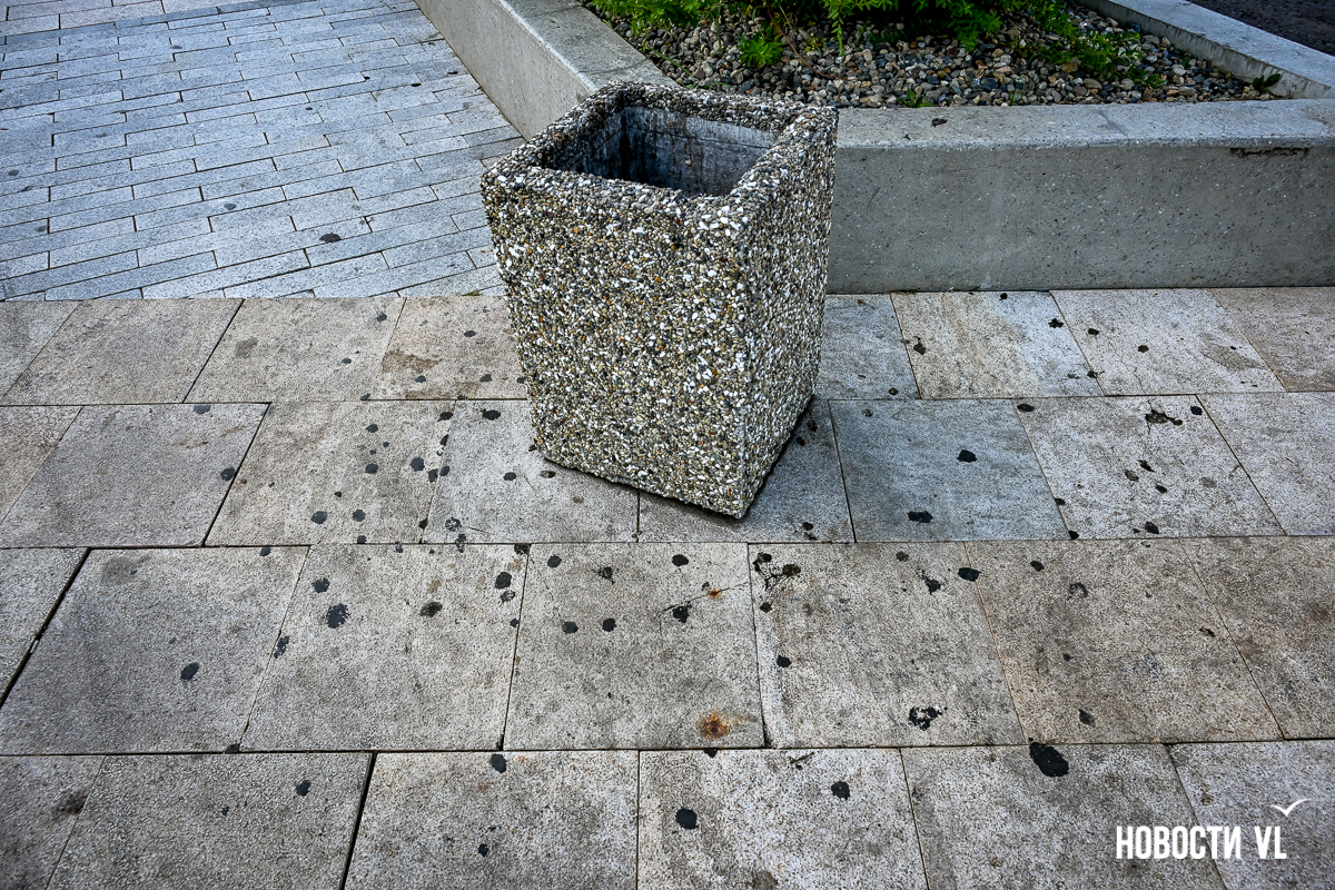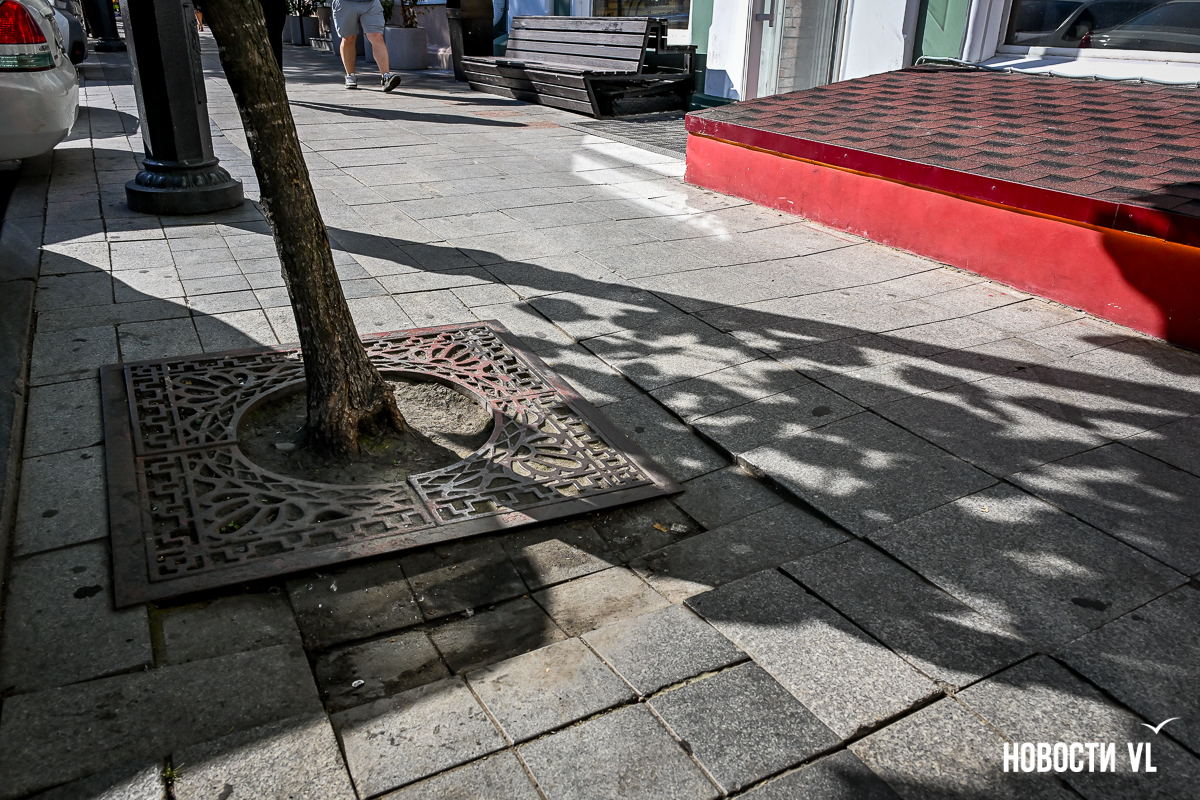 Вода, капающая со зданий, декоративных цепей и водоотливов, приносит на гранитную плитку частицы коррозии, добавляя ещё и грязно-рыжих разводов. В районе музея Арсеньева выходящих из подземного перехода встречает облезший, уже почти невидимый пешеходный переход. Бело-жёлтая краска ещё угадывается там, где машины не ездят. Но в полосе для движения от неё ничего не осталось.