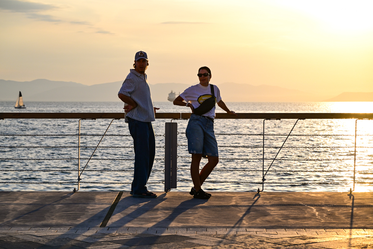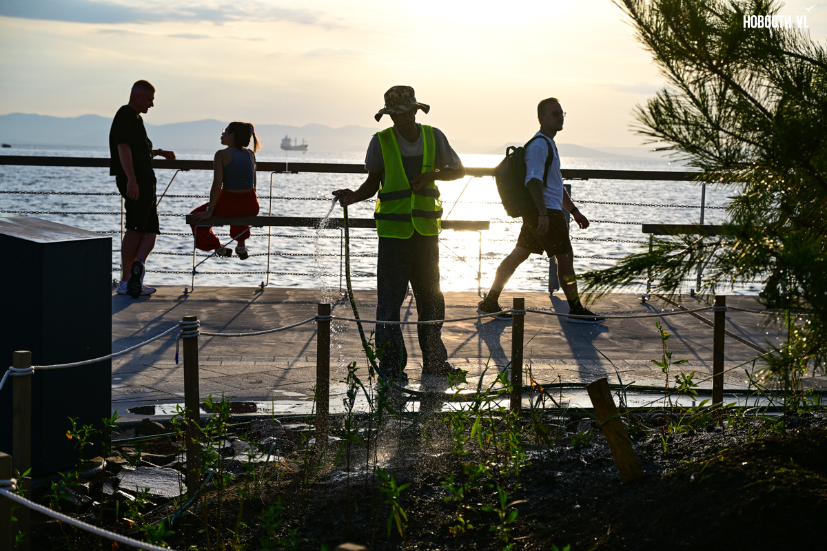 Кроме прочего, на набережной обновили ограждения, которые отделяют прогулочную зону от моря. Вместо глухих бетонных плит установили металлические цепочки и деревянные перила, и на закате набережная буквально сияет от солнца и бликов света на воде. Обновлённые ограждения почти невидимы и не перекрывают красивый вид на закатное море. Прогуливающиеся горожане останавливаются около них, делают фото на фоне заката, или напротив, на лавочках.