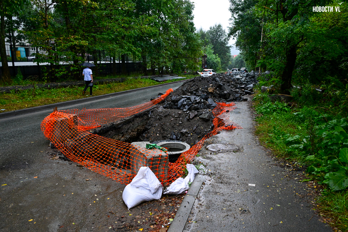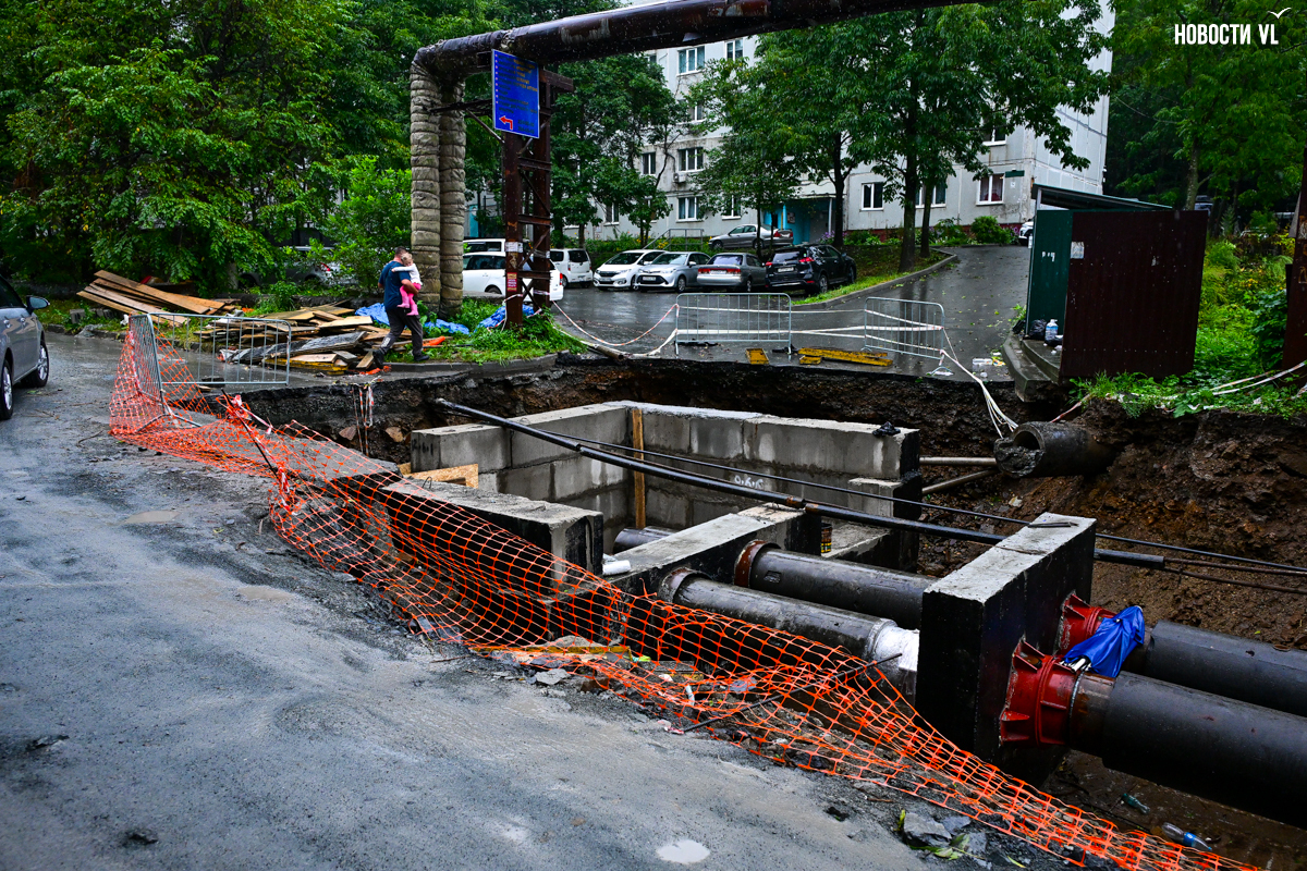 На участке совместно выполняют работы Примводоканал и ВПЭС. Замену линии водопровода закончили ещё в июле, дело осталось за теплосетями. По срокам – обещают закончить только в октябре.